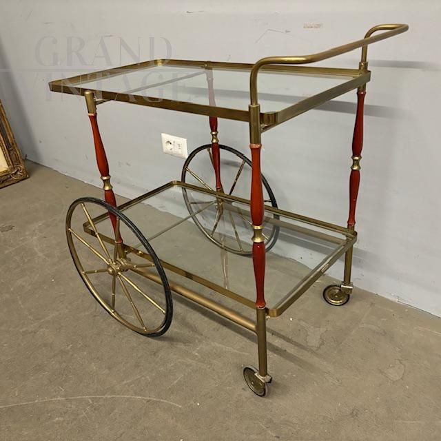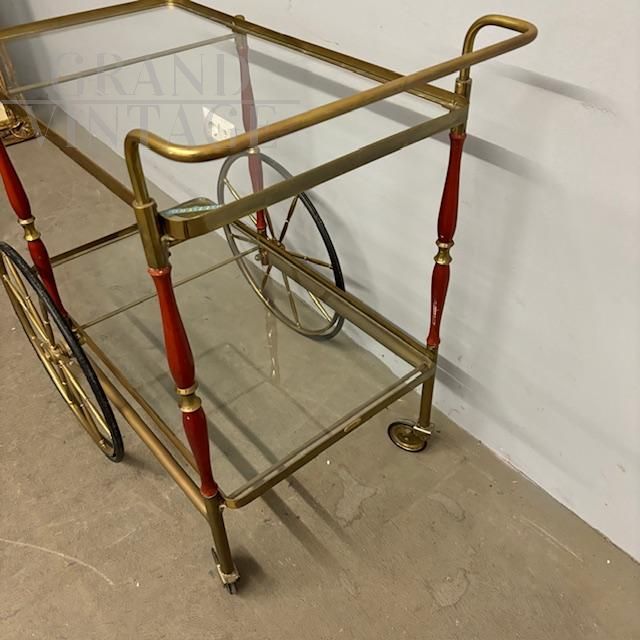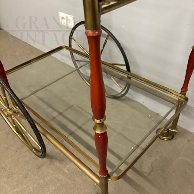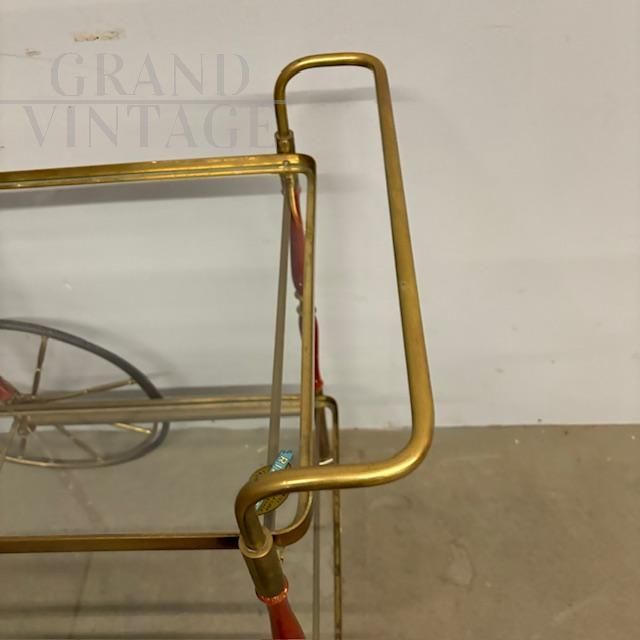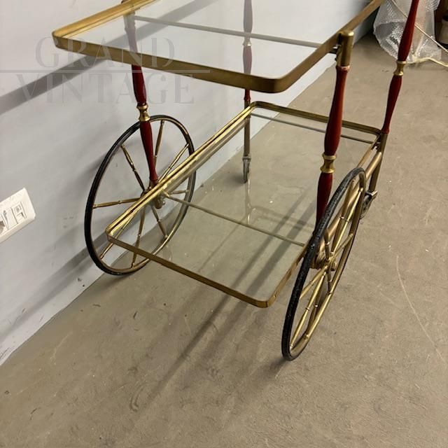 Cesare Lacca serving trolley in brass, glass and burgundy lacquered wood