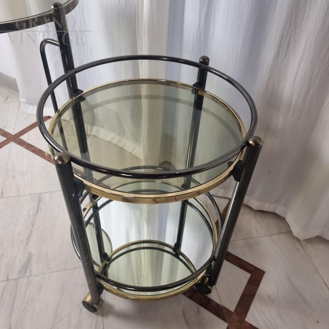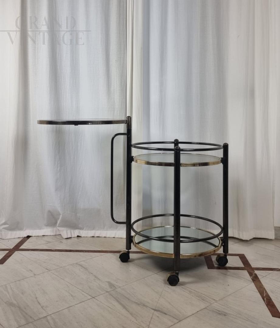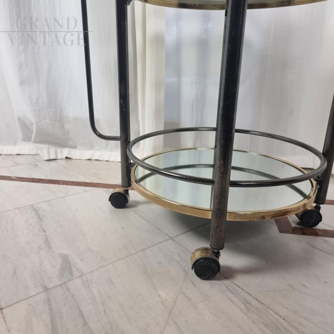 Hollywood Regency vintage bar trolley, 1960s, with brass structure and three shelves in mirror and glass. The lower surface is mirrored and is complete with a bottle holder railing, the central top is in glass and also has a bottle holder rail. The upper top is made of glass and can be directed, therefore it can be used as a coffee table. The condition is very good, the vintage item has no defects but may show slight traces of wear.