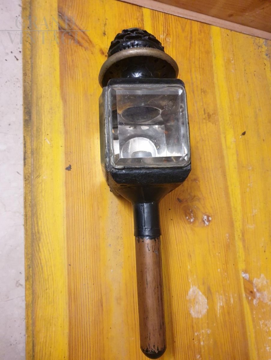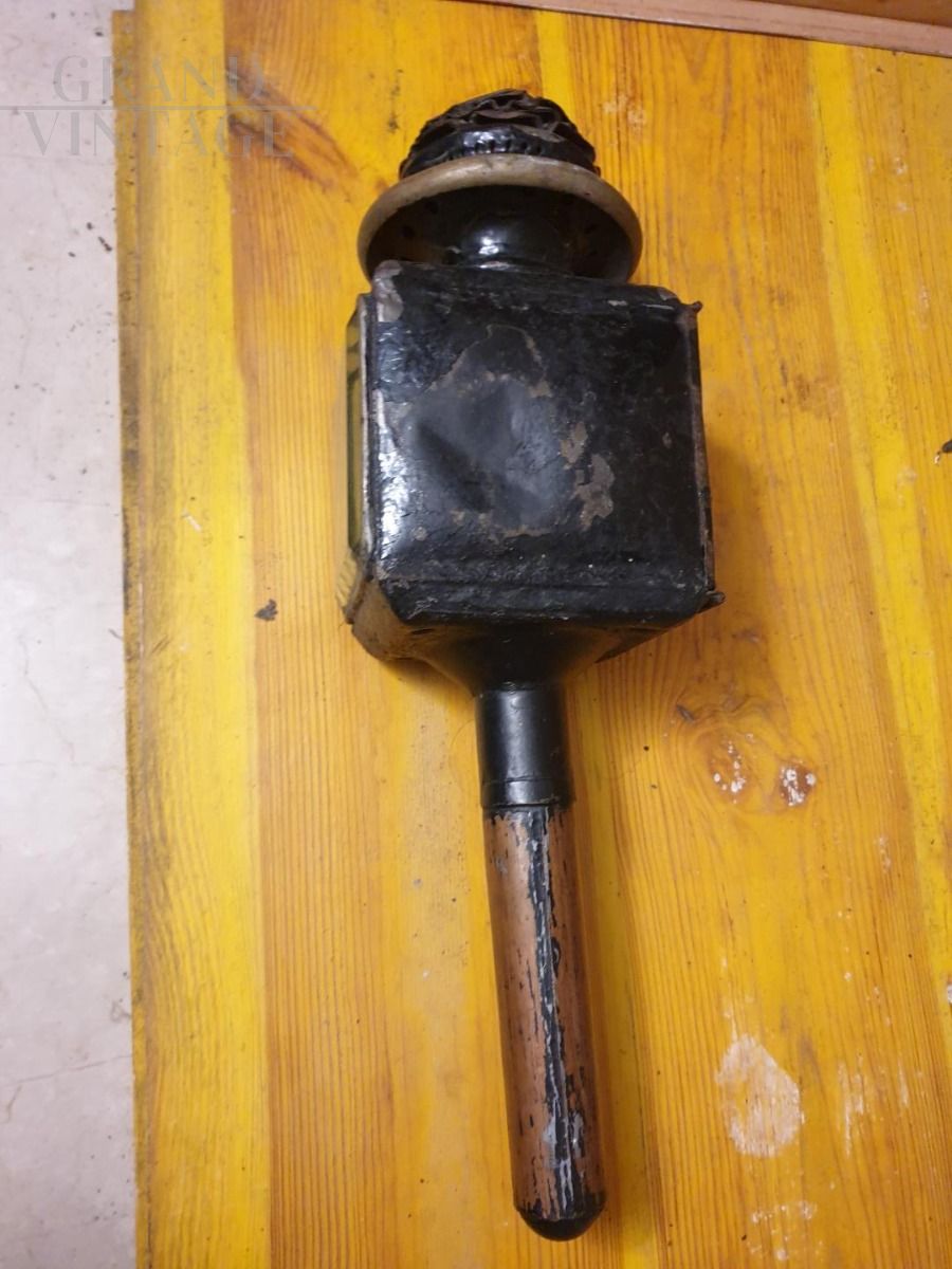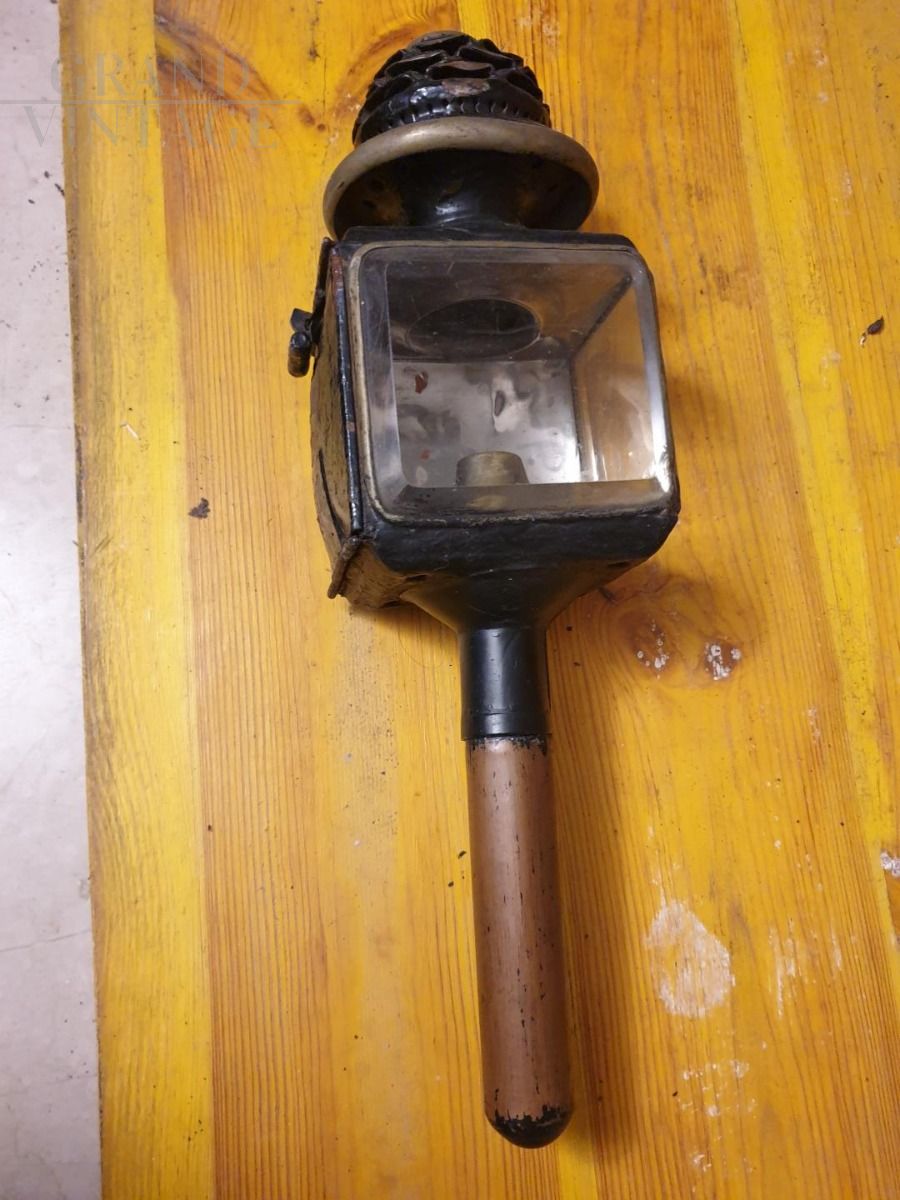 Square-bodied lamp for public service carriages, driven by coachmen, such as "milord" and "landau". It is equipped with an opening door and two side glass windows. The barrel is removable and inside there is a spring where the candle is inserted.