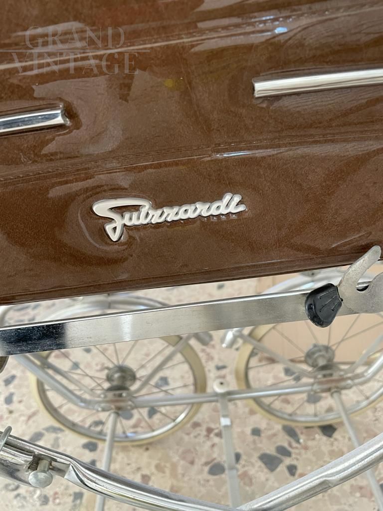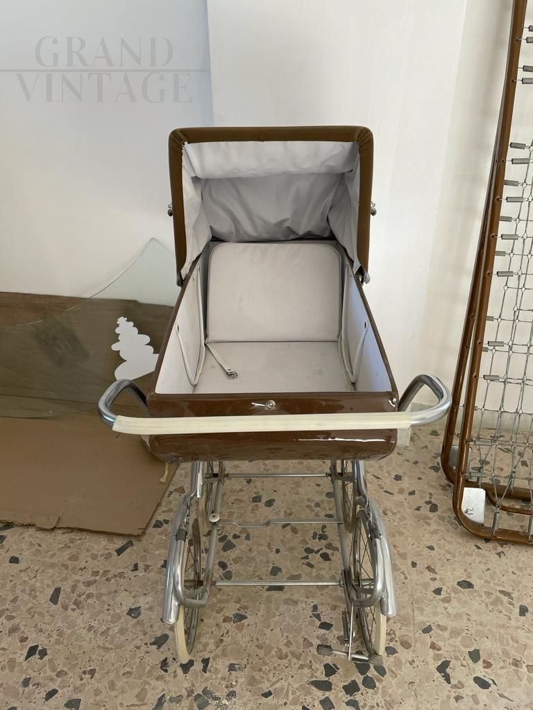Vintage pram stroller from 1959, Italian Guizzardi brand, in brown color, fully functional and maintained in the original chrome and vinyl, beautiful vintage and alternative object for the baby's bedroom. The wheelchair has been cleaned and sanitized, it is intact, only missing its baby blanket.