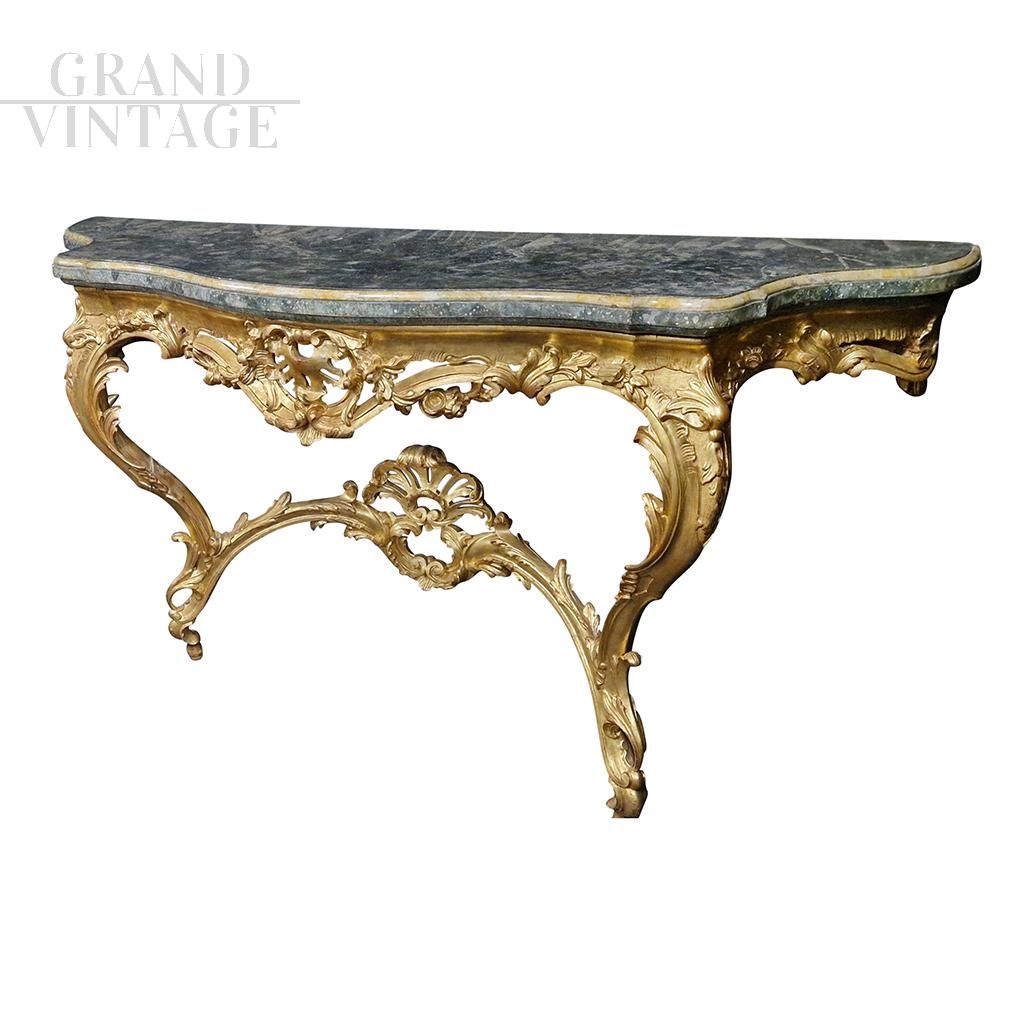 Wall console in Louis XV style, richly inlaid and gilded wooden structure, lacquered wood top imitating green alpine marble.