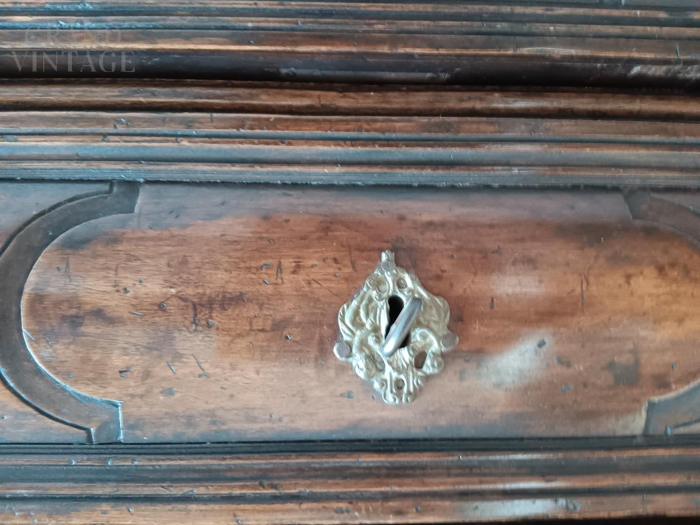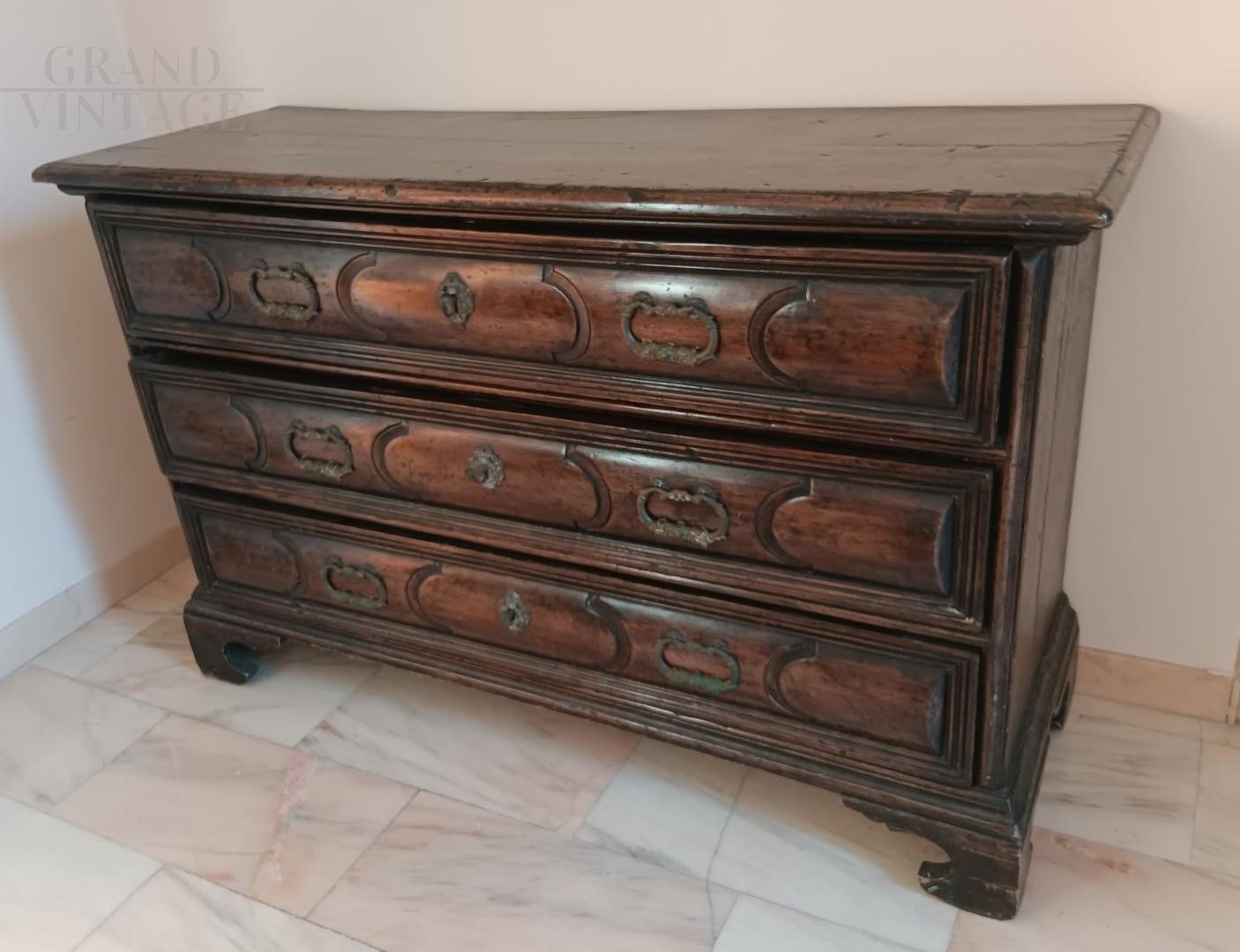Italian carved chest of drawers from the early twentieth century, shows signs of aging as shown in the photo.