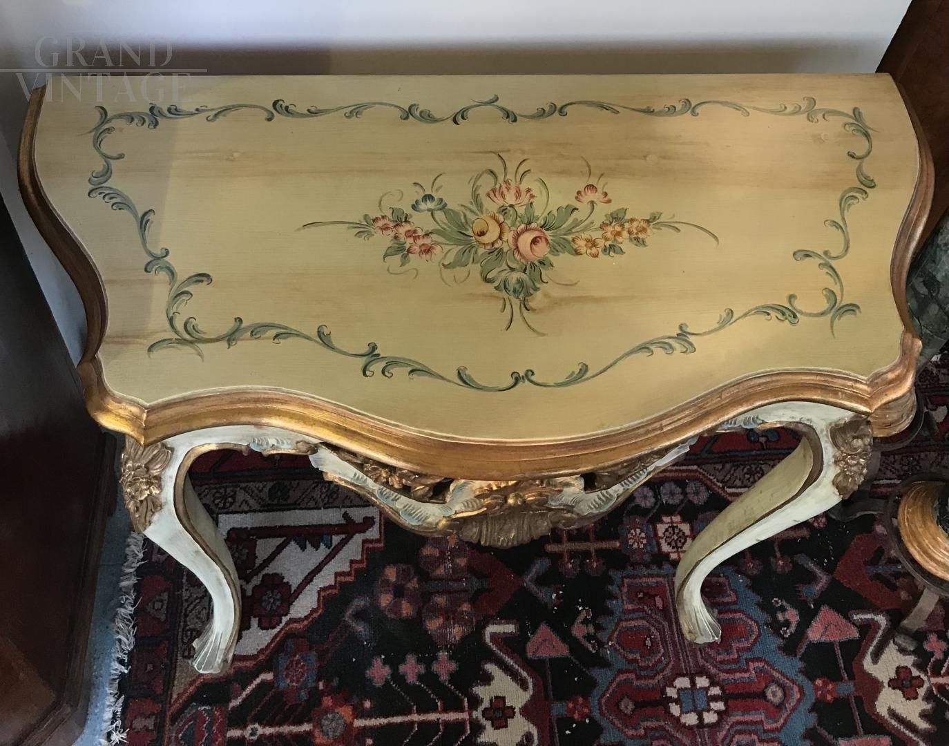 Stunning Venetian Baroque style console in hand-carved wood, entirely painted and decorated with floral motifs and gold leaf.