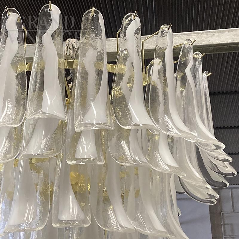 Cascade chandelier with brass structure and splendid elements in transparent and opaque white Murano glass applied in six overlapping tapered rings. The chandelier is equipped with 18 E14 bulbs divided into 3 rows of 6 lights. The 6 lights on the lower level are adjustable.