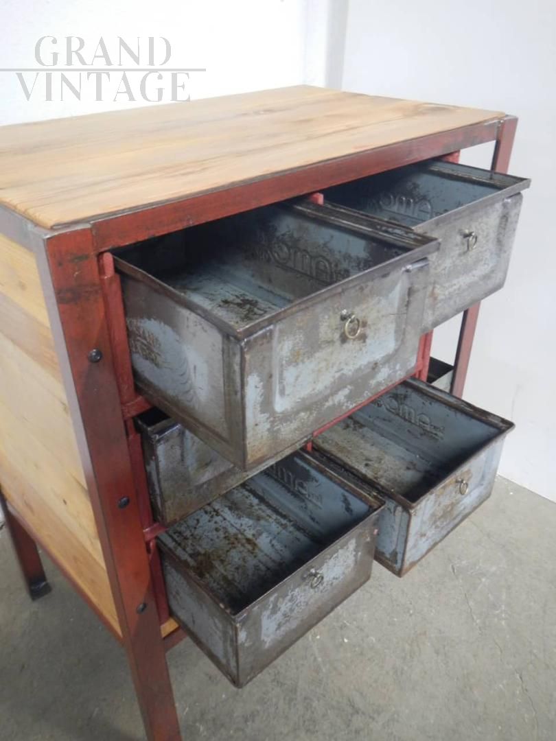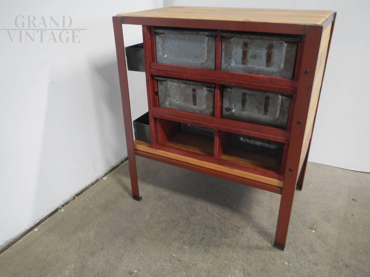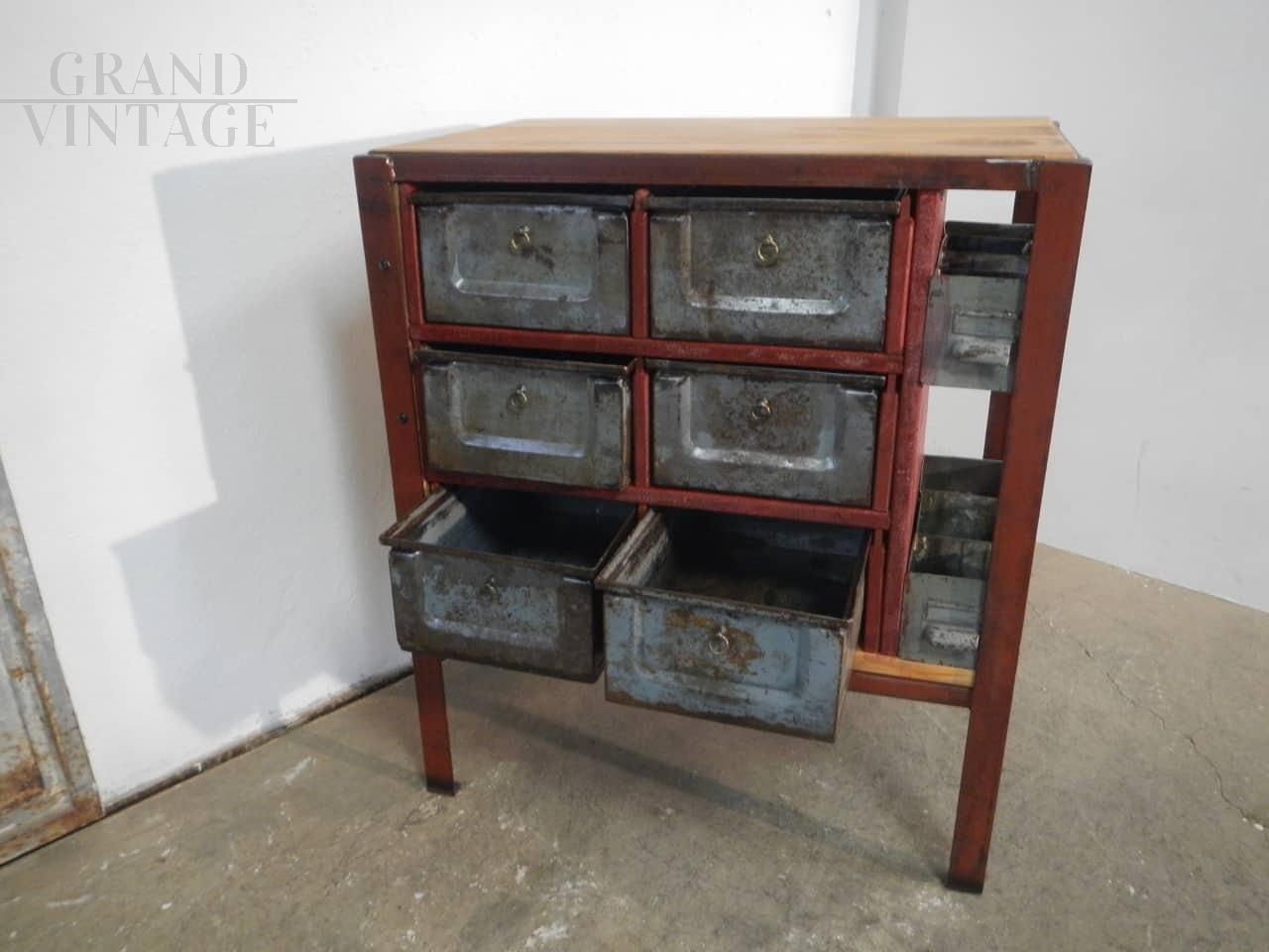 Beautiful industrial small chest of drawers for hardware, with larch wood tops, metal structure and sheet metal drawers, 1950s vintage.