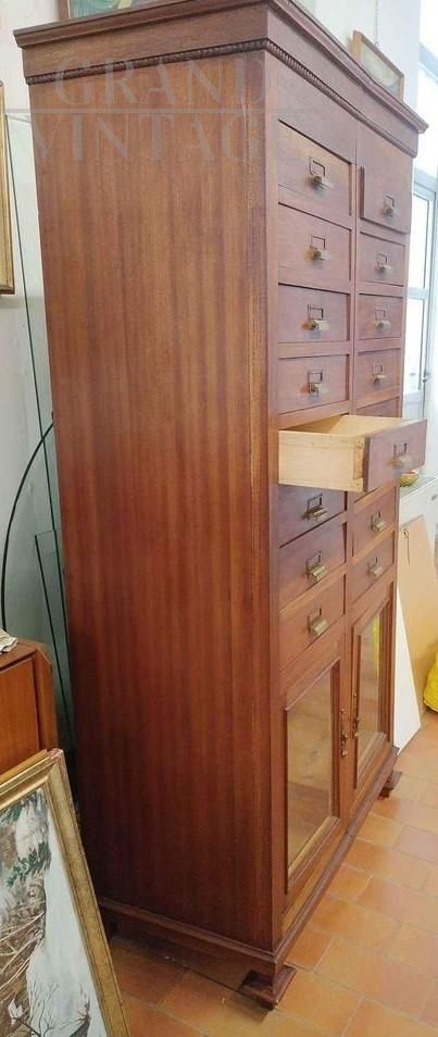 Vintage office filing cabinet from the early 20th century in wood, restored and complete with sixteen drawers and two glass doors.