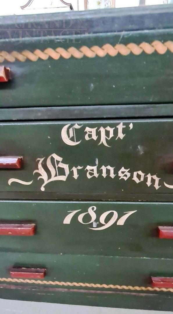 Beautiful 1900s sailor chest of drawers, all in green lacquered wood, with knot decorations and with painted sailing ship on the top, on the front it has the inscription "Capt' Branson, 1891".