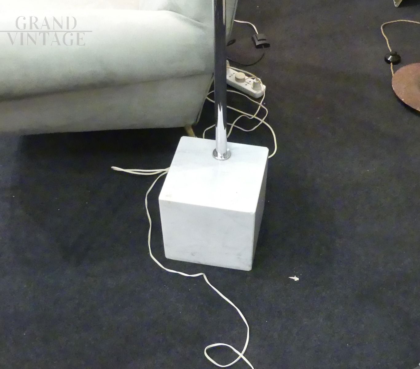 Castiglioni style arched floor lamp, Italy 70s, with steel structure, steel lampshade with white lacquered interior and classic holes in the upper part, white marble base.