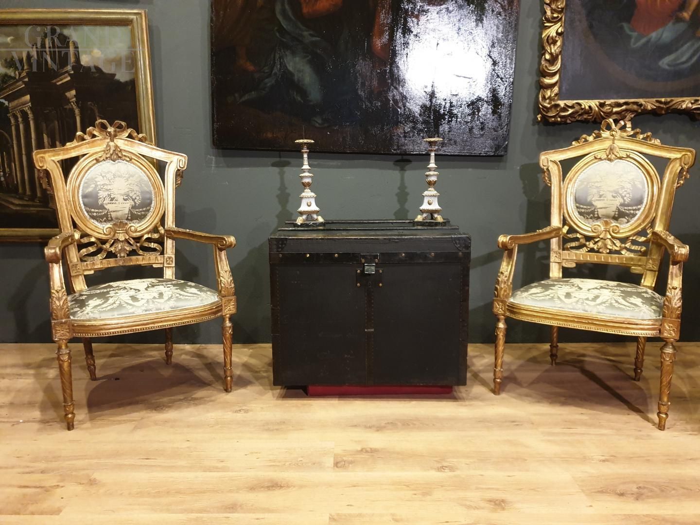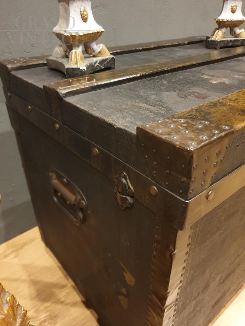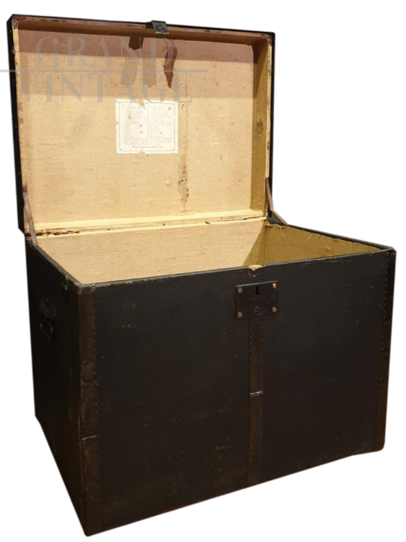 Antique chest or trunk supplied to a cavalry department of the Second World War, in wood covered with a canvas, the front has the original lock with brass inserts, particular metal edges, also original. Inside there is a rare and unusual paper stamp where the entire inventory is written in the German and French languages, original from 1913. The trunk is still in good general condition for the period, it has some right signs of aging and it has undergone some minor restorations over time.