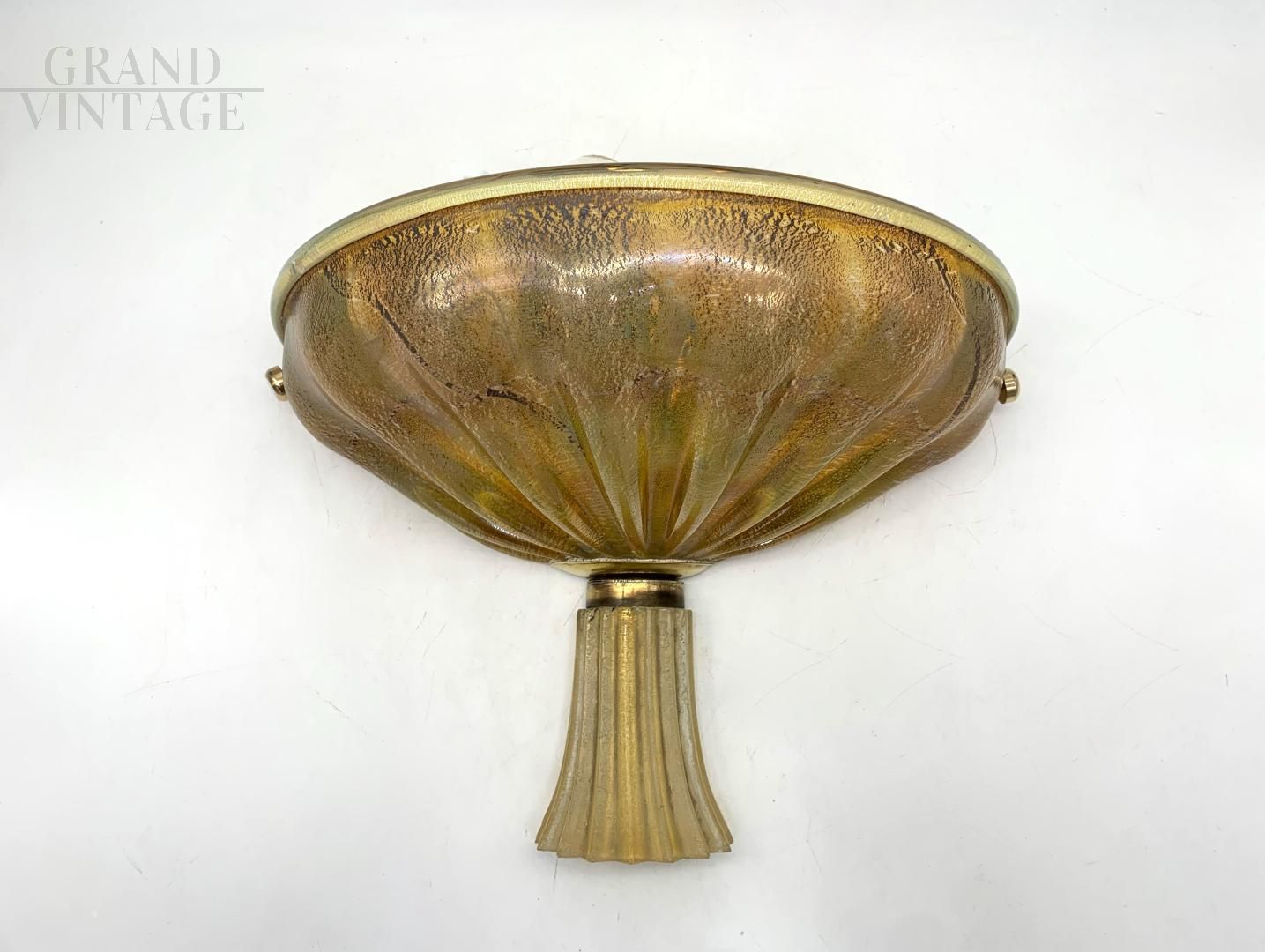 The glass is very particular, the wall light both on and off is spectacular. In excellent condition, the glass is intact and not cracked and the brass and iron supporting structure has been painted white. The lamp has 3 sockets for E14 ceramic bulbs. Few signs of aging on the structure.