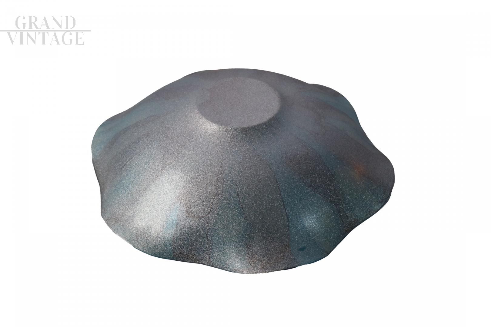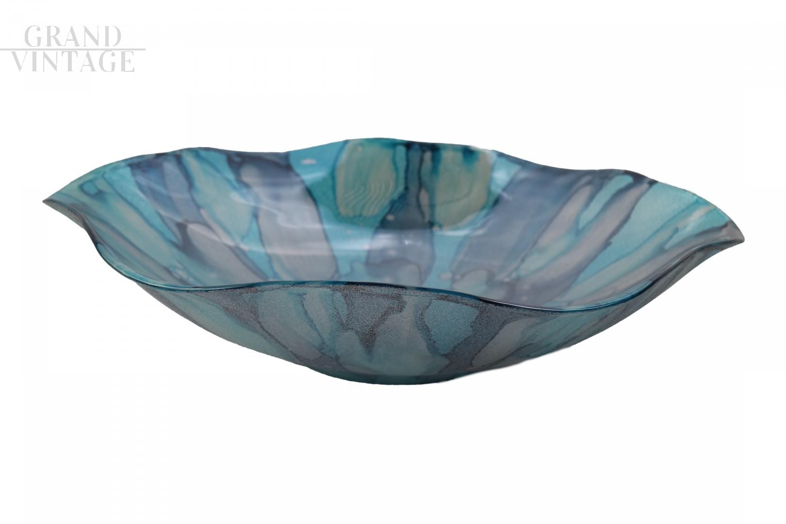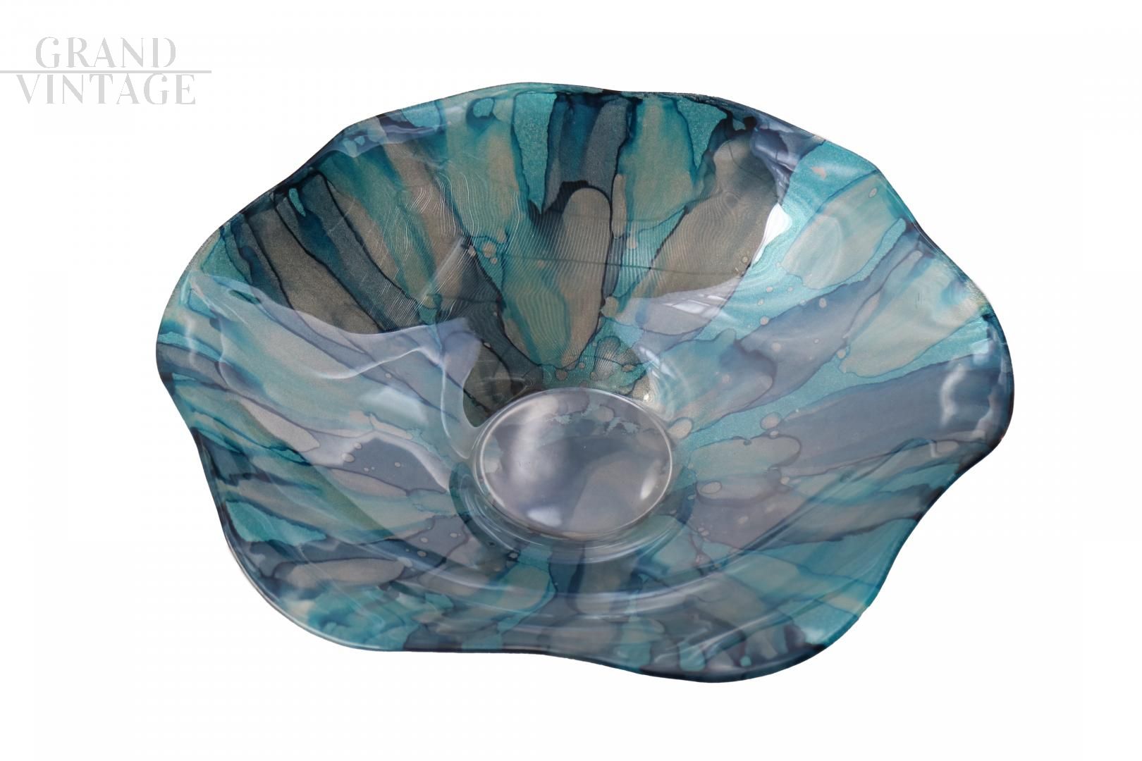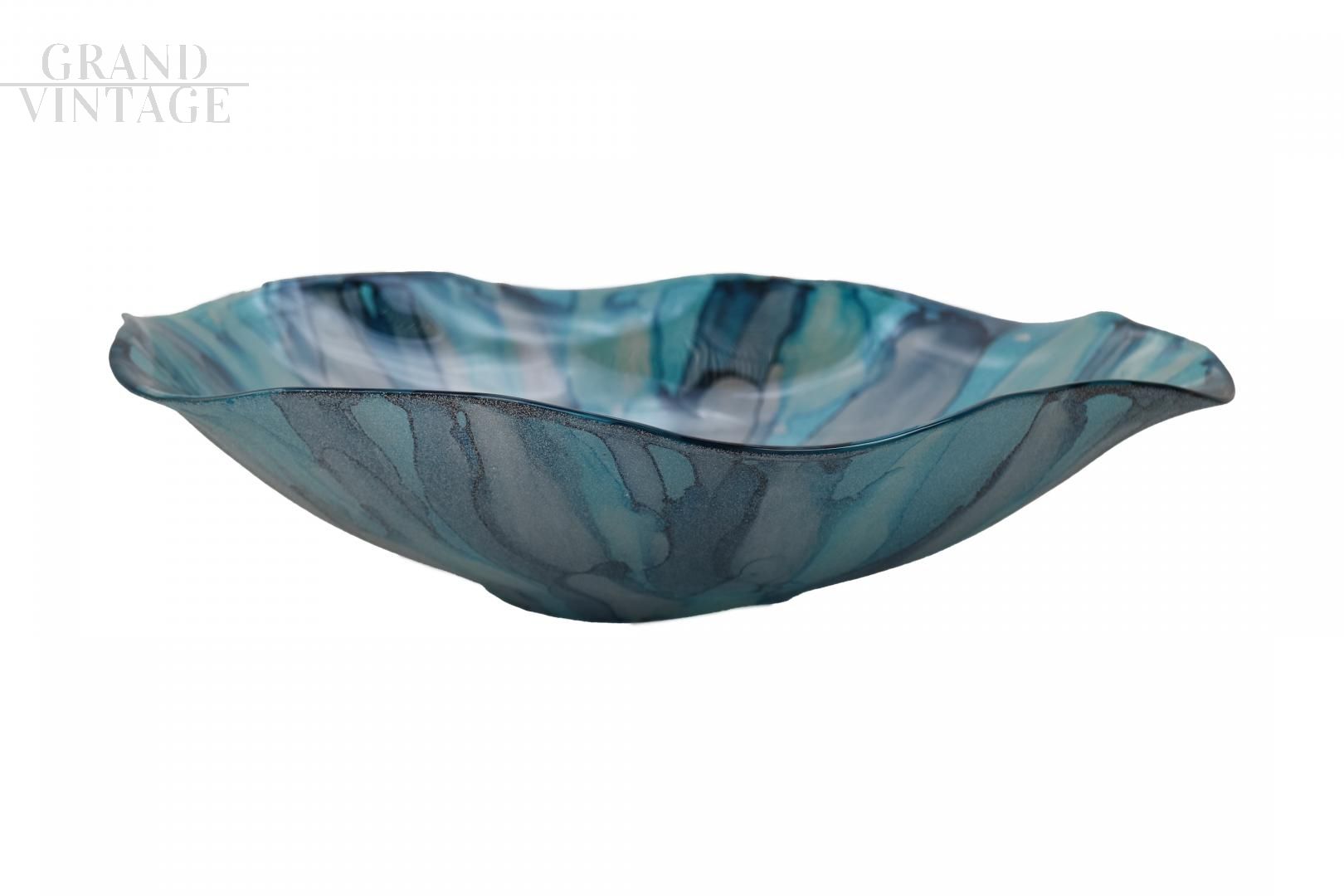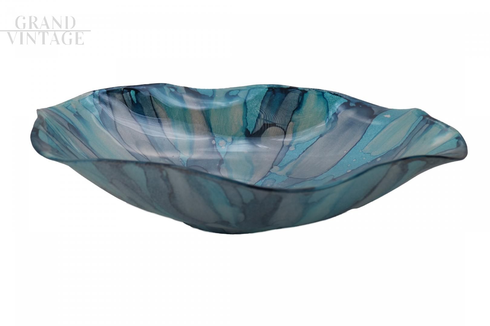 Handcrafted glass centerpiece or fruit bowl in the shape of a leaf with polychrome decorations.