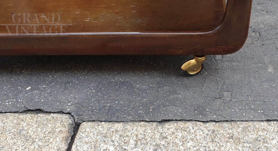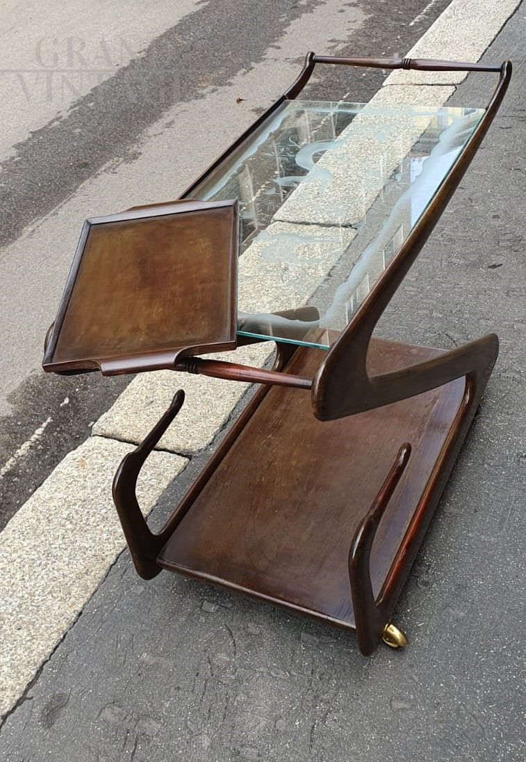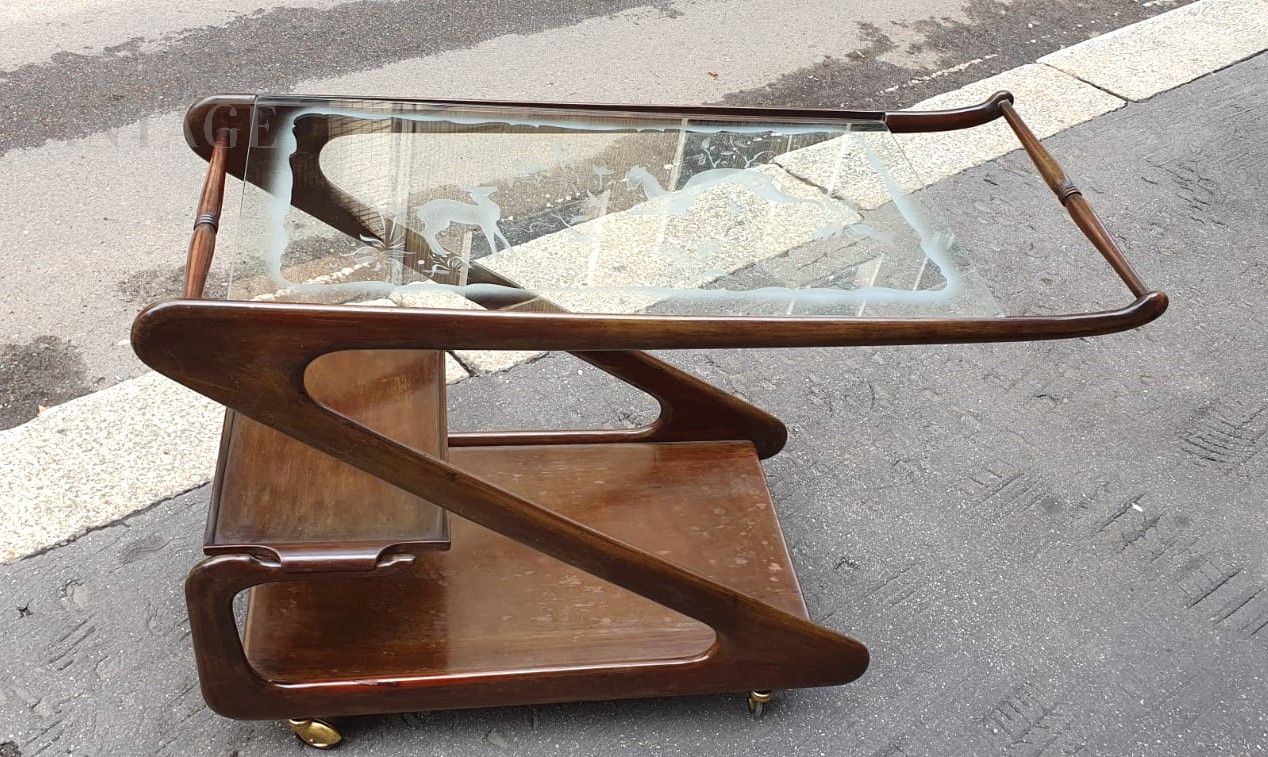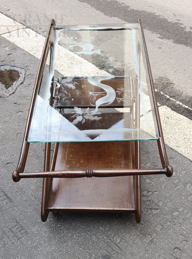 Italian mid-century trolley by Cesare Lacca with wooden structure and original silk-screened glass top decorated with flora and fauna, brass details and removable tray. A rare piece of furniture of great effect and elegance.