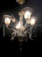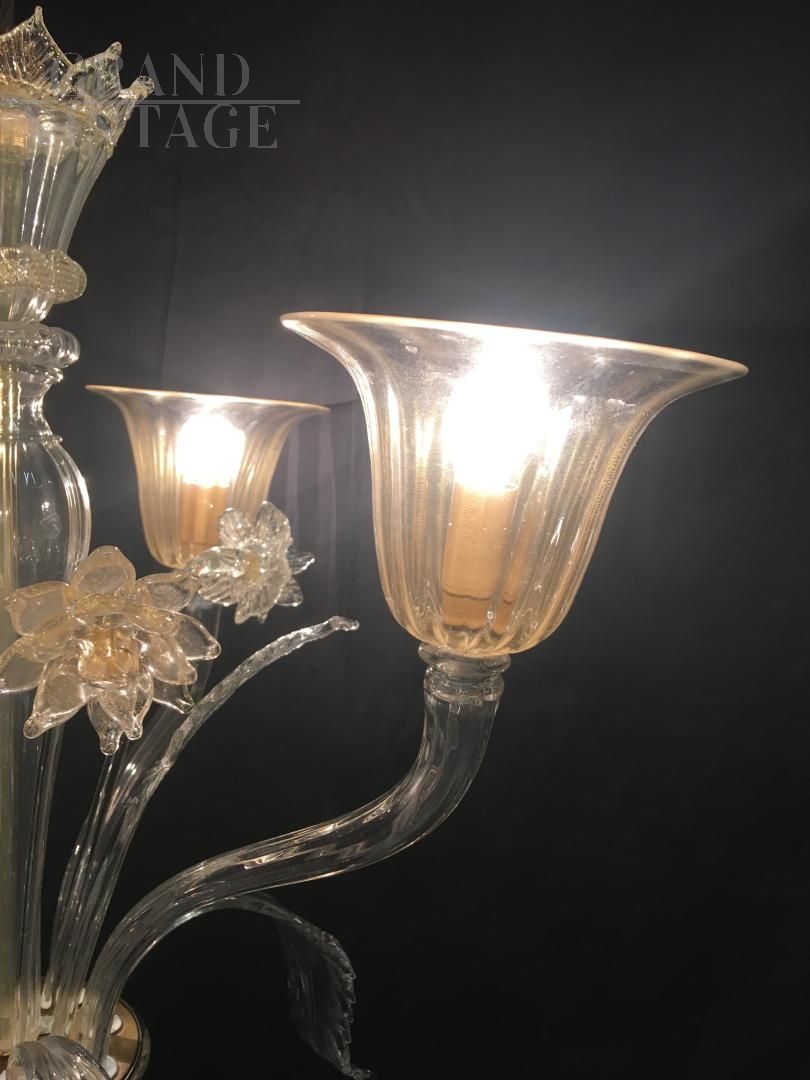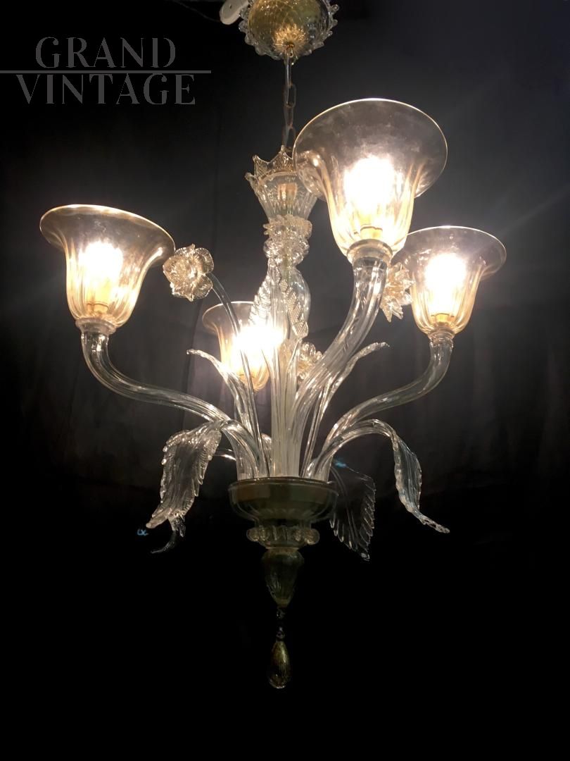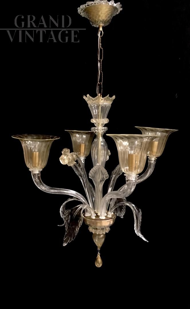 Chandelier by the Cesare Toso company in transparent gold Murano glass, very spectacular, a rarity considering the excellent condition. The chandelier is functional and has 4 sockets for E14 bulbs, also suitable for the use of LED bulbs. It has few natural signs of ageing, the windows are not cracked, the electrical system has been redone. It will be disassembled for ease of transport. Great piece of design to illuminate several rooms, does not glare if milky white bulbs are used.