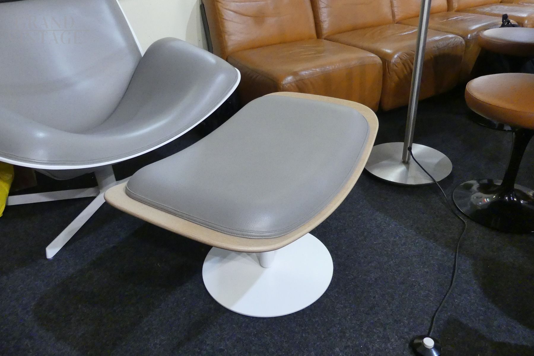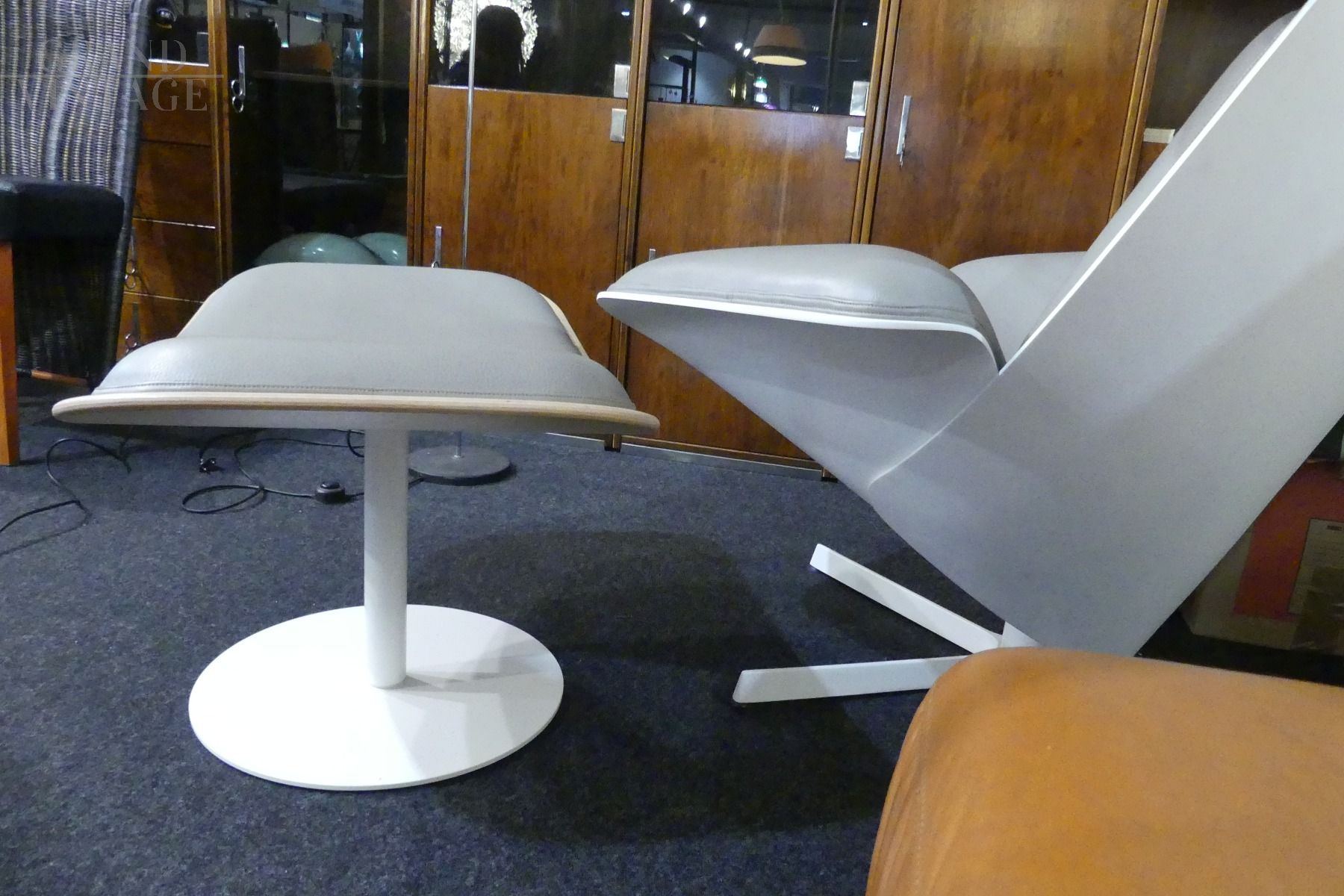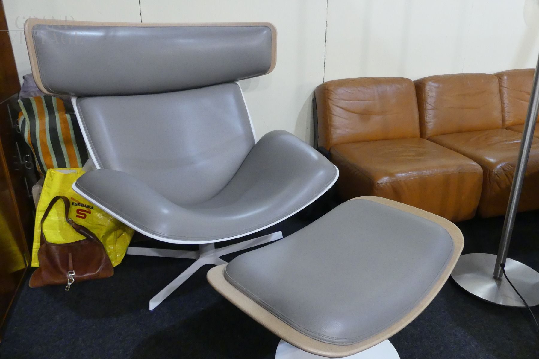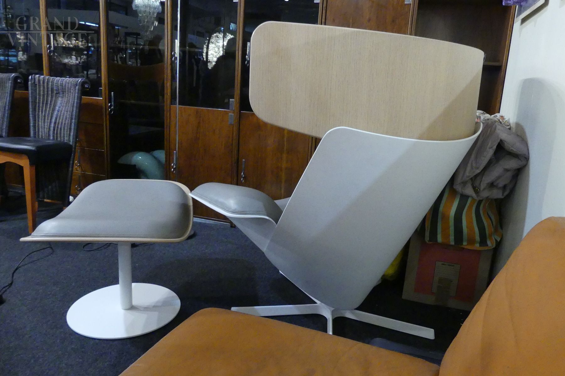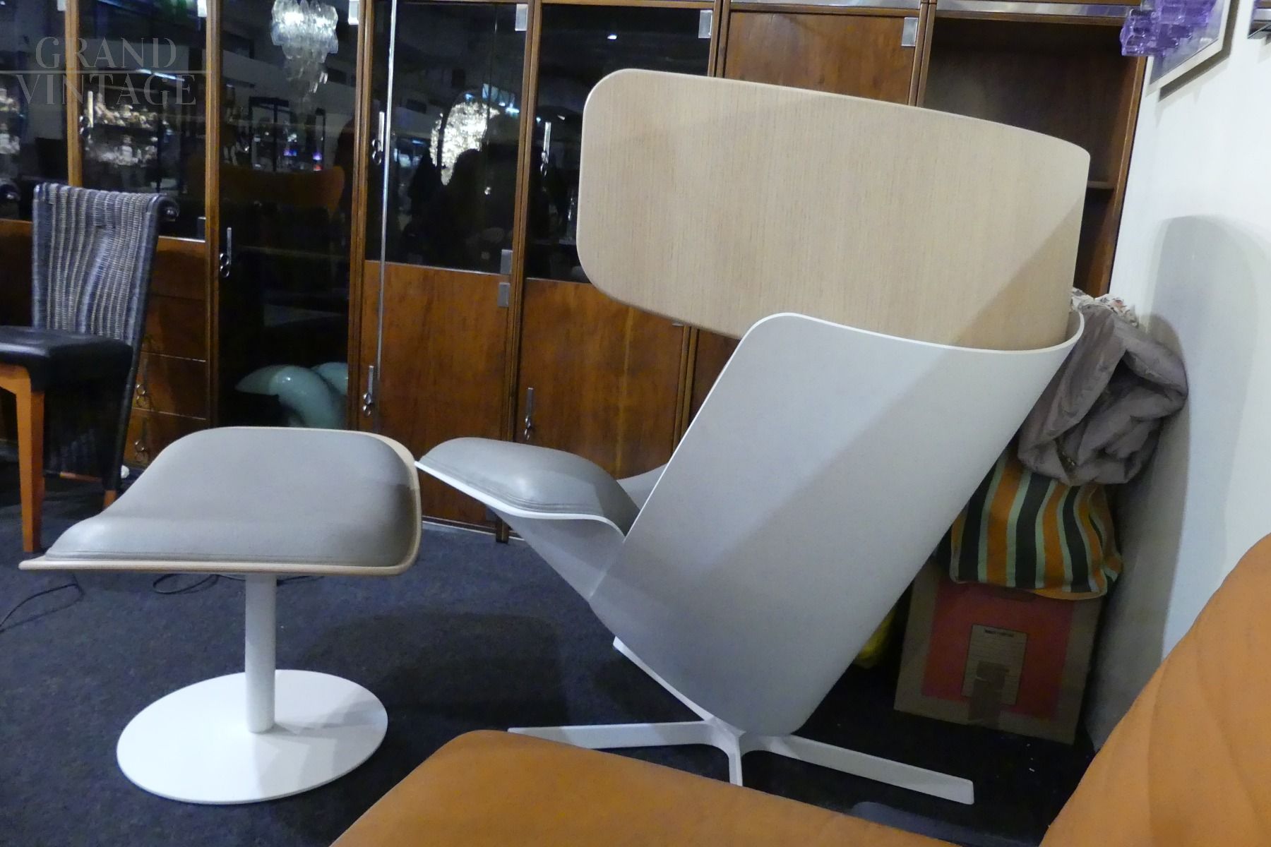 Beautiful chaise longue armchair with pouf design by B&B Italia in beige - dove gray leather, with structure entirely in wood, partly in natural wood and partly in white lacquered wood, only the foot is in white lacquered iron. The armchair is very comfortable, well padded and with a soft and enveloping headrest. In excellent condition!