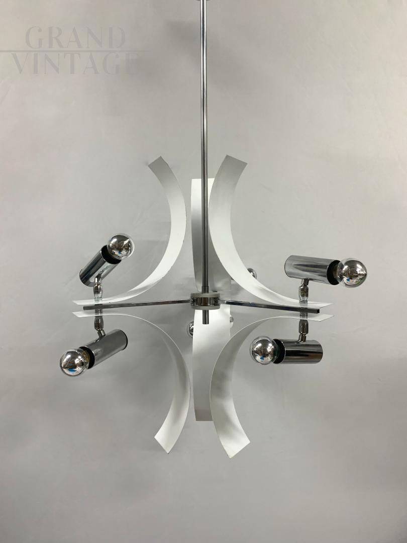 Fantastic and rare vintage chandelier attributed to the Reggiani company with chromed and white lacquered iron structure with adjustable spotlights, Italy, 1970s. The chandelier has some signs of aging on the chrome and the original white paint. It is a rare and very particular piece. LED bulbs with chrome plating are recommended, the light points are adjustable and have connections for E14 type bulbs, the electrical system has been newly redone. Excellent element that can illuminate different rooms: from the kitchen to the living room, from the entrance to the bedroom and the bathroom.