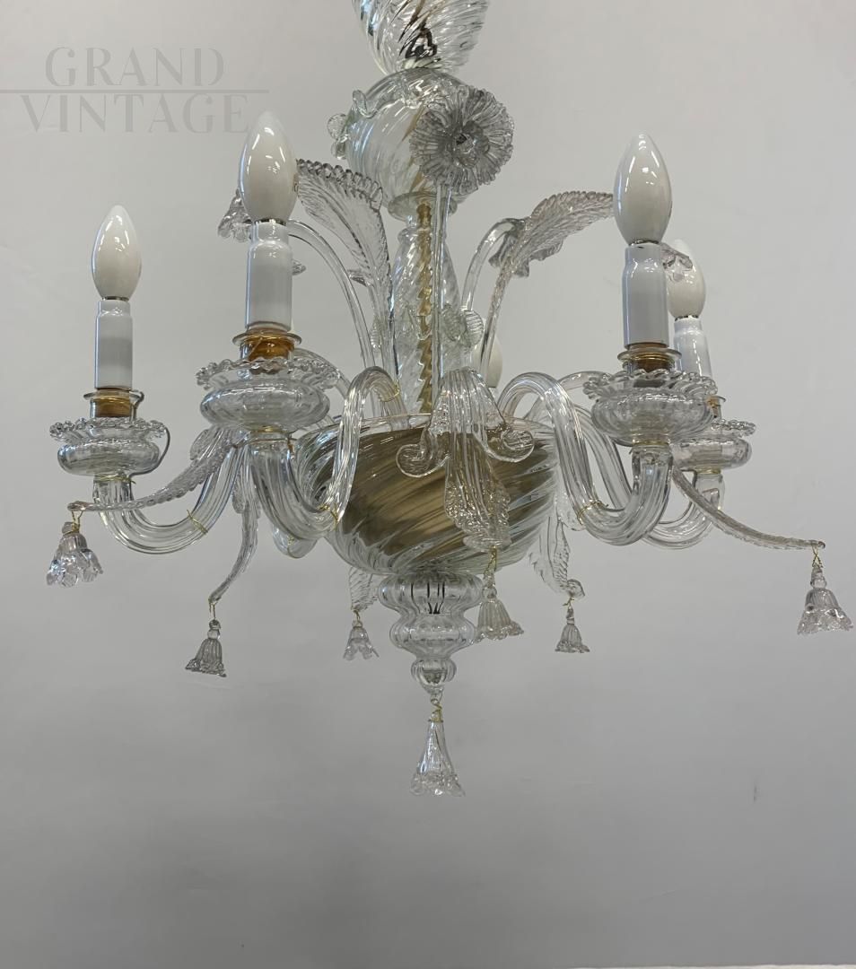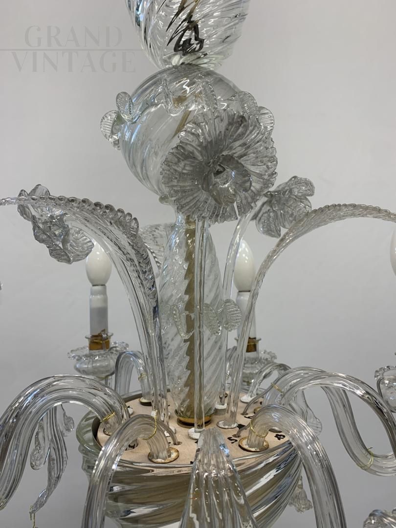 Elegant Art Deco Murano chandelier from the 1940s attributed to Seguso with new internal base in wood and metal covered with wonderful hand-crafted transparent Murano glass, characterized by 6 arms with 6 light points with original hand-crafted glass candle bulb holders , deliberately maintained and serviced, decorated with finely crafted leaves. The chandelier is in excellent condition, completely restored, with intact and uncracked but very fragile glass. The 6 light points have connections for original E14 type bulbs, overhauled and working, with new internal electrical cable. The arms and leaves are removable to facilitate safe transport.