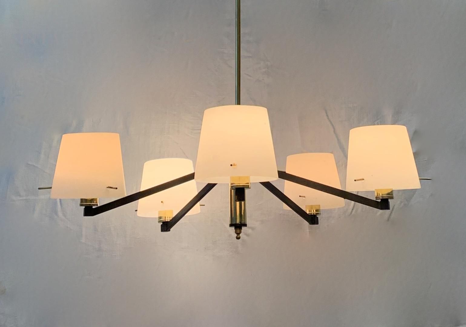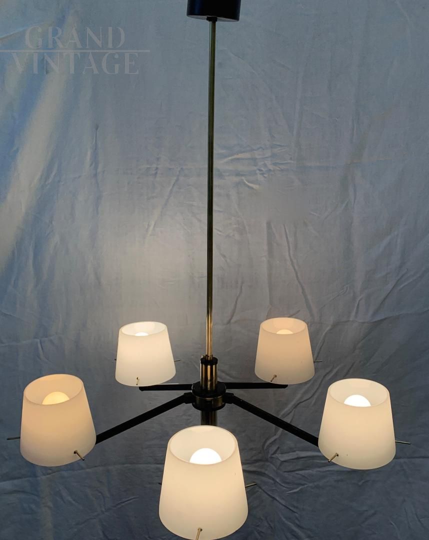 Beautiful chandelier attributable to Stilnovo, 1950s, with brass and iron structure and 5 light points with original white glasses handmade on mold. In excellent condition, the glasses are intact and not cracked, electrical system redone, suitable for LED bulbs. Great piece to illuminate different rooms, it does not dazzle if you put on milky white bulbs.