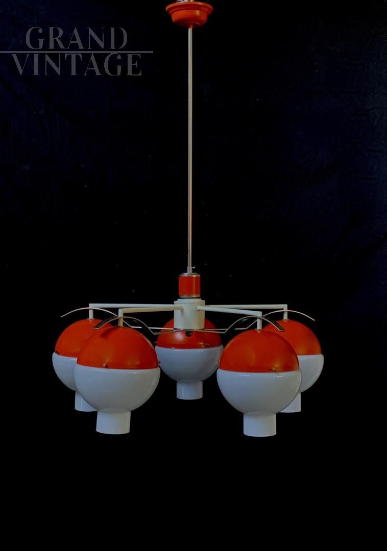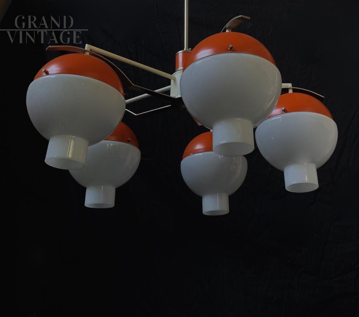 Fantastic Stilnovo style chandelier from the 1960s, all original and with electrical system redone. Attributed to the Stilnovo company, the glasses are not cracked, they are mounted on the iron structure thanks to screws, and can be dismantled for shipping.