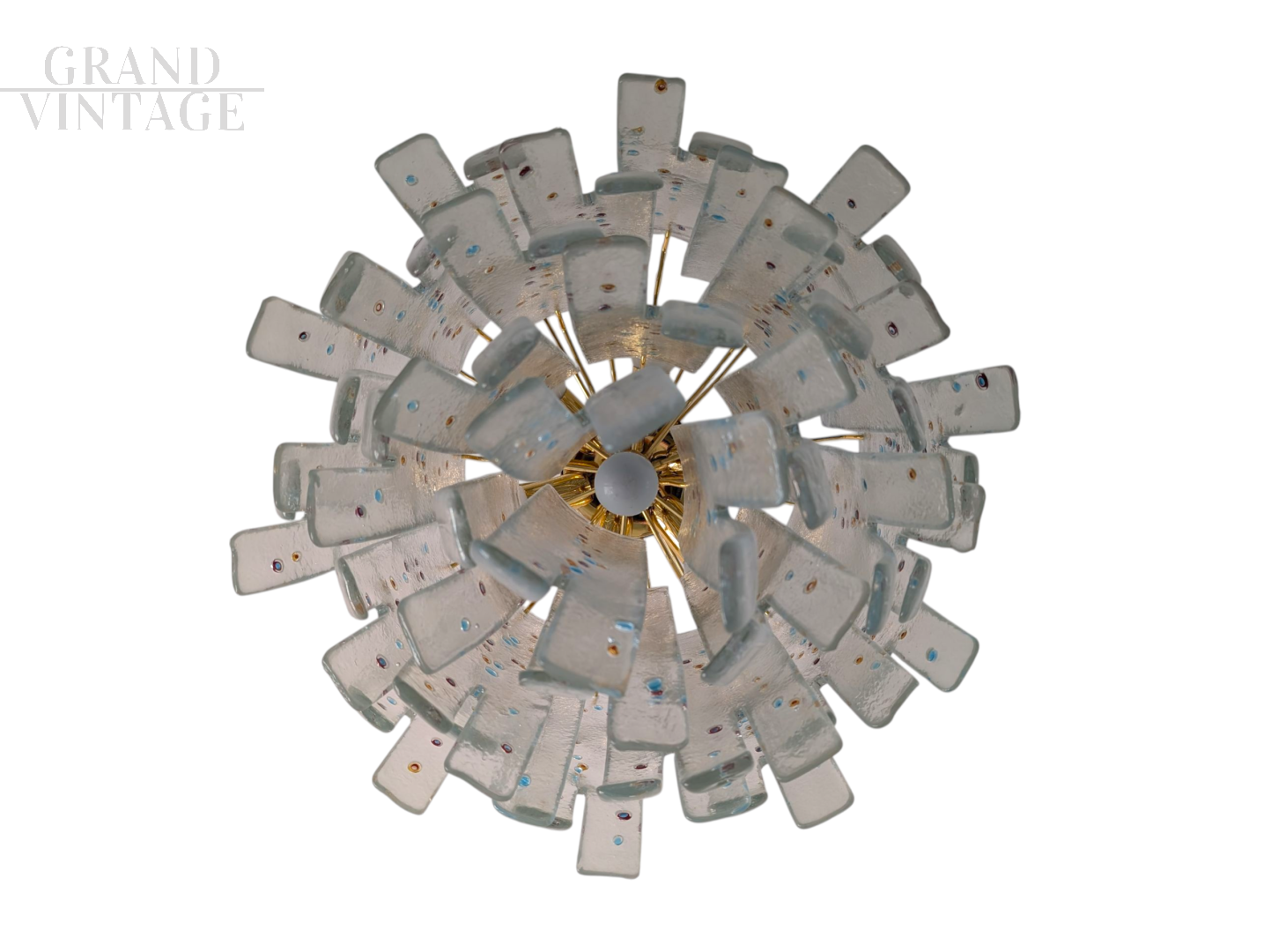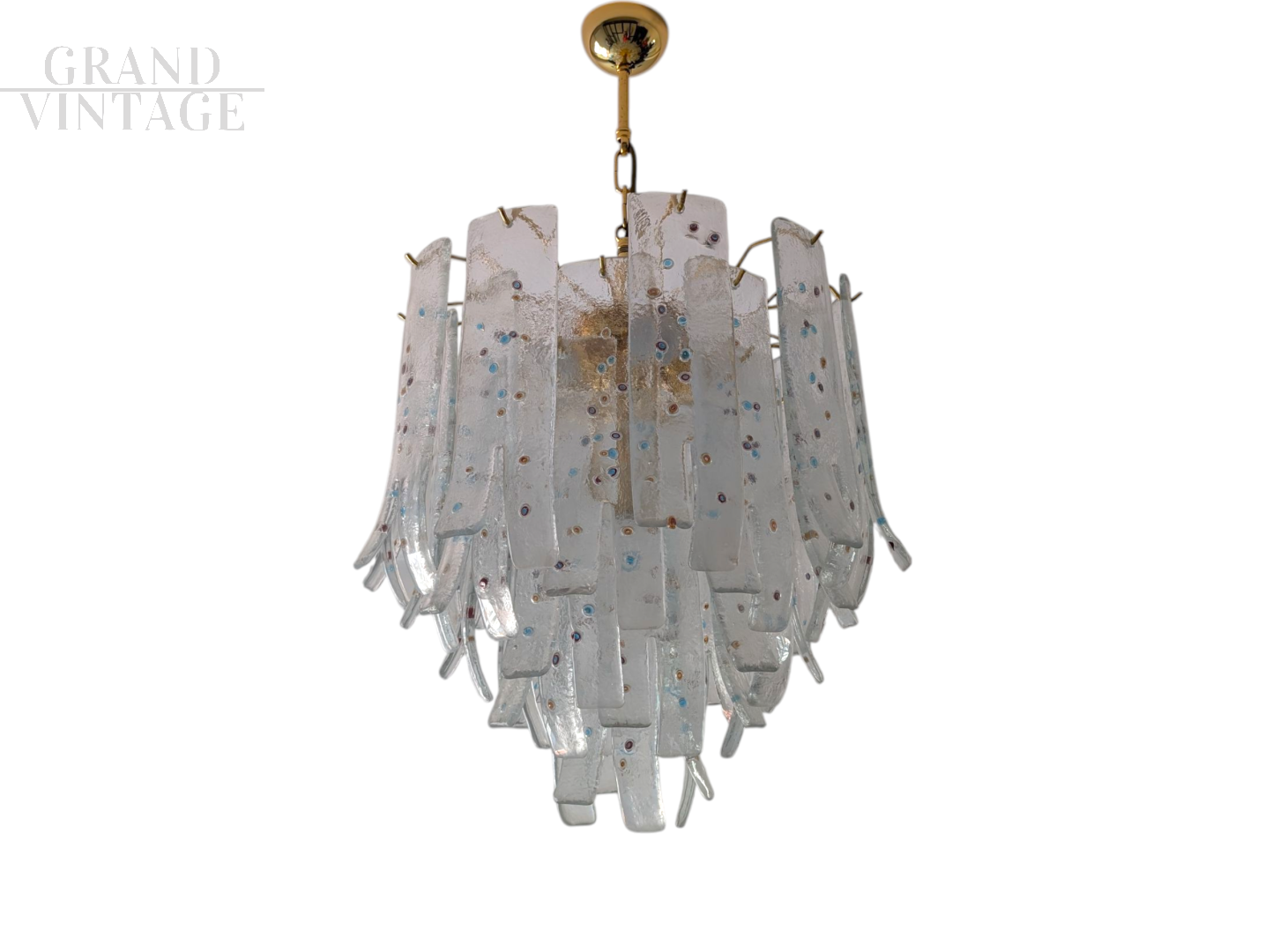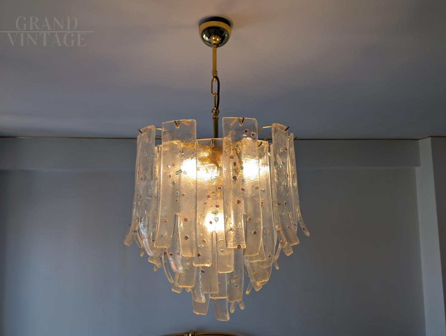This extraordinary Murano glass chandelier is an original creation by Barbini, one of the most renowned glassworks on the Venetian island. The piece stands out for its sculptural design and the expert use of clear glass decorated with multicolored murrine, which add vibrancy and uniqueness to each individual element. Composed of numerous curved glass blades, hand-shaped and arranged in multiple layers, this chandelier creates a dynamic and sophisticated visual effect, reminiscent of a cascade of petals or foliage. The murrine embedded within the glass provide light and color in a delicate and refined way, creating evocative reflections whether the lamp is turned on or off. Overall condition: excellent!
