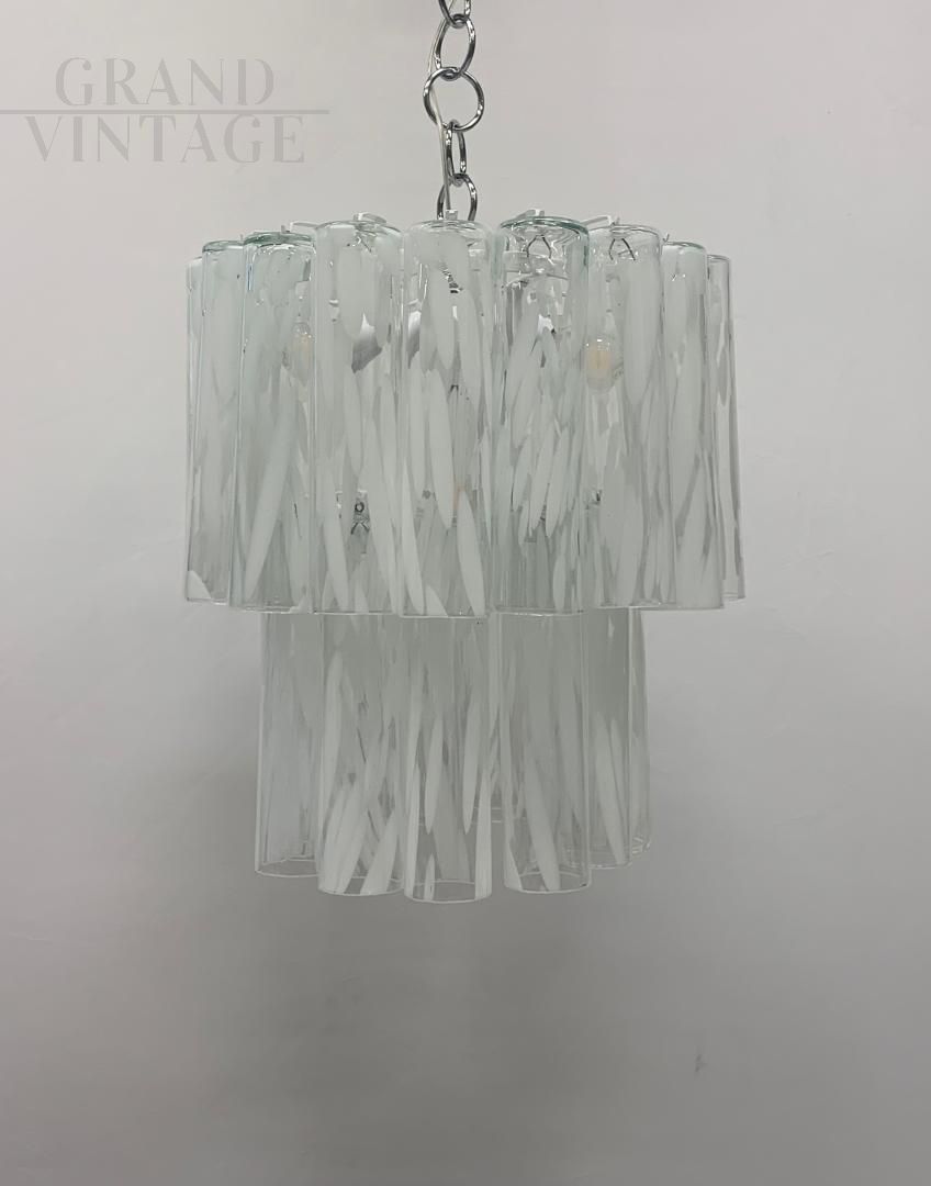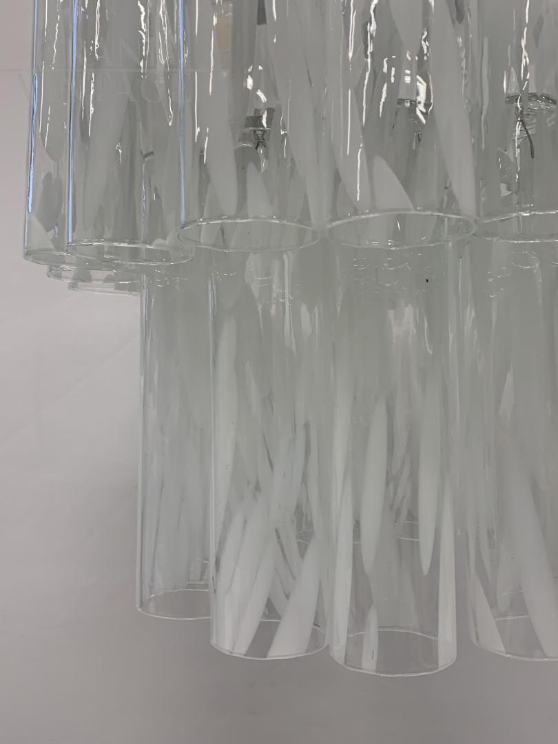 Fantastic large cascade chandelier with tubes or glasses in transparent and milky white Murano glass, hand-moulded, attributed to the Vistosi company, Italy, 1970s, restored by master craftsmen. Each glass element is handcrafted, and for this reason the glasses are similar but not identical to each other, to guarantee authenticity.