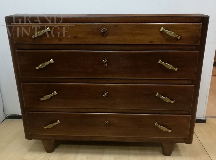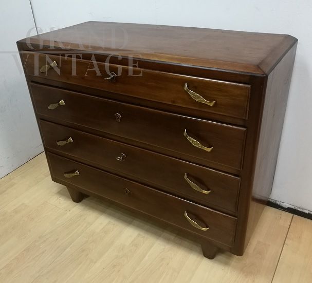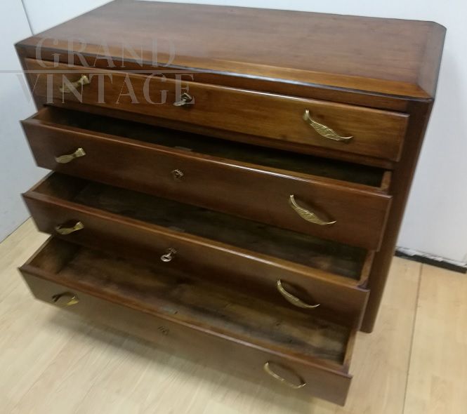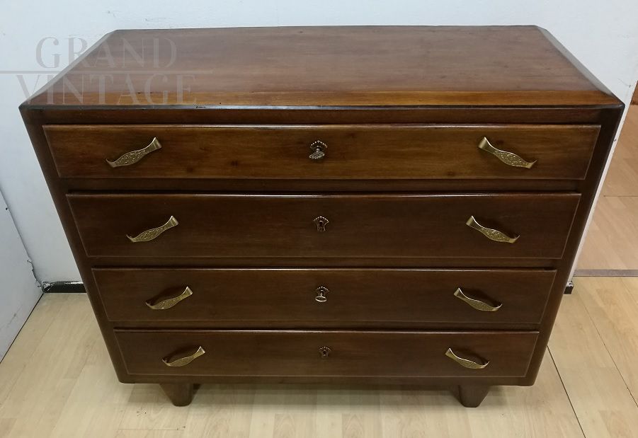 Original chest of drawers from the Italian art deco period, with structure and fronts in solid walnut + 4 drawers with solid fir interior. The drawers are complete with original locks, handles and escutcheons. Drawers with radiused edges on the profiles. Shaped platform cantilevered on the sides with ebonized profile. The structure is slightly curved on the front, the triangular feet are shaped. Furniture completely restored in excellent state of conservation. Walnut shellac and wax finish.