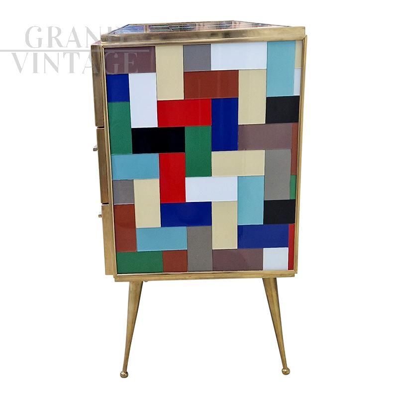 Dresser with six drawers entirely handmade, with wooden structure covered in multicolored Murano glass tiles; profiles, handles and feet in golden brass.