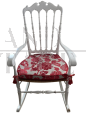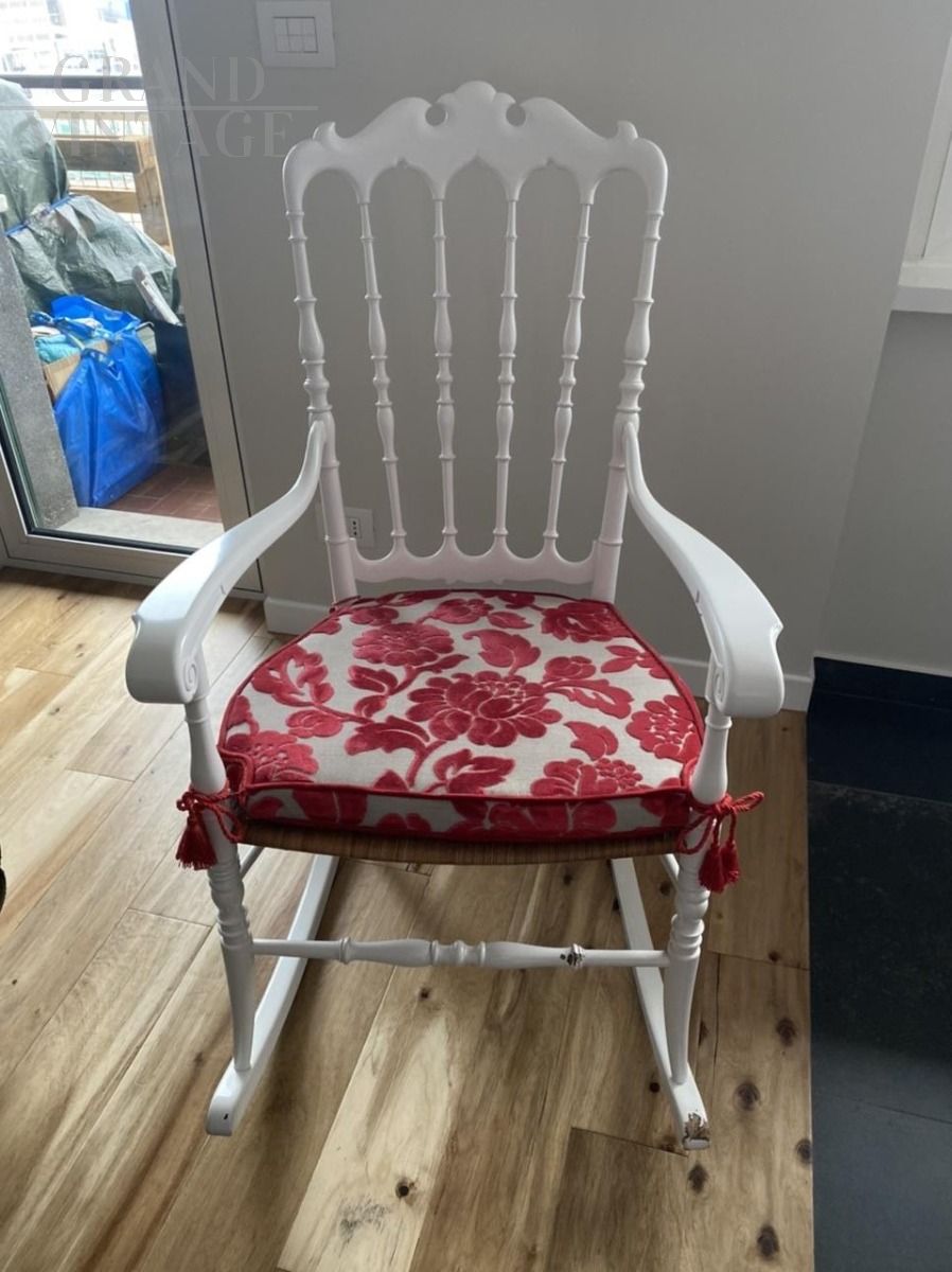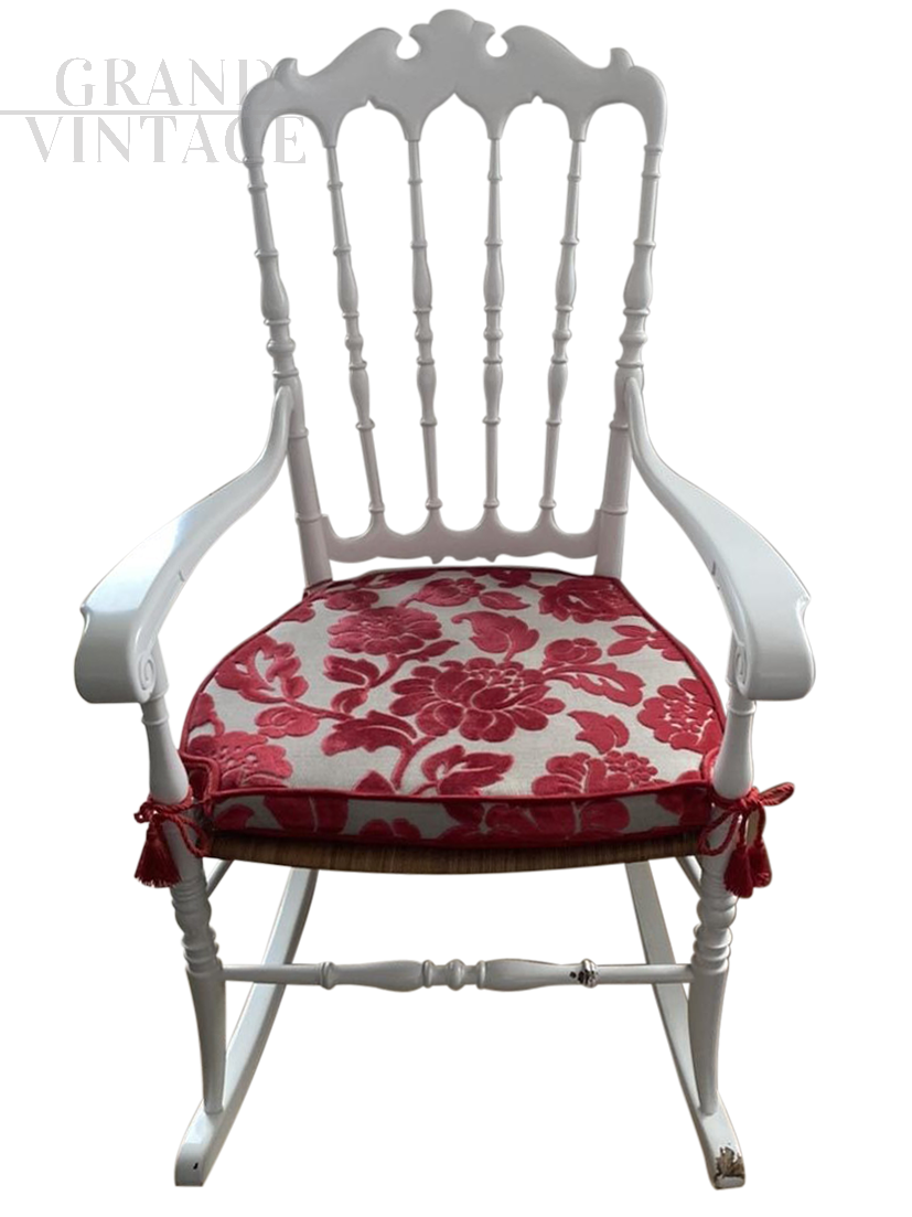 Chiavarina rocking chair, white lacquered by Chiavari craftsman, original seat in excellent condition. White cushion with red velvet flowers, made to measure.