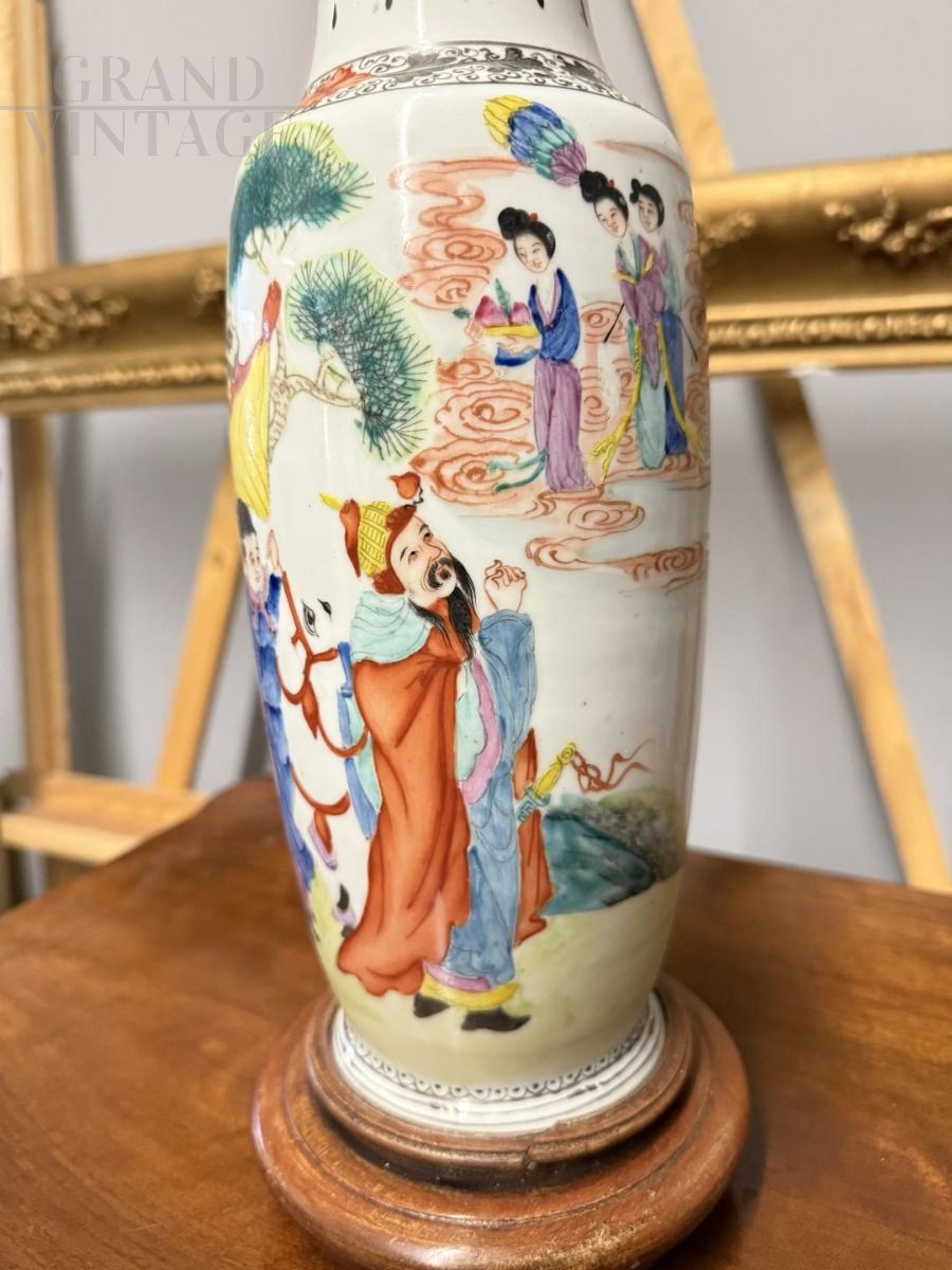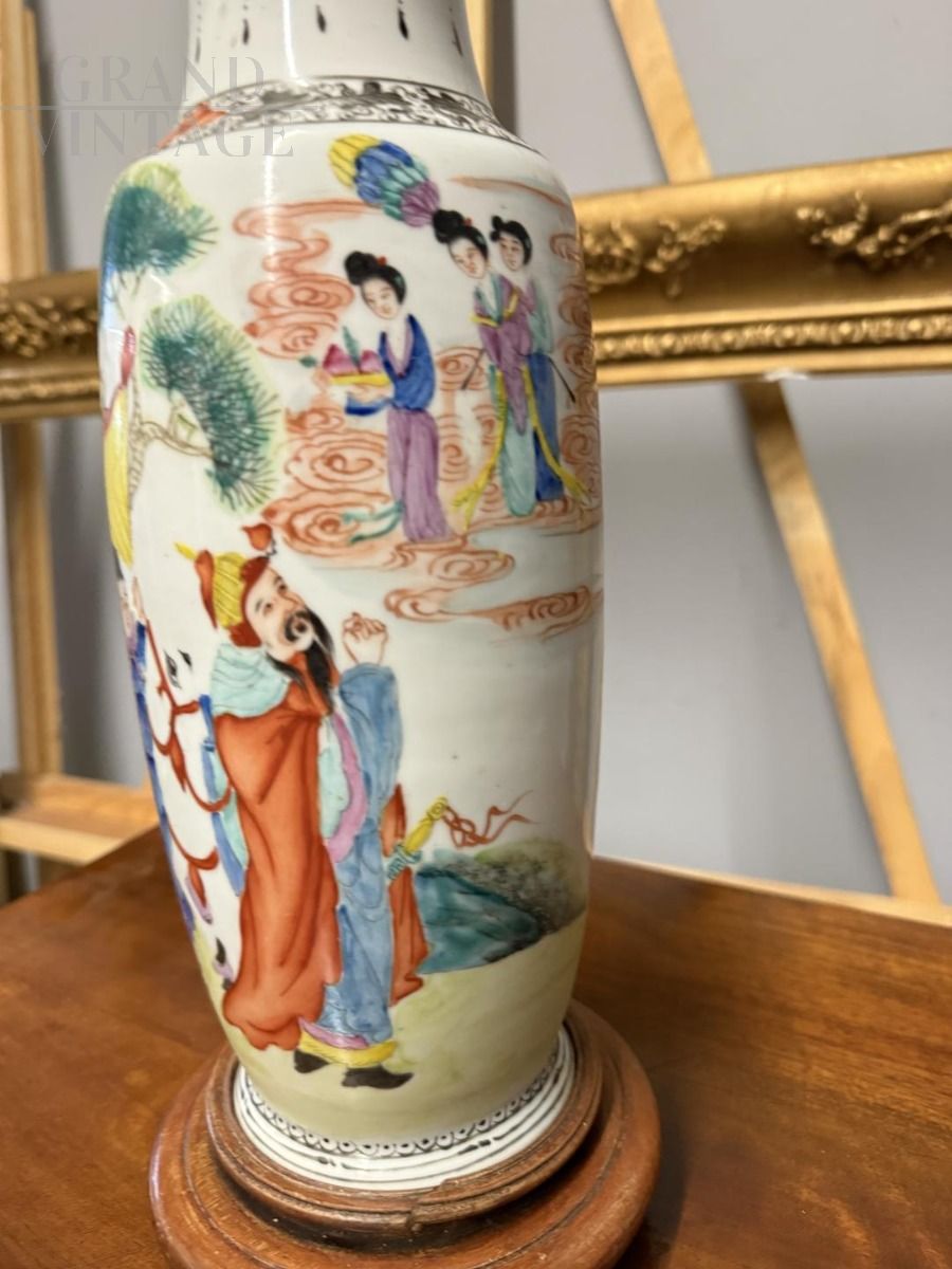 Chinese porcelain vase from the Qing Dynasty, 20th century, height 38 cm and diameter 15 cm. The decoration is in polychrome enamel with human figures in Chinese folk costumes. Wooden base, good state of preservation.