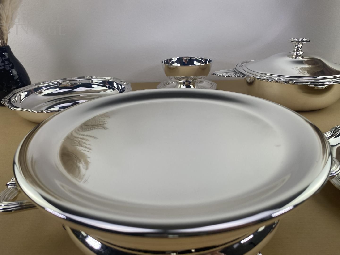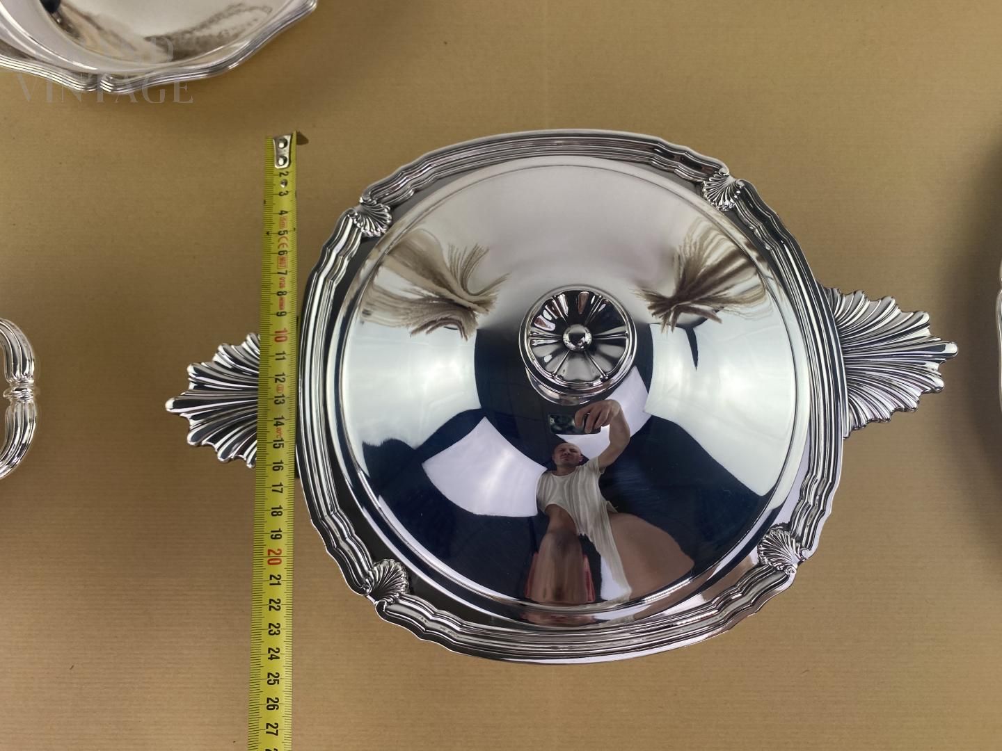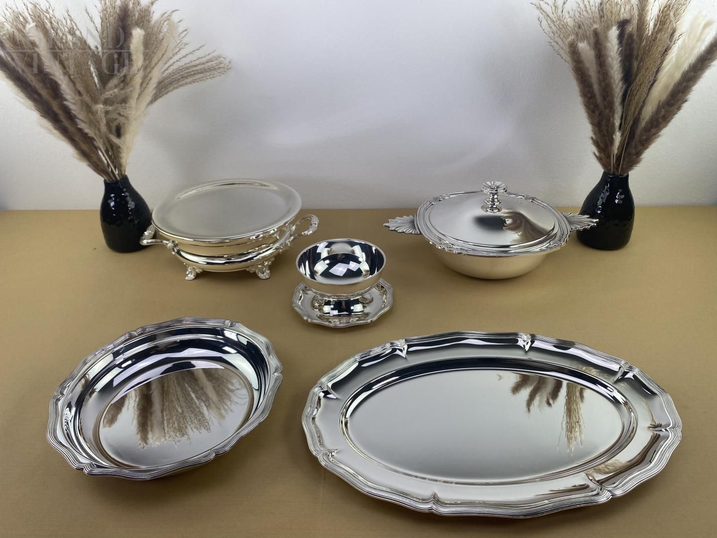 Beautiful silver-plated metal serving set from the first half of the 20th century, by the well-known French maison Christofle, synonymous with style and quality all over the world. This set is composed of: A large round tray with a diameter of 27 cm, a large oval tray with a width of 43 cm, a tureen with its respective lid with a height of 8 cm and a width of 24 cm, a gravy boat with a height of 8 cm and a width of 13 cm, a 25 cm plate warmer. The set is like new, as can be seen very well from the photos, with a rare shine and beauty.