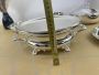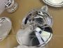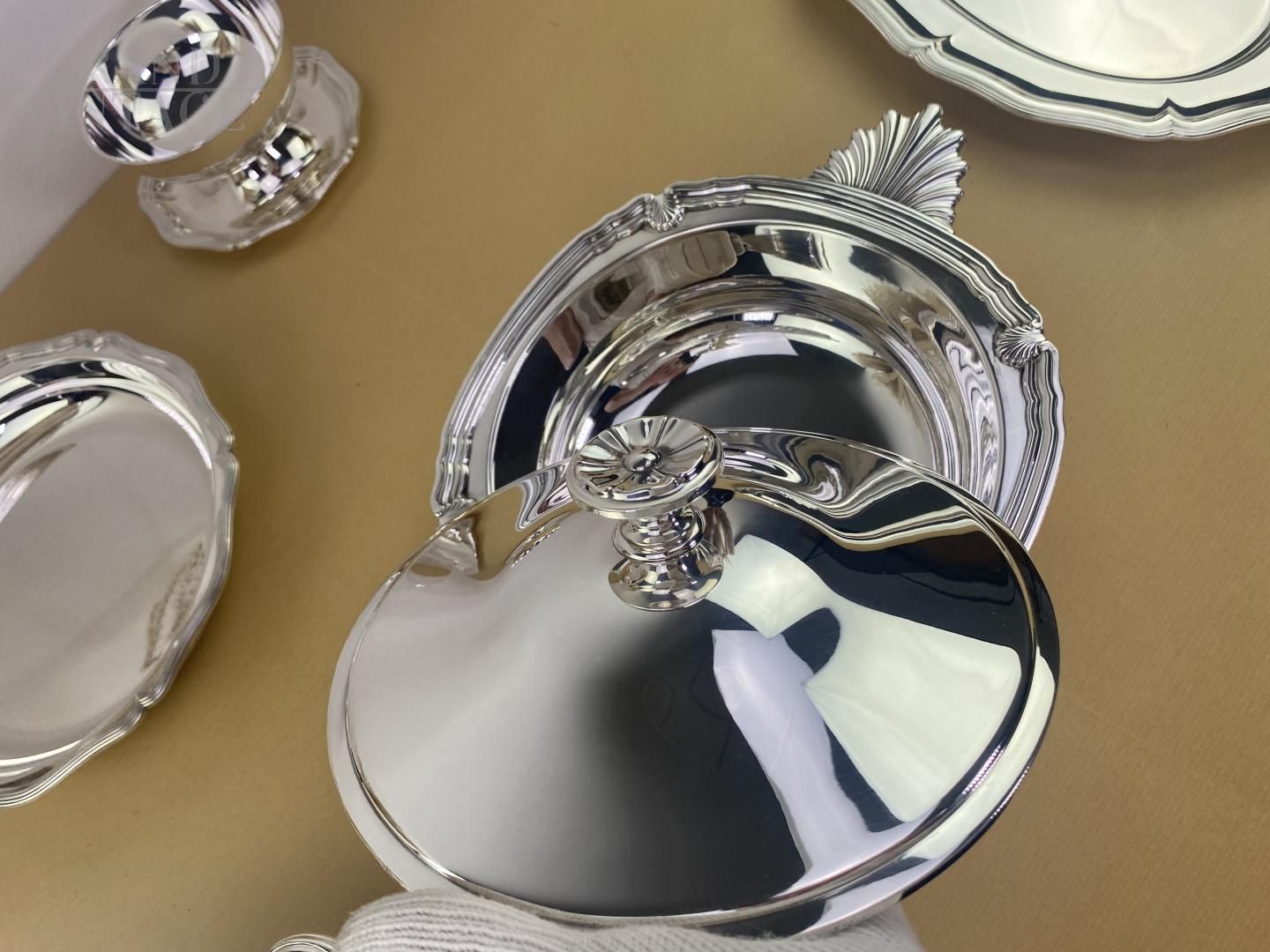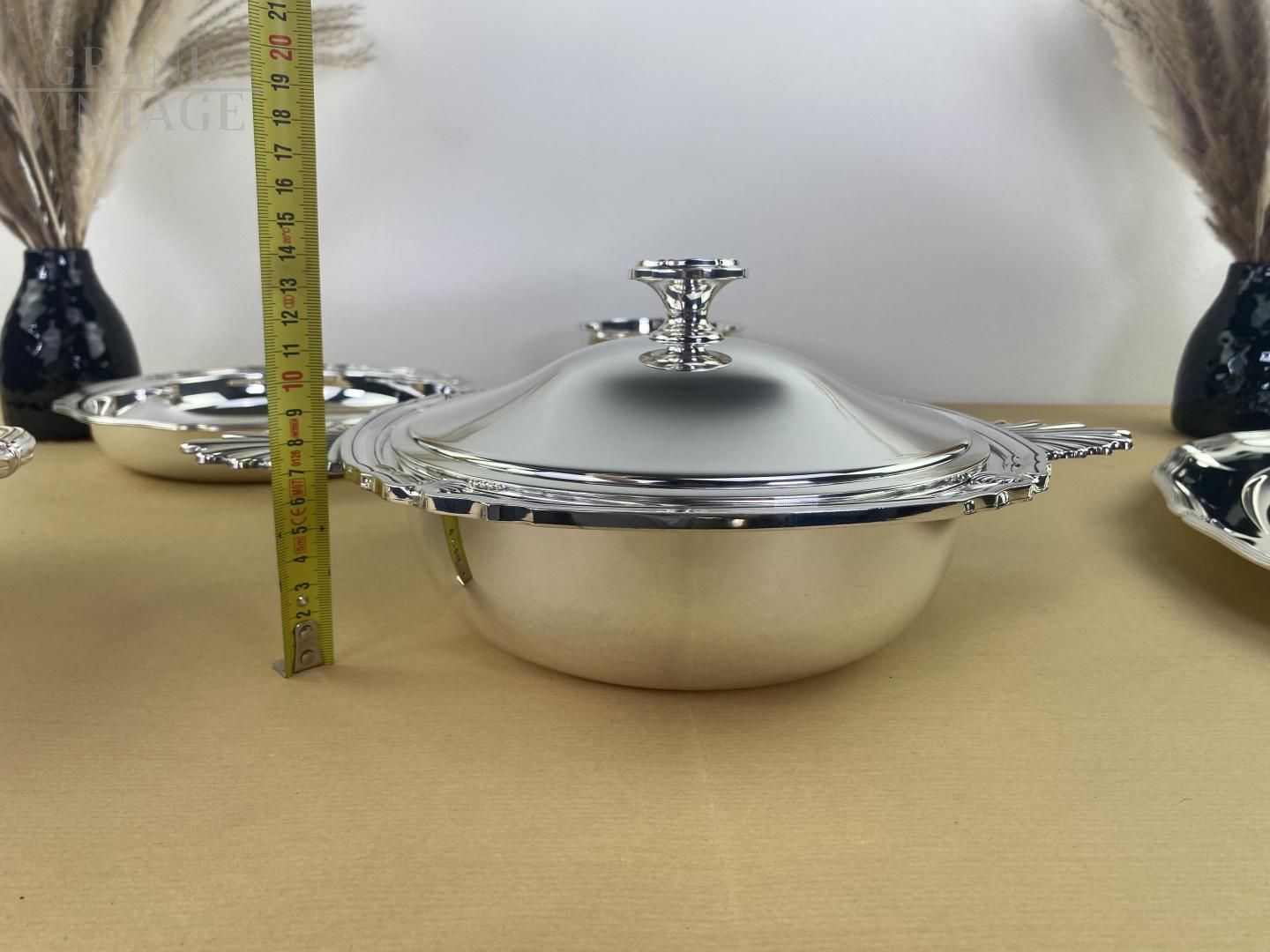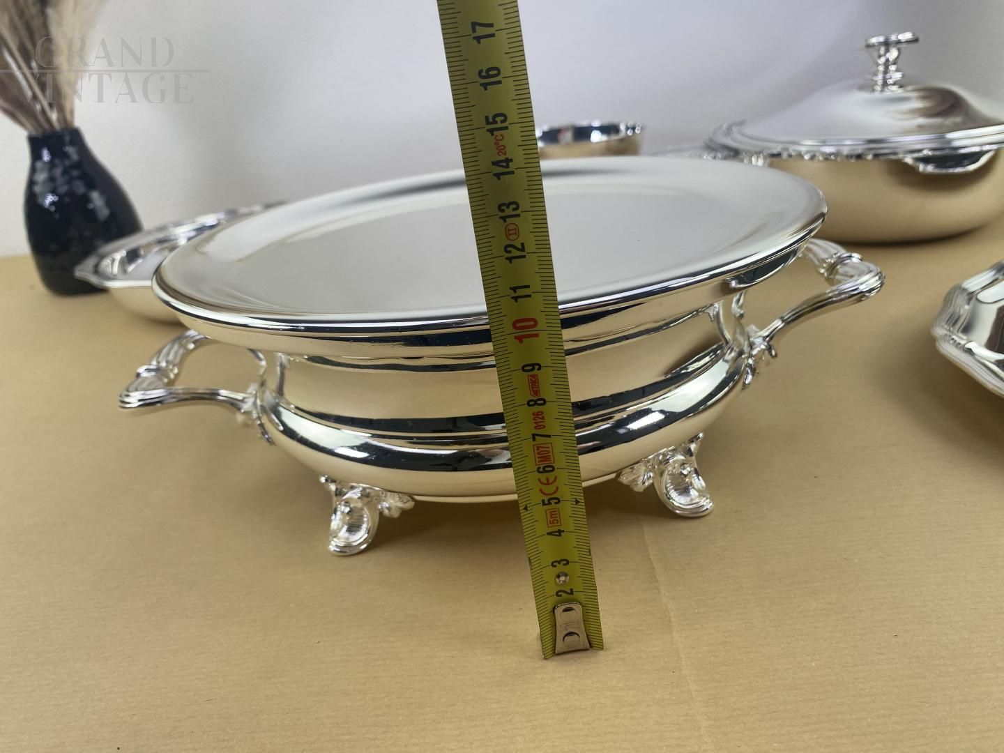 Beautiful silver-plated metal serving set from the first half of the 20th century, by the well-known French maison Christofle, synonymous with style and quality all over the world. This set is composed of: A large round tray with a diameter of 27 cm, a large oval tray with a width of 43 cm, a tureen with its respective lid with a height of 8 cm and a width of 24 cm, a gravy boat with a height of 8 cm and a width of 13 cm, a 25 cm plate warmer. The set is like new, as can be seen very well from the photos, with a rare shine and beauty.