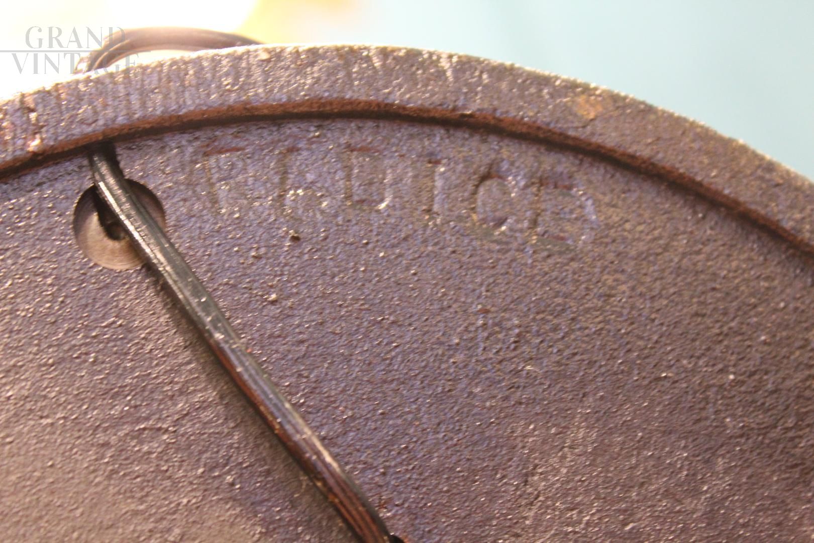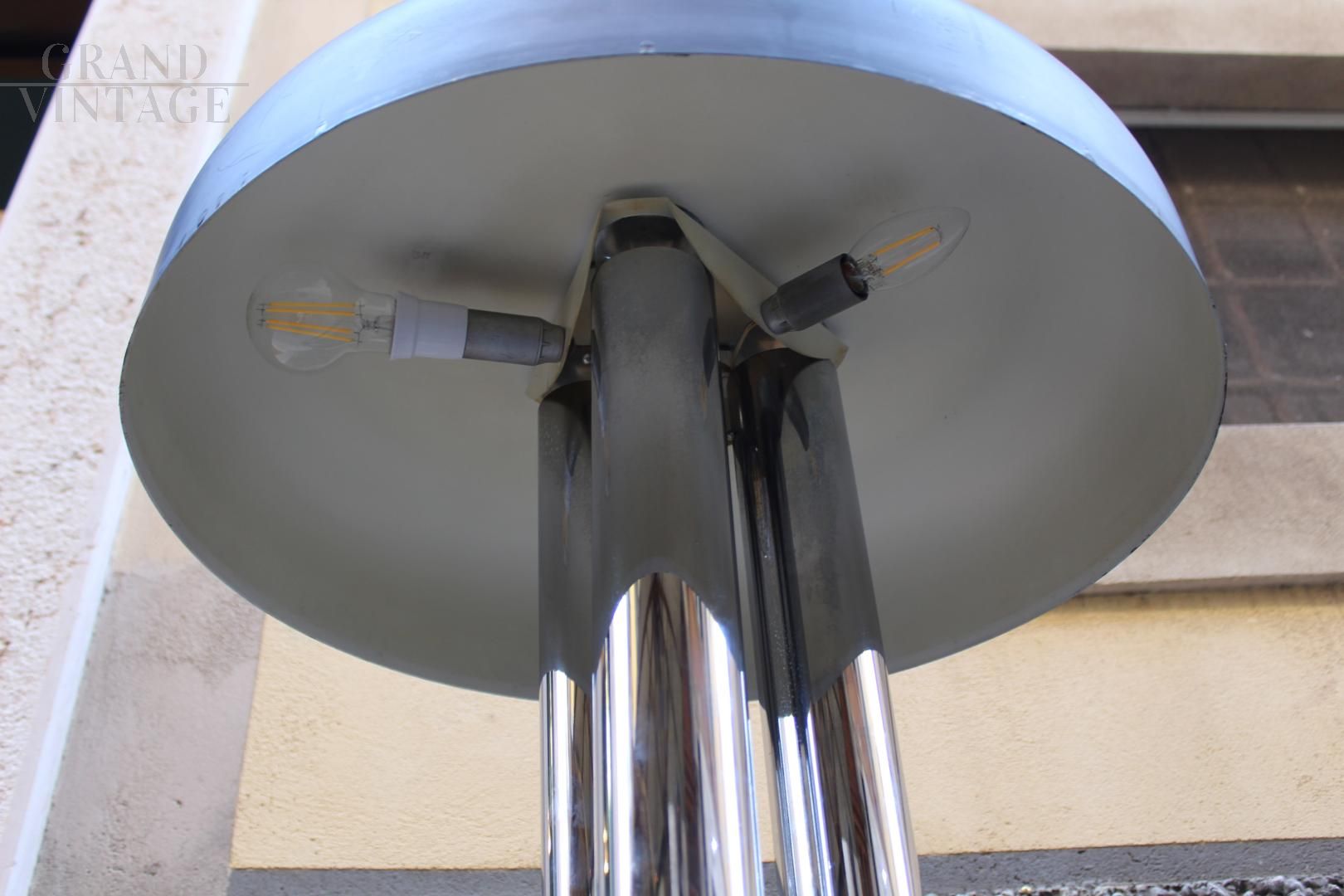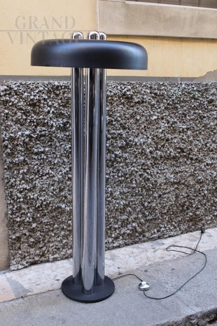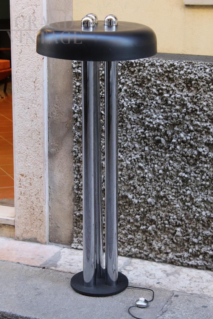 Space Age design floor lamp in chromed metal, signed Radice, Italy from the 70s, made up of a round cast iron base bearing the designer's brand on the bottom, three stems in chromed metal rod and a large black lacquered hat. It is a rare piece, in excellent conservation conditions.