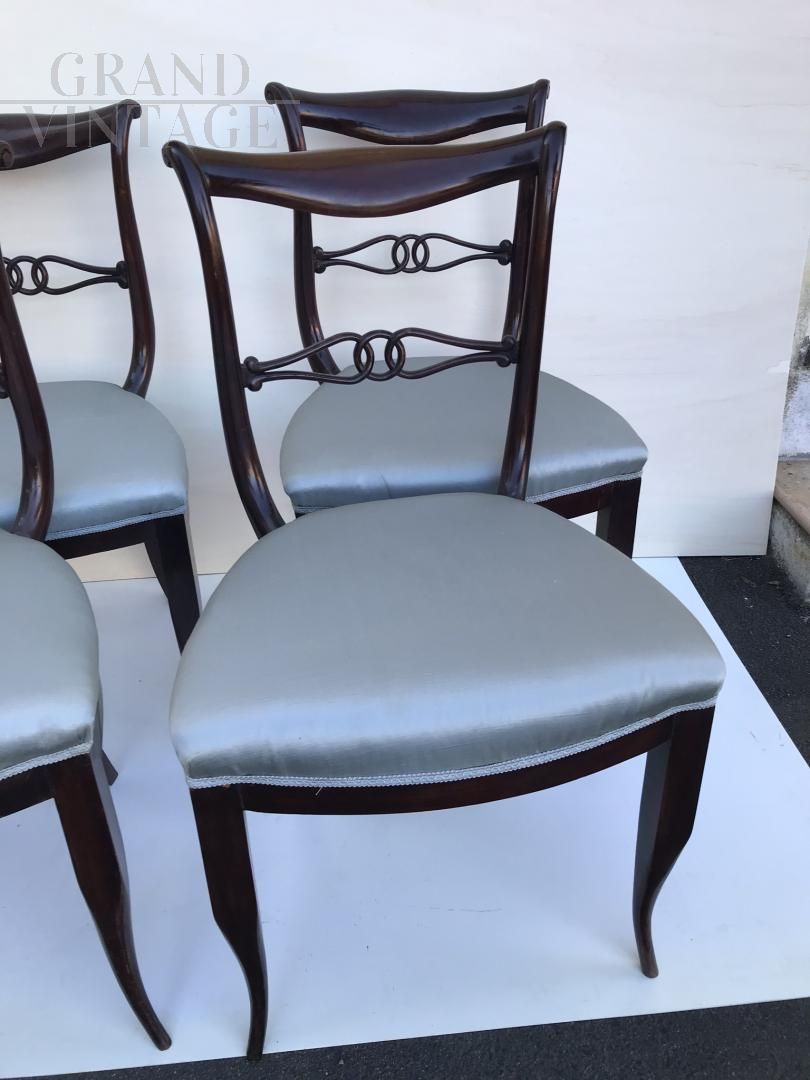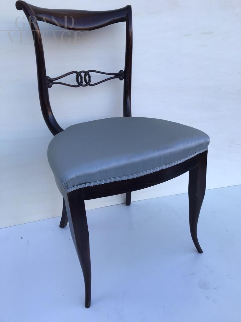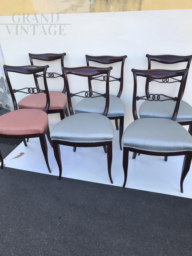 Group of 6 dining chairs, classic style, in dark brown wood and upholstered seat. Produced around the 60s, they need to be reupholstered. The wooden structure is in good condition (except for one slightly damaged). Shiny and very elegant appearance.