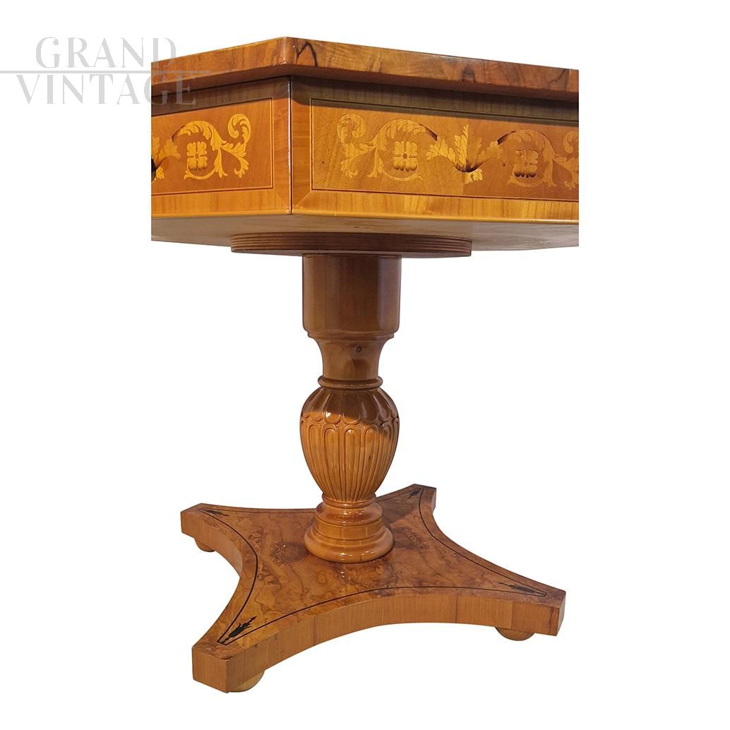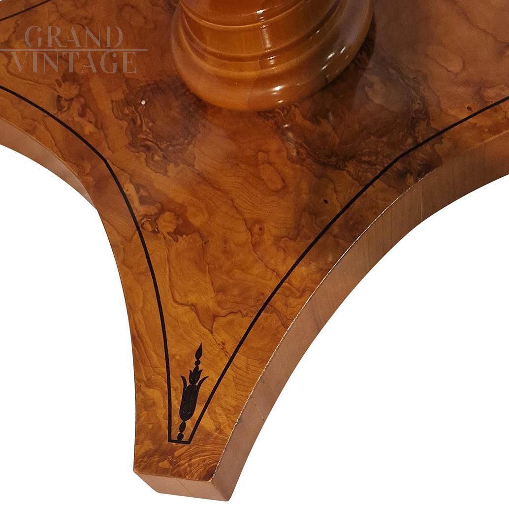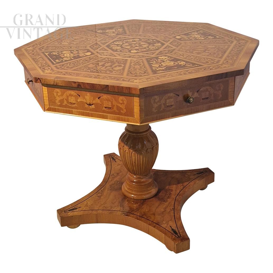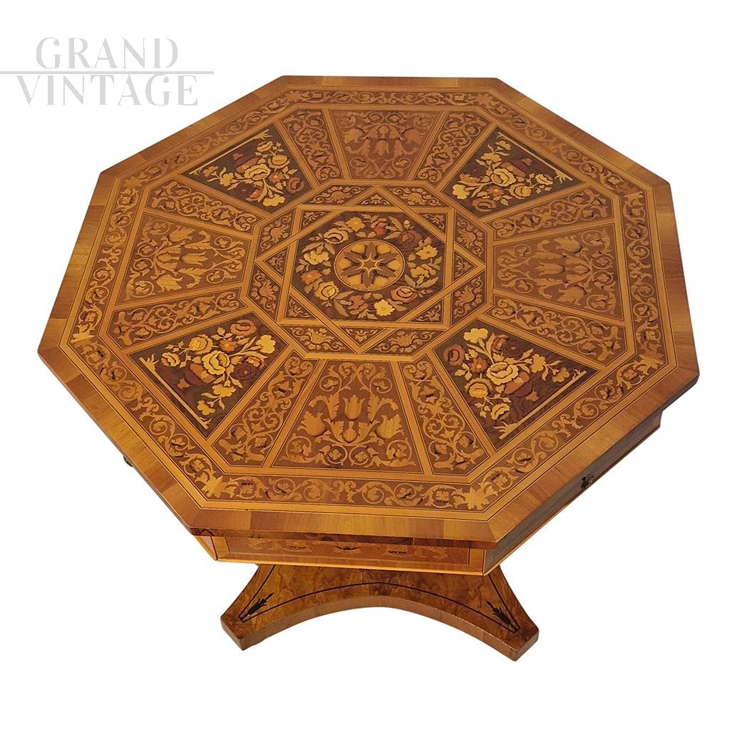 Octagonal table in antique classic style in walnut and walnut briar, with threads and elegant inlays depicting floral and leaf motifs in maple and different wood essences. In the undercounter band there are four drawers with brass knobs, all supported by a turned and carved baluster resting on a quadripartite briar base with inlaid decoration in dark wood.