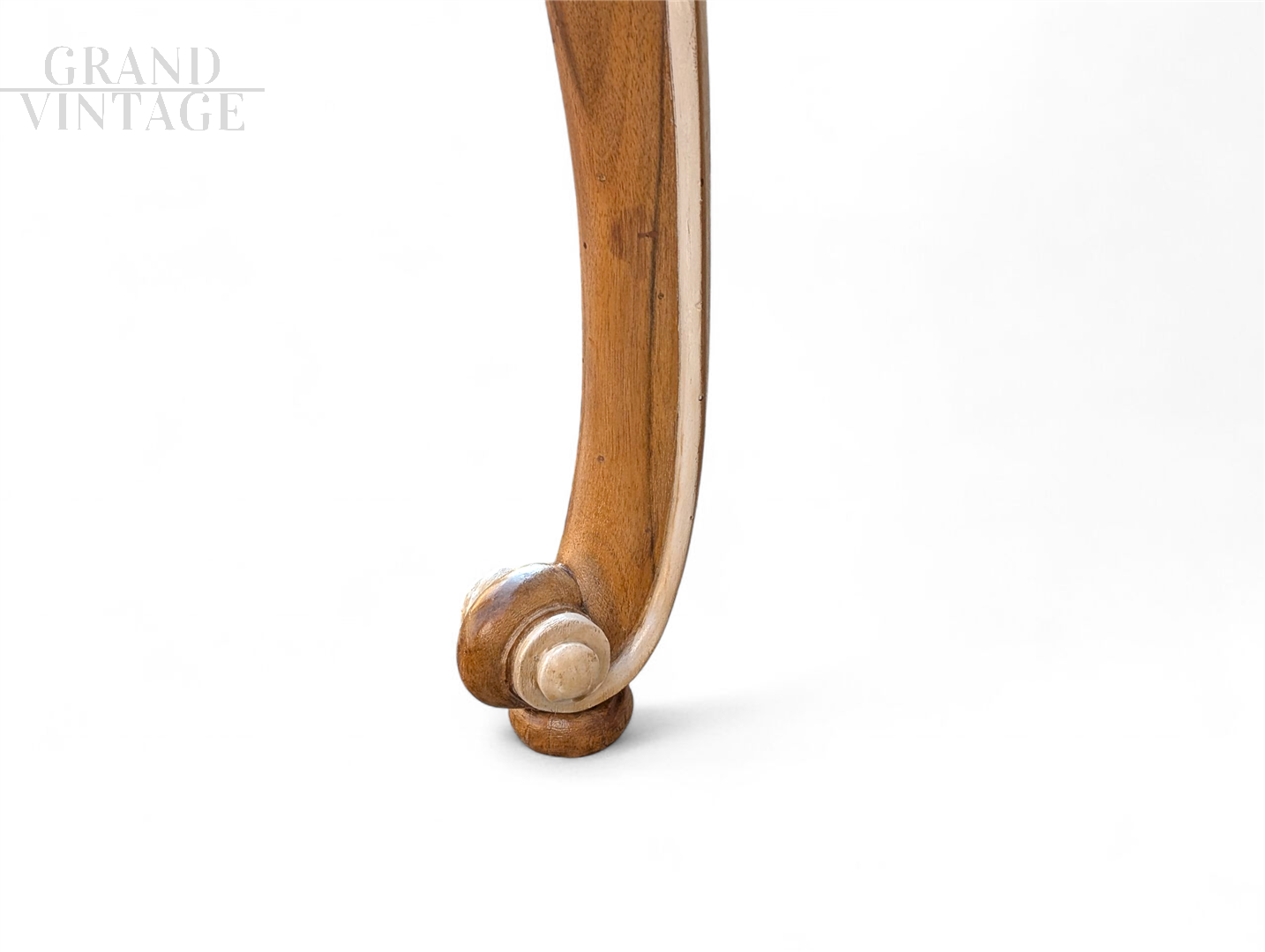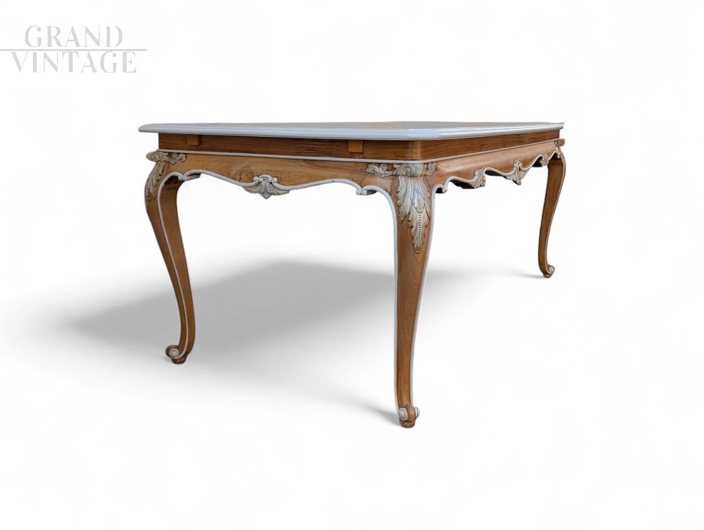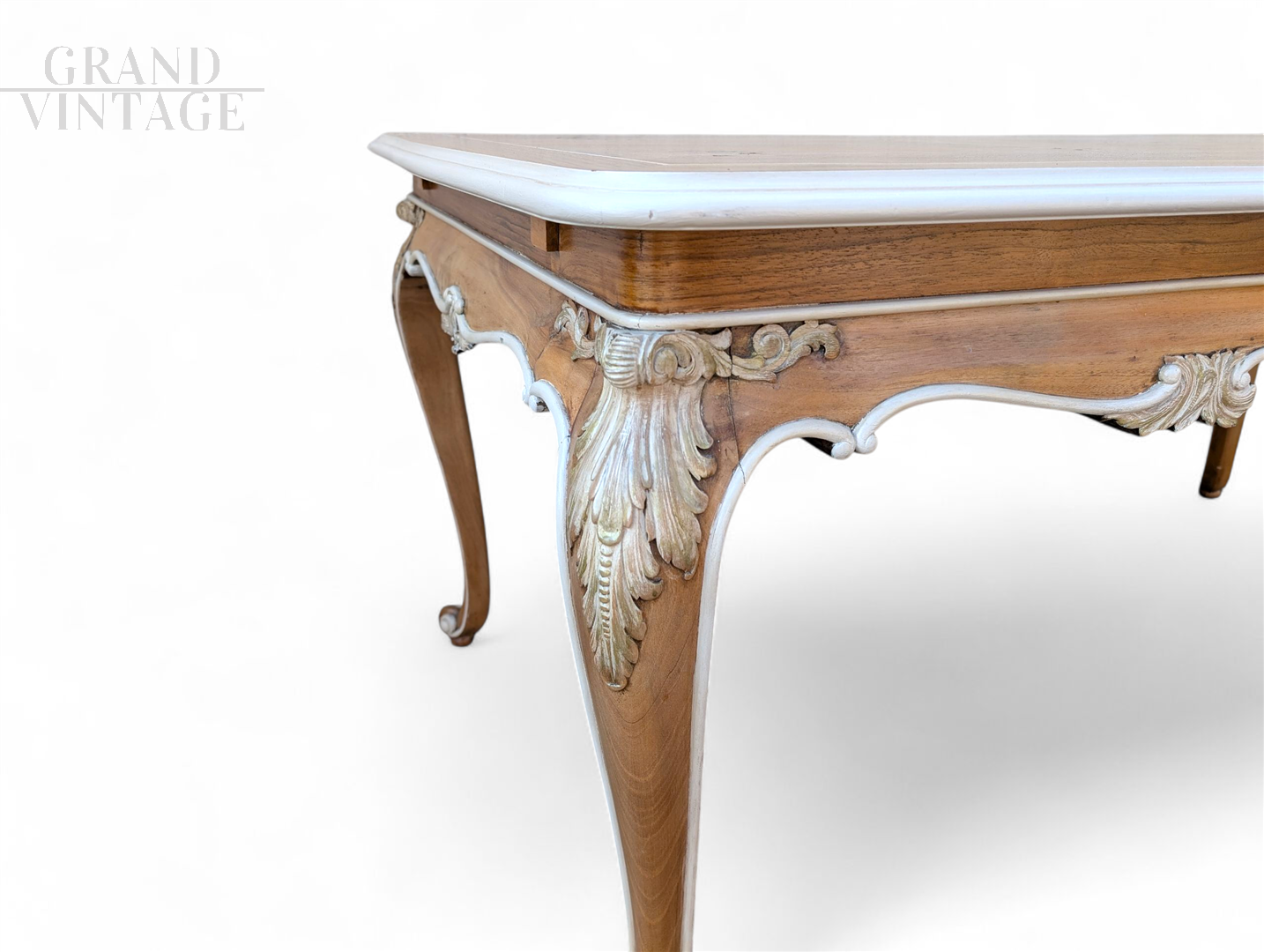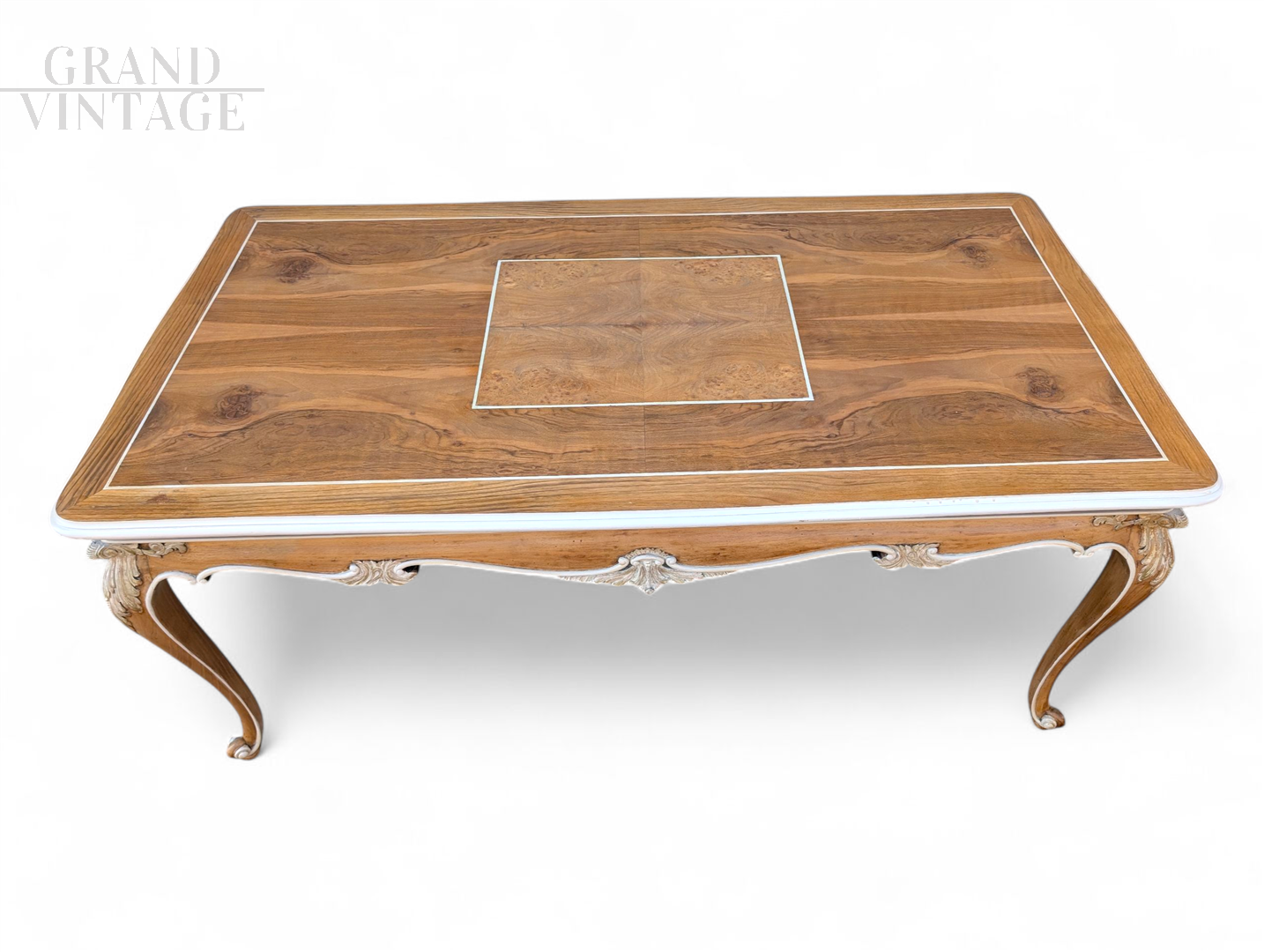 This elegant table is a refined example of traditional Italian craftsmanship, crafted entirely from solid walnut. The top, made of fine natural walnut, features a beautiful grain enhanced by a smooth, warm finish, enriched by a delicate interplay of geometric inlays with a central square. The frame is sculpted in classic French style with curved, contoured legs, typical of the Louis XV style, finely hand-carved with ornamental floral motifs. The decorations are complemented by a creamy white patina, lending the piece a timeless elegance and a subtle shabby chic touch. This table is handcrafted.