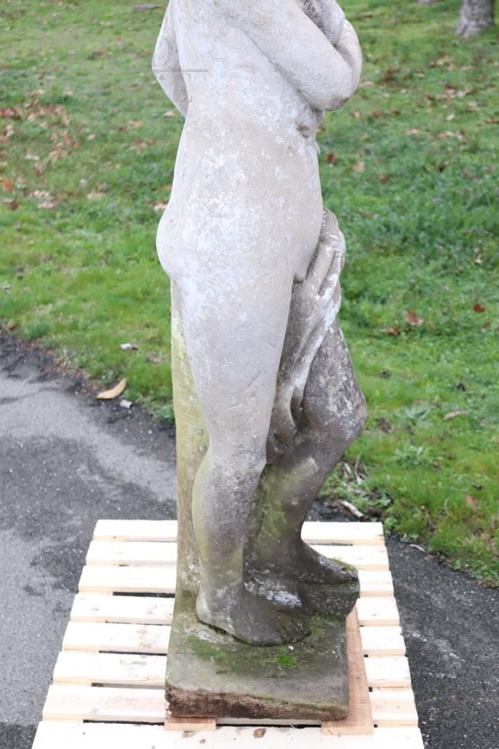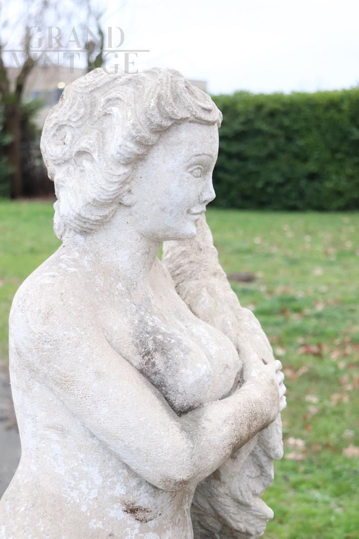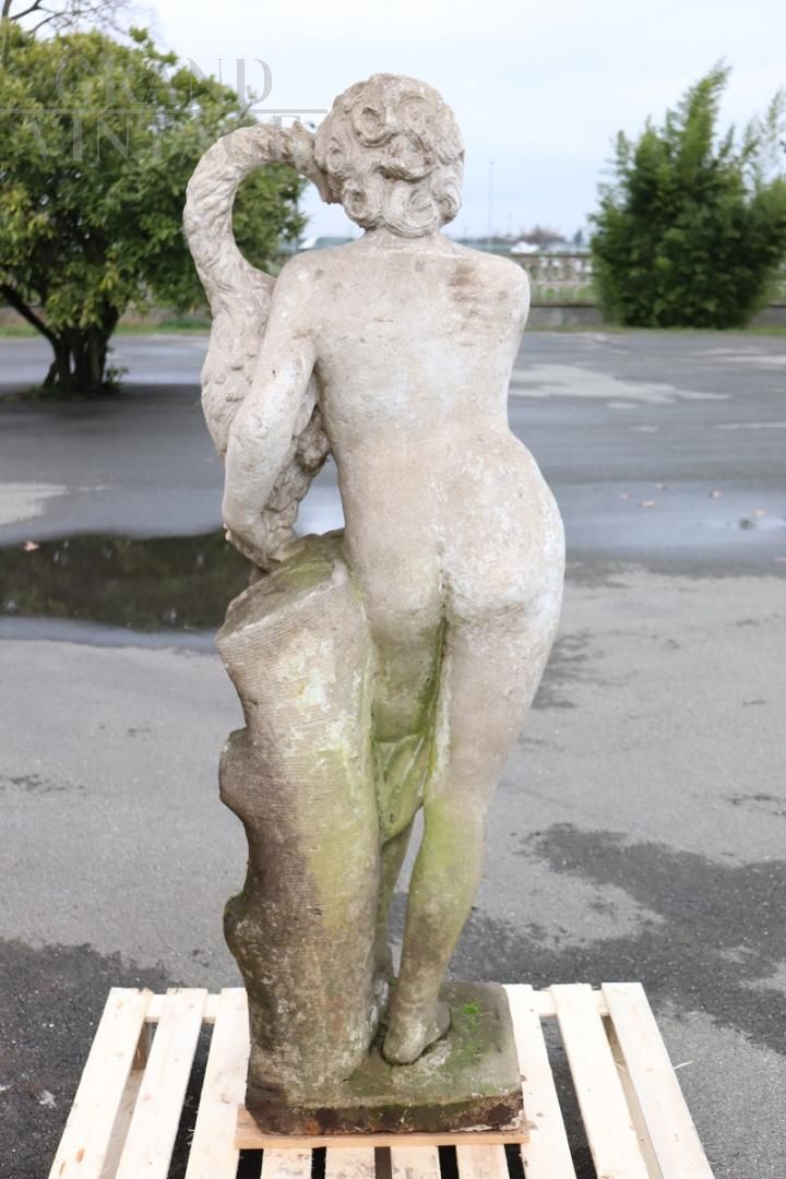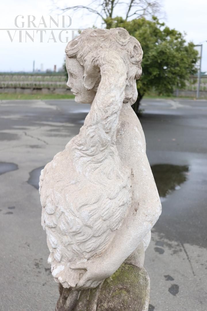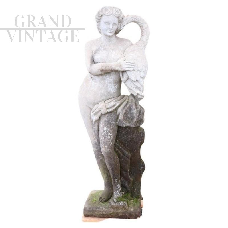 Beautiful and refined garden statue depicting Leda and the swan, made in stone around the 1920s.. Beautiful and majestic statue, a beautiful representation of Leda and the swan. The sculpture represents Leda, queen of Sparta, tenderly embracing the swan. Since classical antiquity, it has been one of the most famous subjects in the entire history of art. Zeus, in love with the splendid girl, approached her during a bath in the form of a swan, seduced her and from their union, as the myth tells, Castor and Pollux were born. It shows signs of the passage of time spent outdoors. This statue is perfect for beautifying an important garden. Excellent negotiable price.