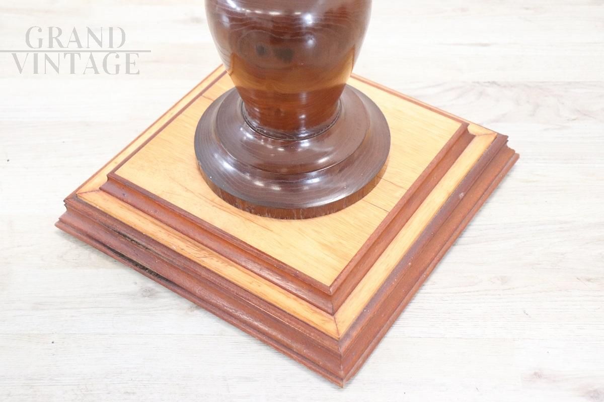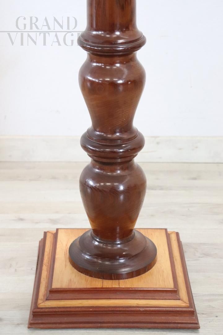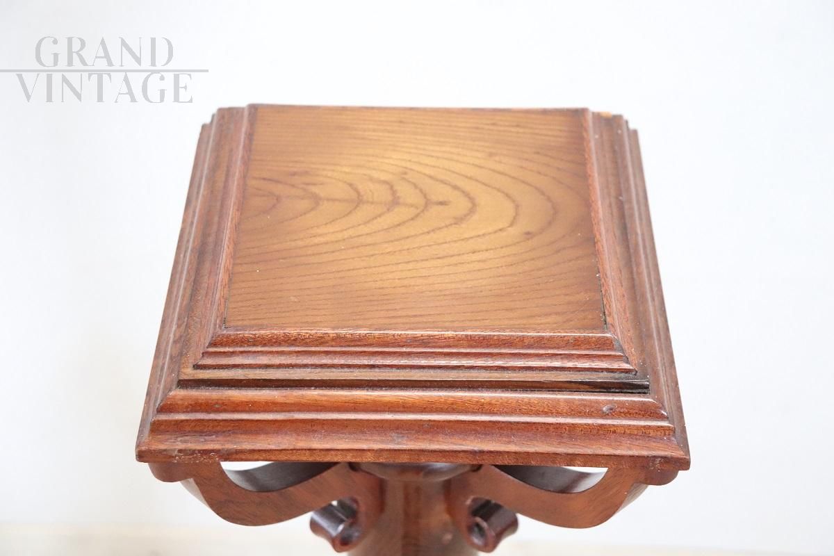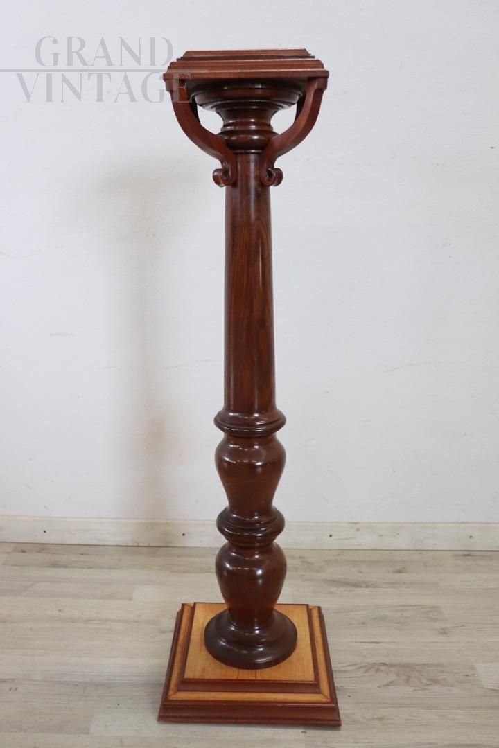 This beautiful column is made in Italy in the last decades of the 20th century, it is a true testimony to mastery and craftsmanship. Crafted from solid oak, it features an intricately turned body that highlights the beauty of the material. The four decorative curls not only support the top surface but also add a touch of elegance to its design, making it a remarkable piece. The polished finish of the wood enhances the natural grain, highlighting the texture and color of the oak. This column serves as an ideal pedestal to display a variety of objects. Top support surface of 16 cm x 16 cm. Price negotiable.