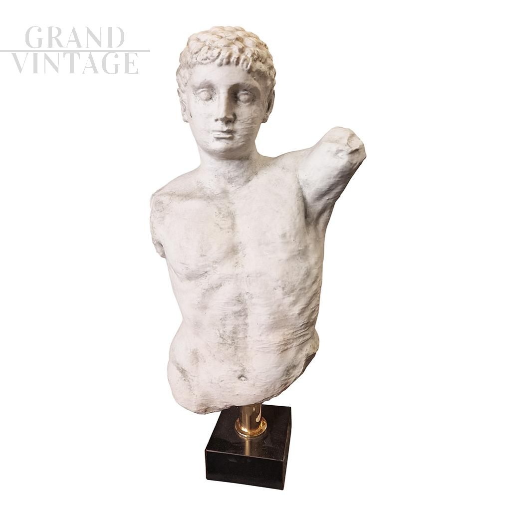 Classical style male bust in plaster on a marble base and cylindrical support in chrome-gold metal.