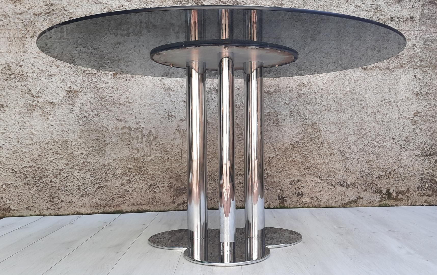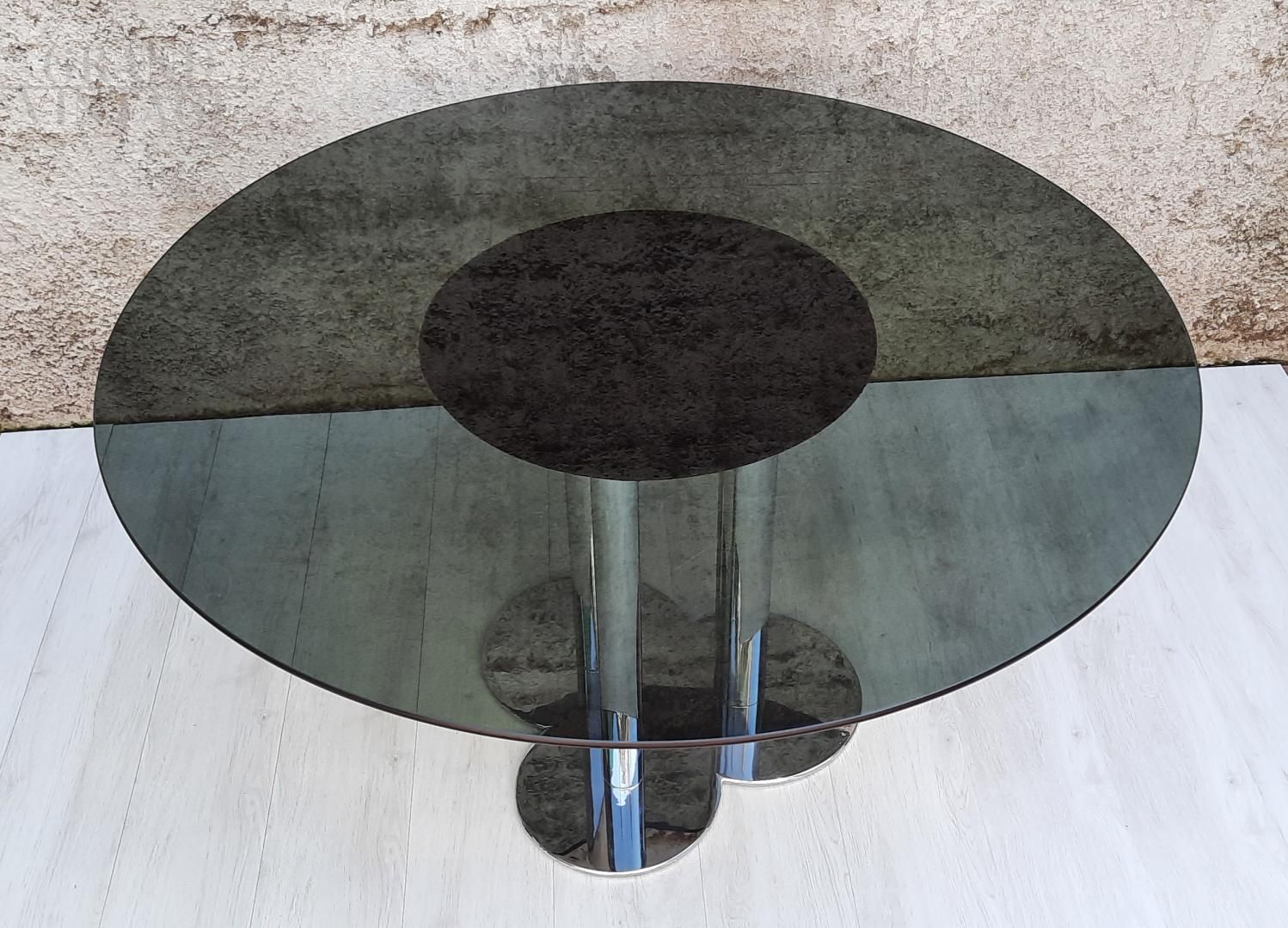 Clover model table by Sergio Asti for Poltronova, with round top in smoked glass and central chromed clover leg. The table is in excellent condition, with only some natural scratches on the top. The tempered glass is fixed to the central leg with nuts.