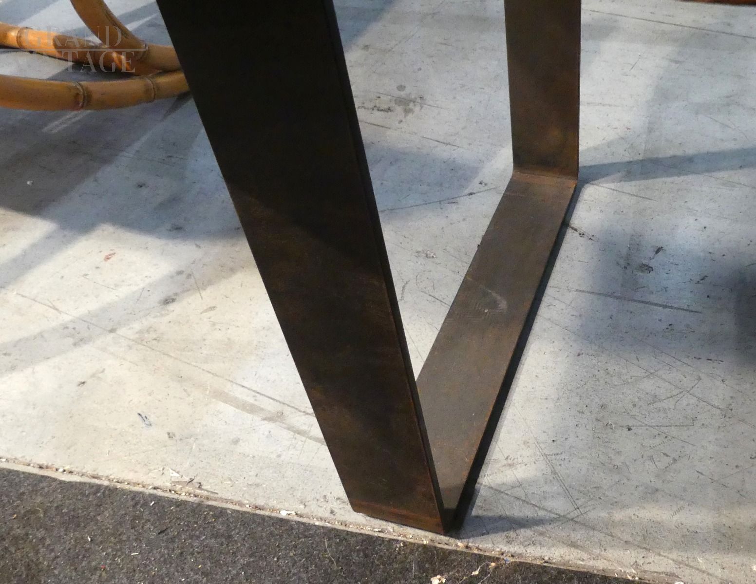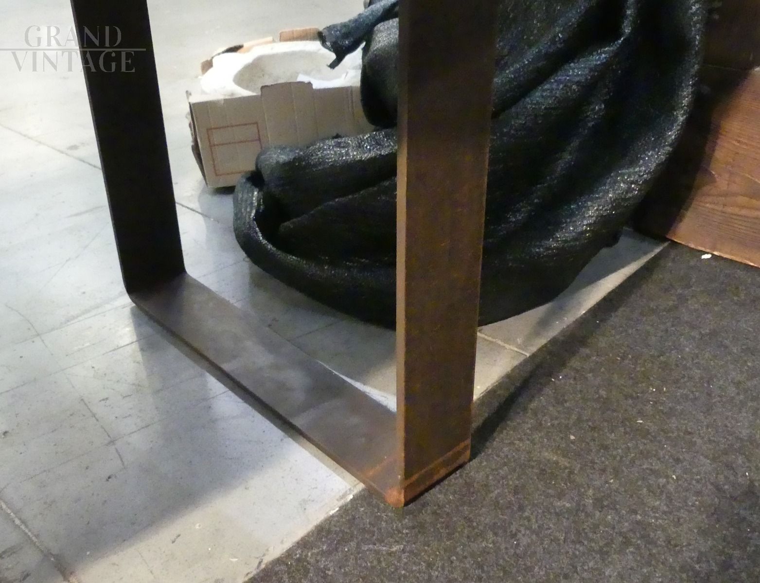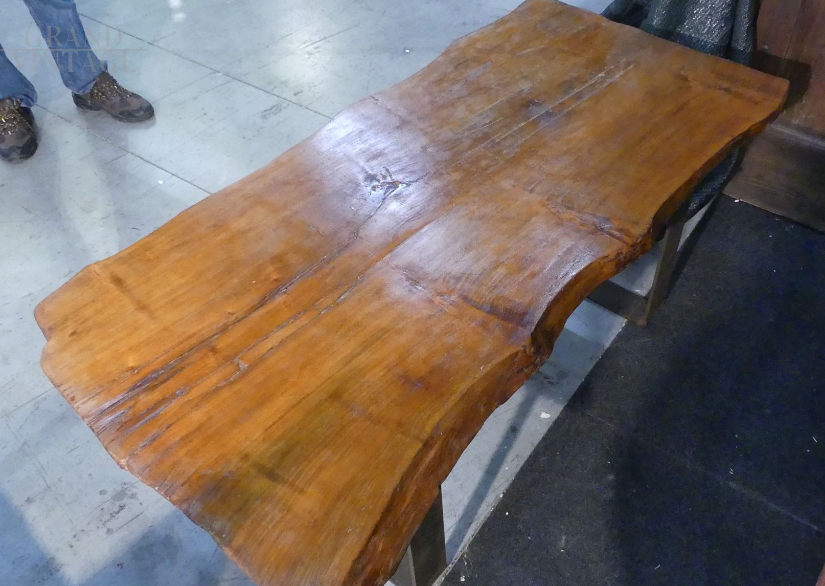 Beautiful coffee table with top in a single plank of raw cherry wood with a thickness of 7 cm and curved iron legs. The axle was made from an approximately 500 year old tree!