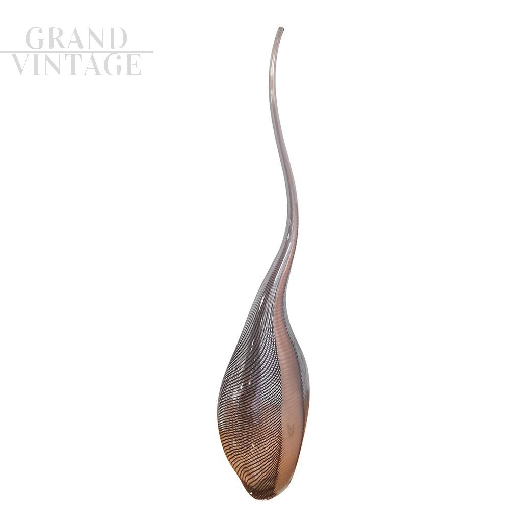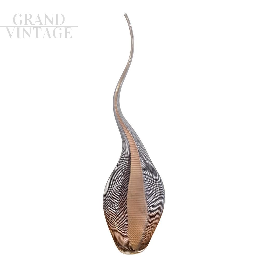 Abstract sculpture by Colizza Murano in brown Murano artistic glass with thick black streaks, signed at the base, made according to tradition by master glassmakers inside the Murano furnaces, in Venice. Cold-worked, this blown glass vase features colored satin finishes intertwined with black lines which give it a particular chromatic sinuosity. The soft elongated shape and the thickness of the material identify it as an elegant and particular furnishing object.