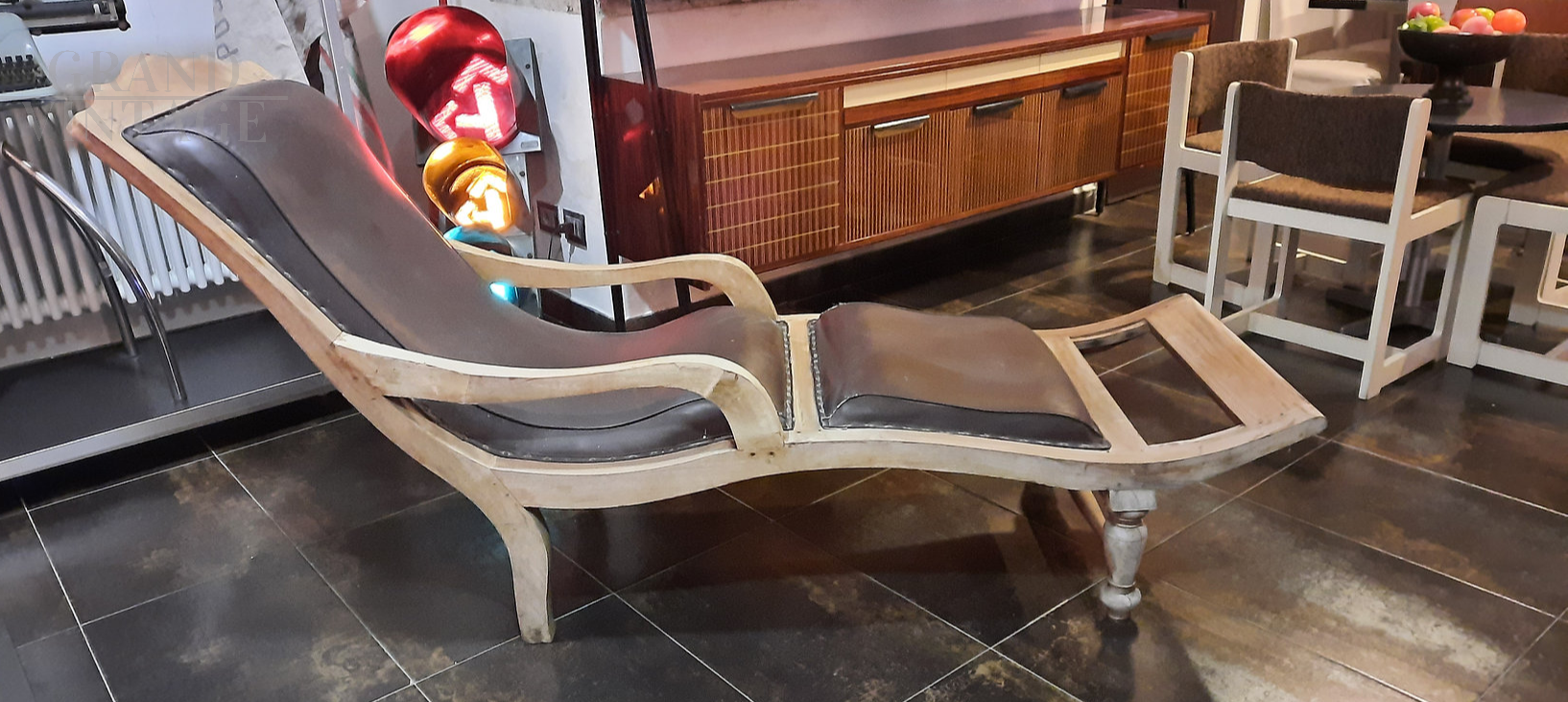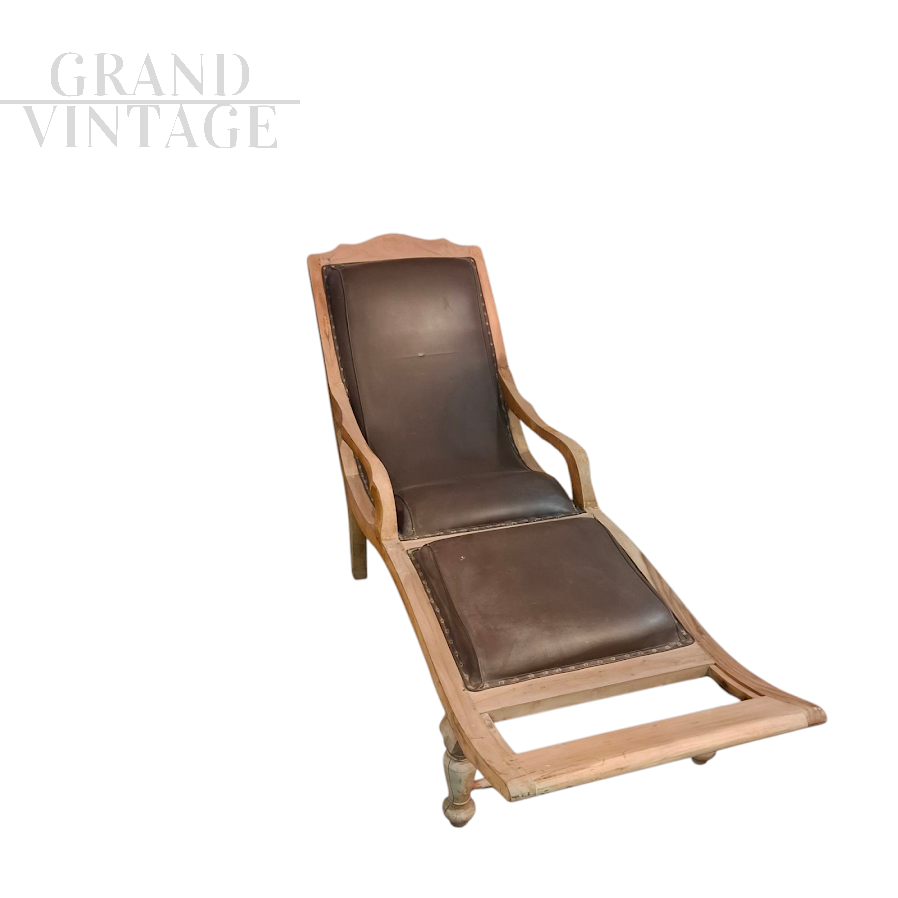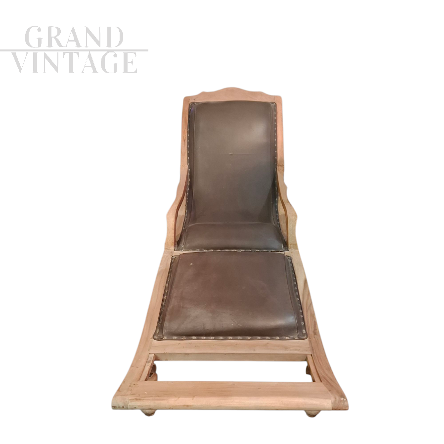 Colonial style Victorian chaise longue in wood and brown leather