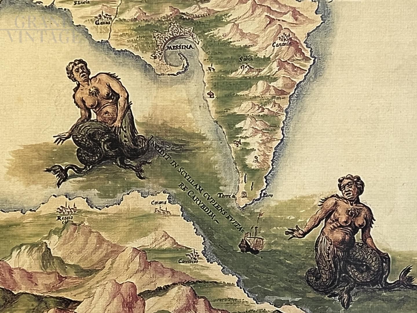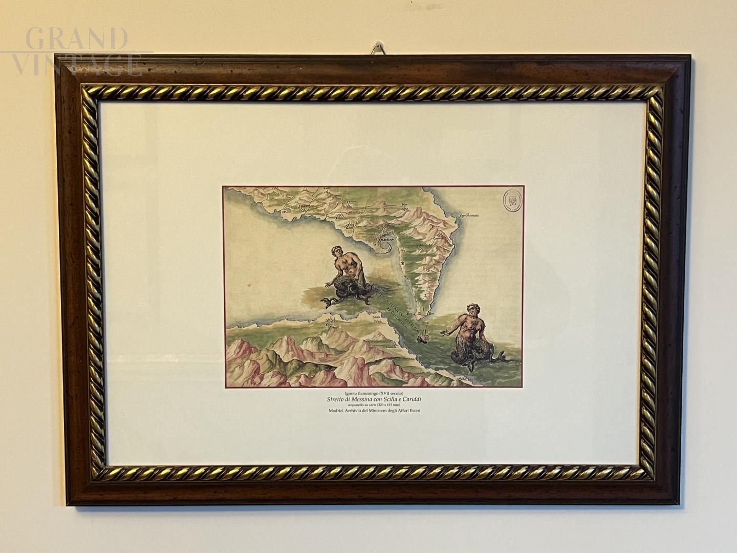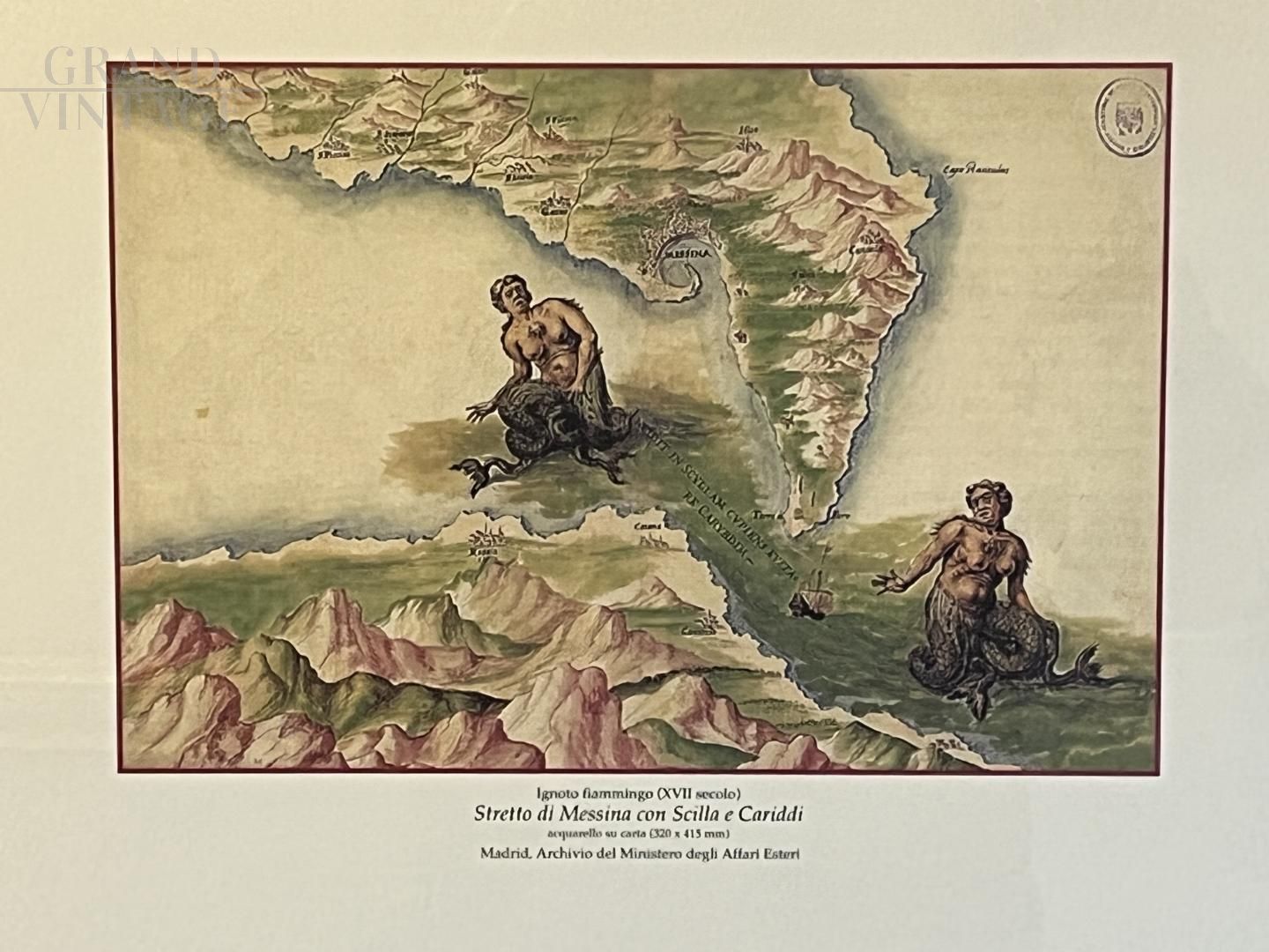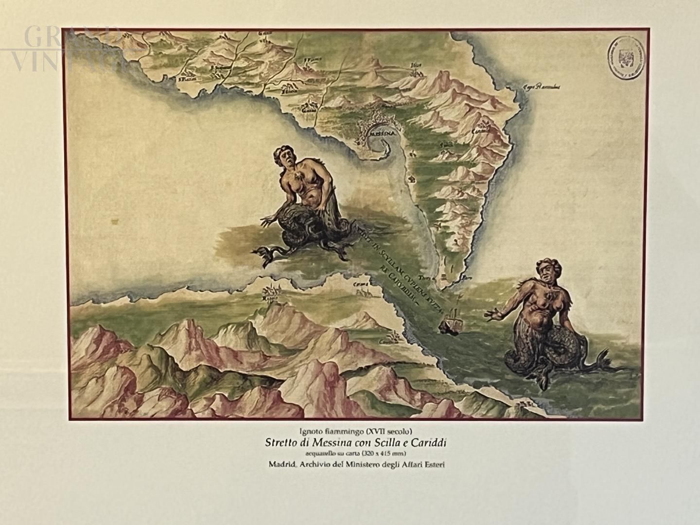 Color print depicting the Strait of Messina according to a 17th century watercolor preserved in the Archives of the Ministry of Foreign Affairs in Madrid. The print is framed and in excellent condition.