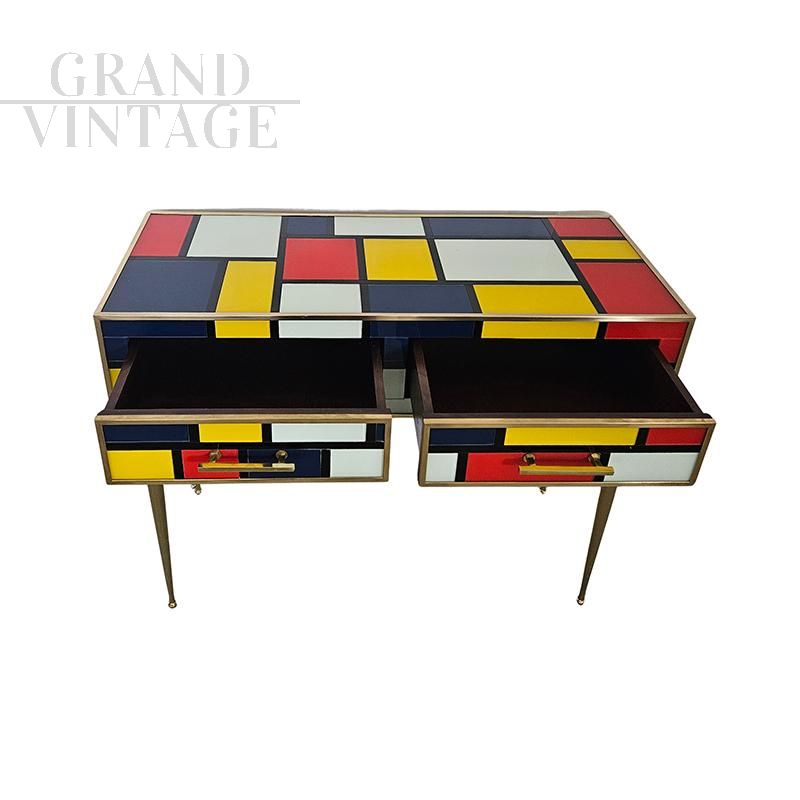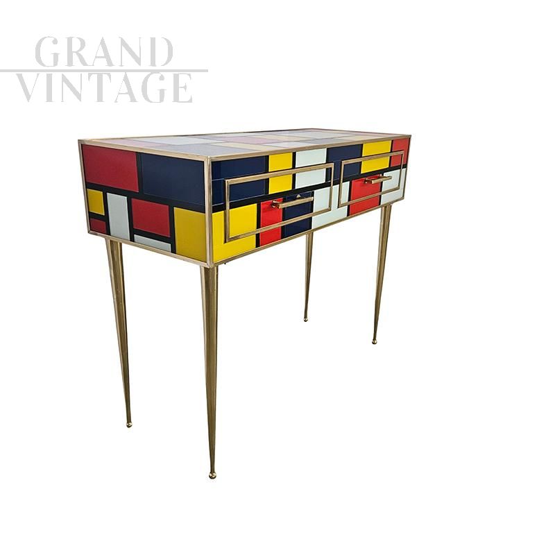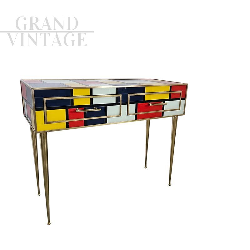 Wooden console, covered in glass Mondrian style. Profiles, handles, legs in brass. Equipped with two convenient drawers.