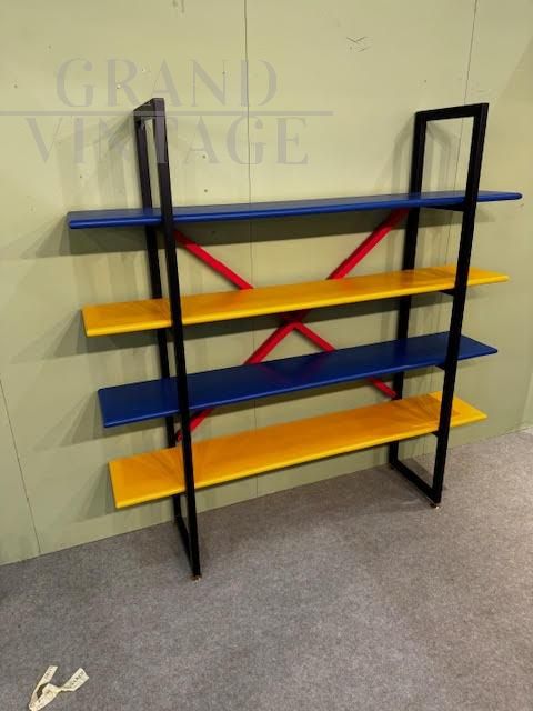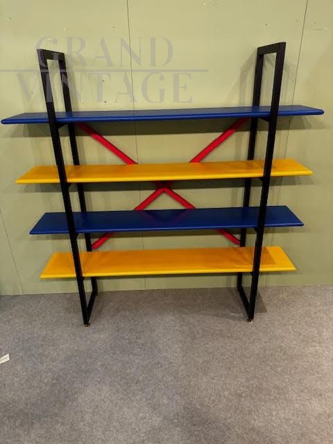 Freestanding vintage bookcase in Mondrian style with 4 yellow and blue colored shelves, the uprights are in black painted metal, the adjustable feet are in brass and on the back there is a red cross, Italian mid-century modern design from the 70s.