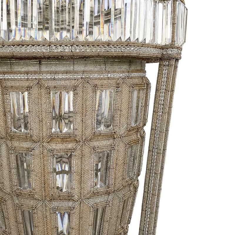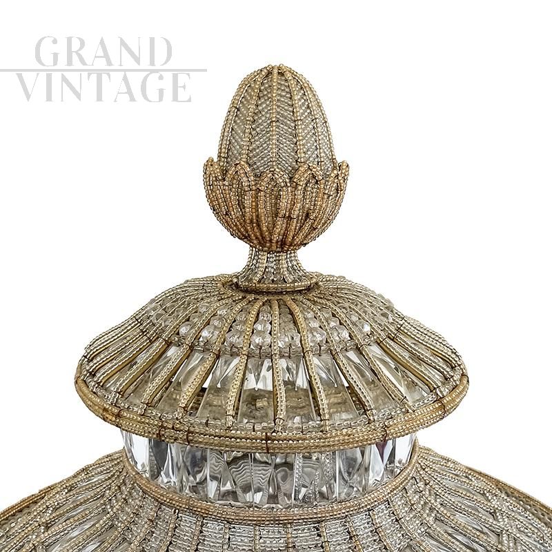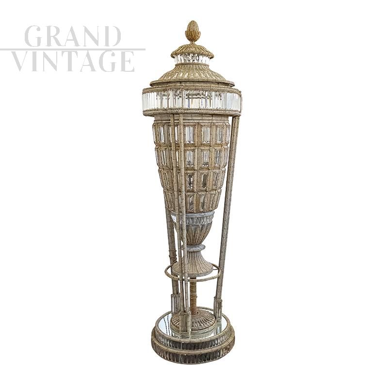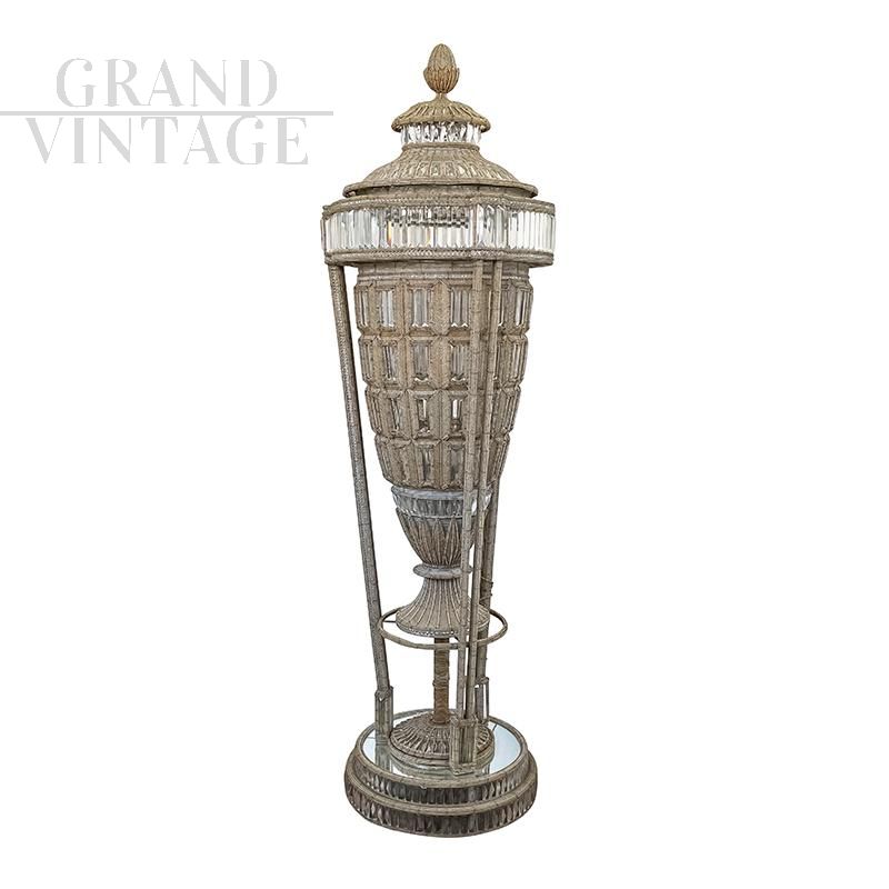 Luxury column floor lamp in the shape of a large vase, entirely handmade, with metal structure completely covered with transparent and beige Murano glass beads and decorative elements in cut glass; the base has a mirror surface finish. The floor lamp is very bright thanks to the eight E27 bulbs that characterize it, of which five in the central stem and three in the base.