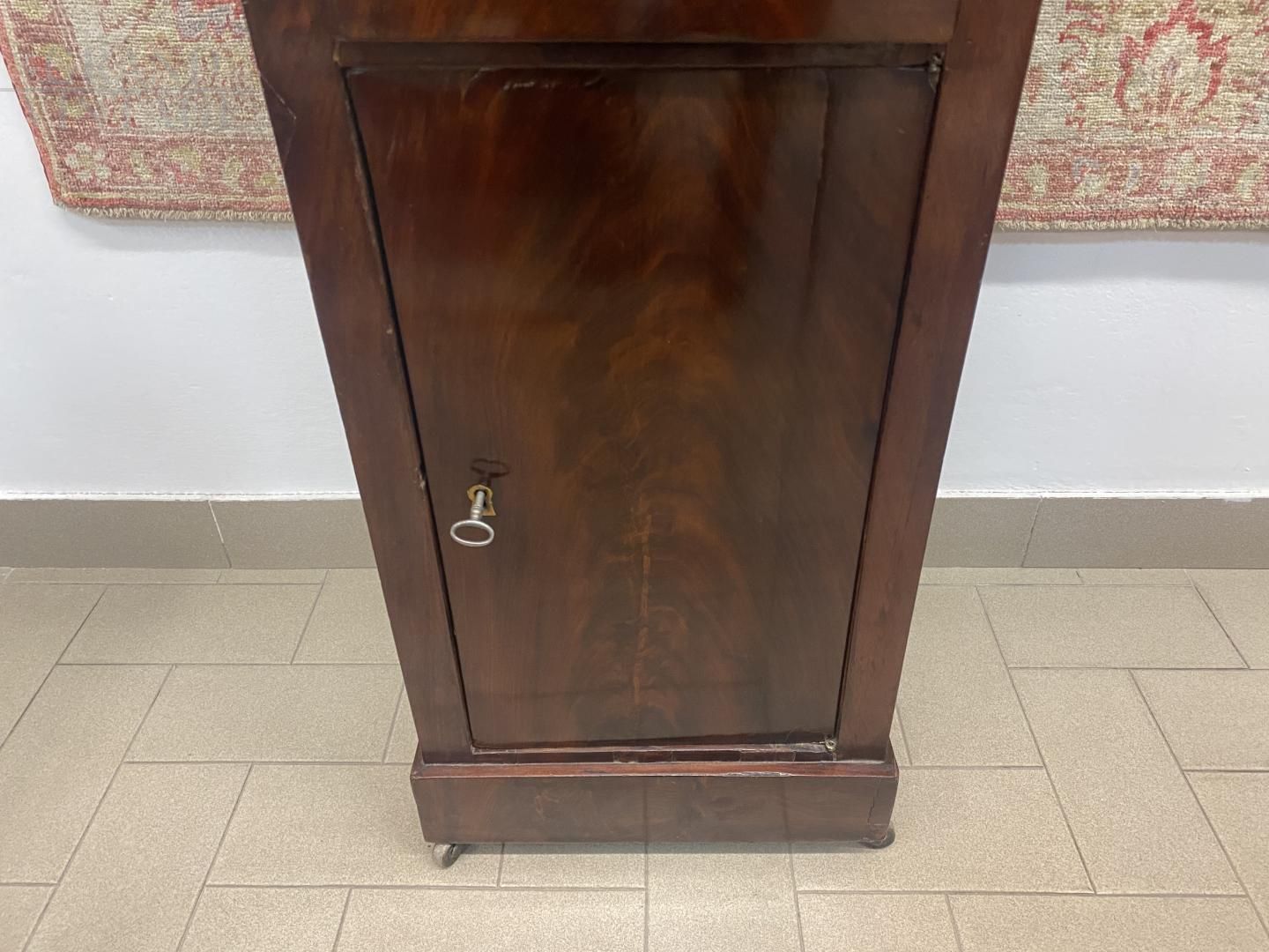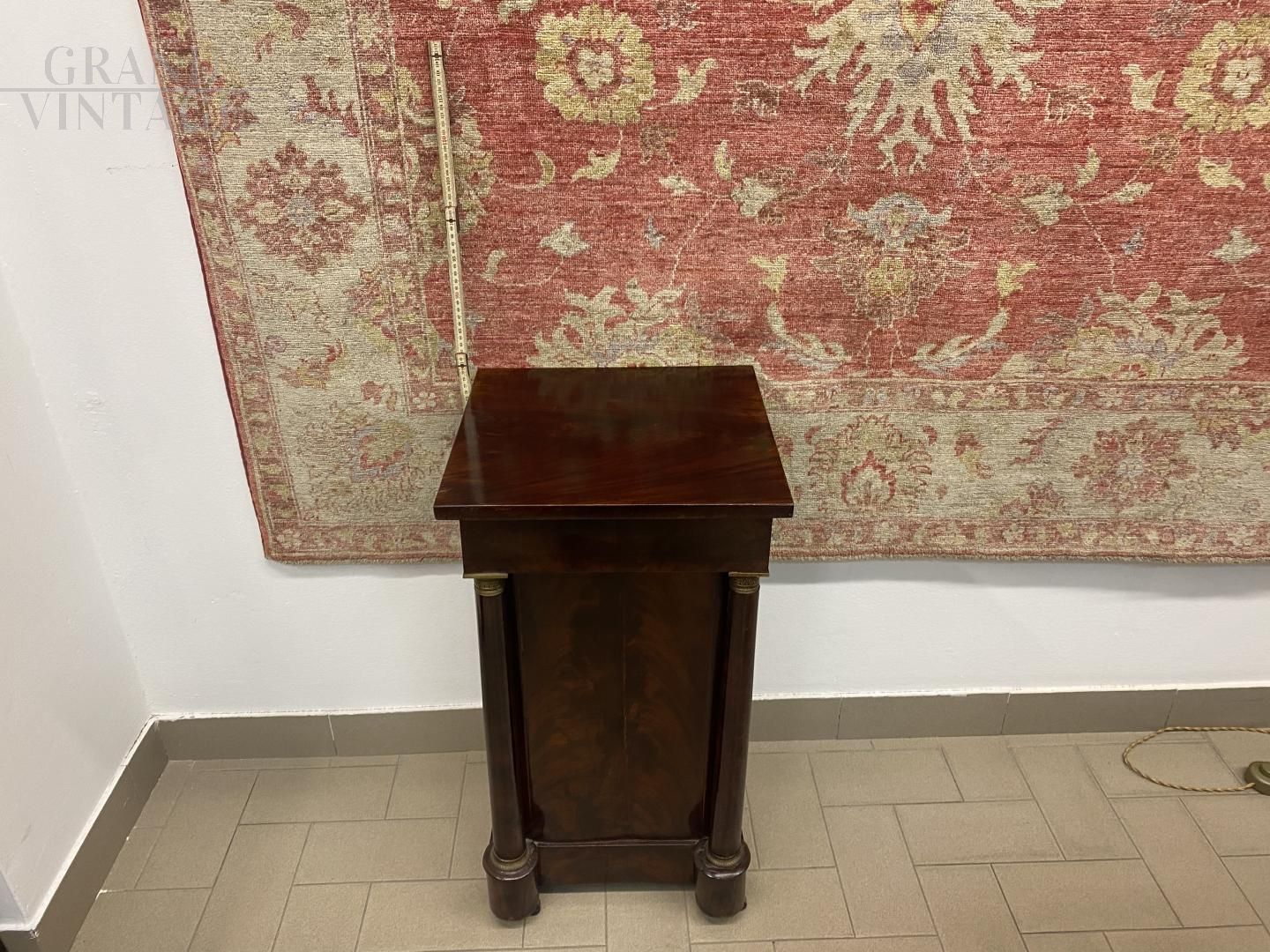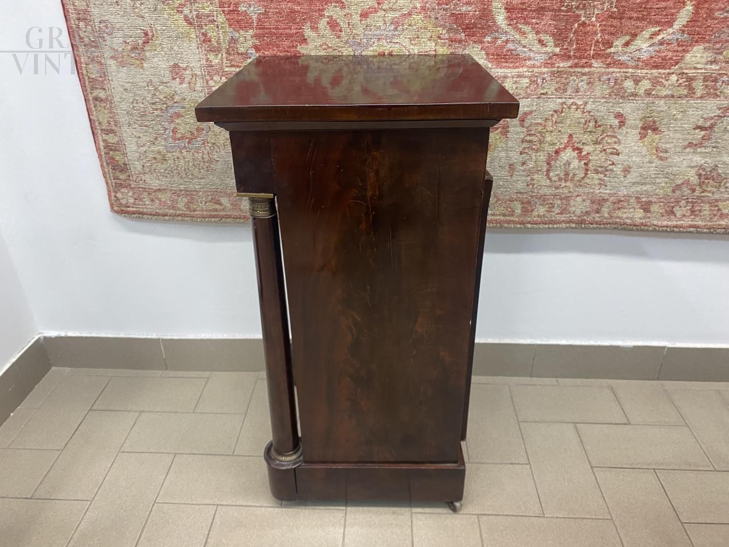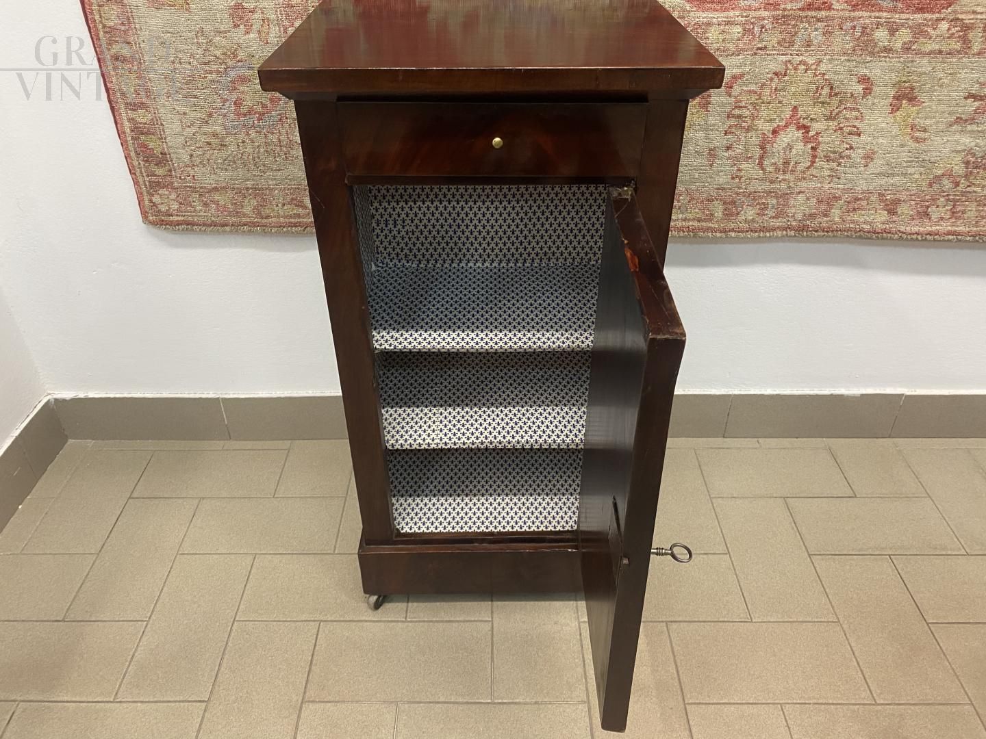 Raro comodino da centro antico di epoca Impero con colonne, cassetto e antina, completamente realizzato in piuma di mogano su tutti i lati, comprese le colonnine. Francia, XIX secolo. Comodino in ottime condizioni, serrature e chiavi originali dell’epoca. Particolarità: le rotelline per poter spostare senza sforzo questa sfiziosità di mobiletto.