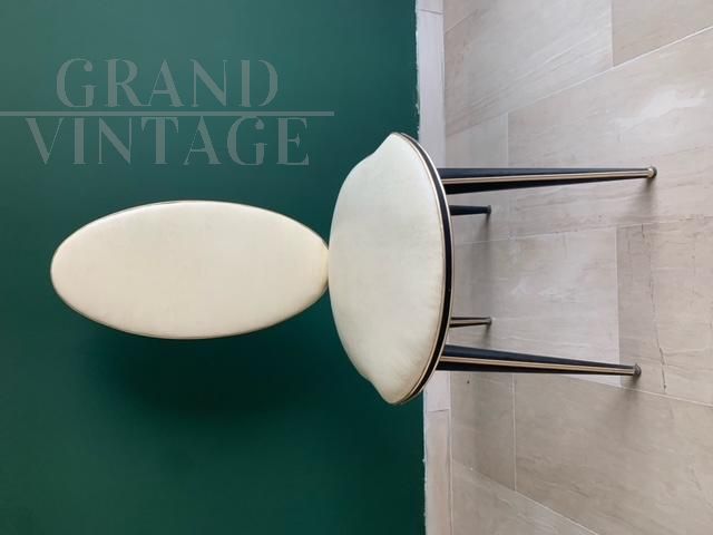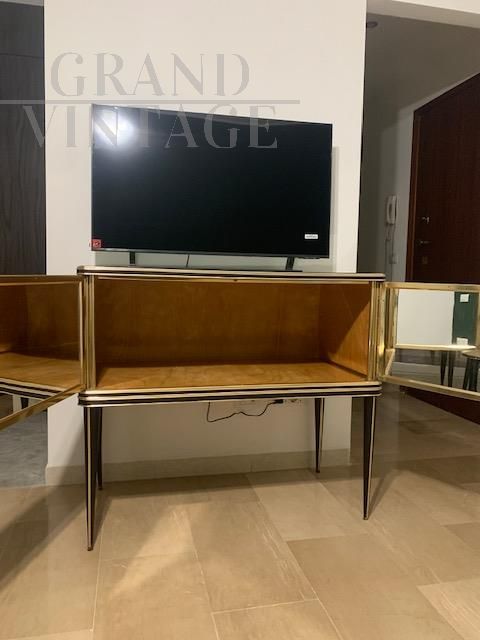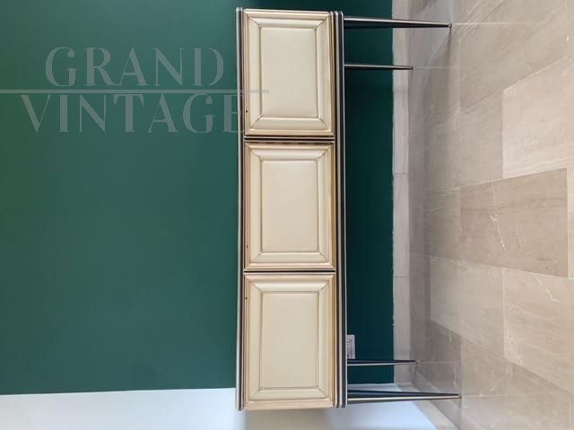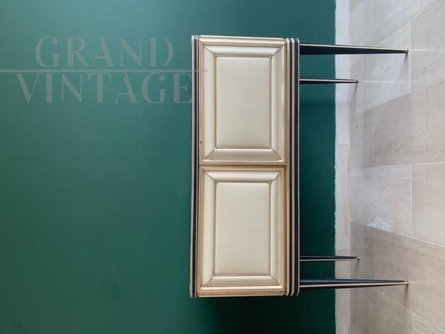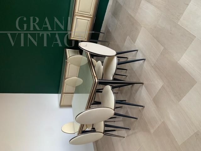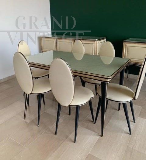 Complete living room designed by the architect Umberto Mascagni for Harrods, consisting of a table with a green glass top measuring 140 x 80 cm, 6 cream white skai chairs, a sideboard and a cream white wooden bar cabinet with green glass tops. The sideboard has mirrored interiors. Width of the sideboard 160 cm, width of the bar cabinet 110 cm.