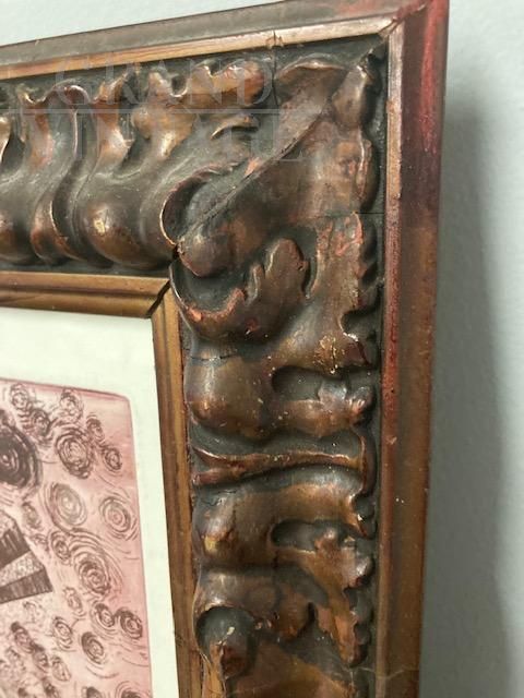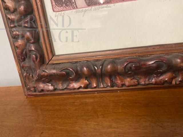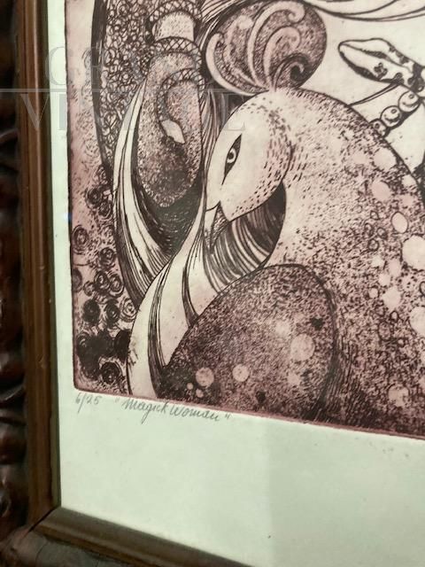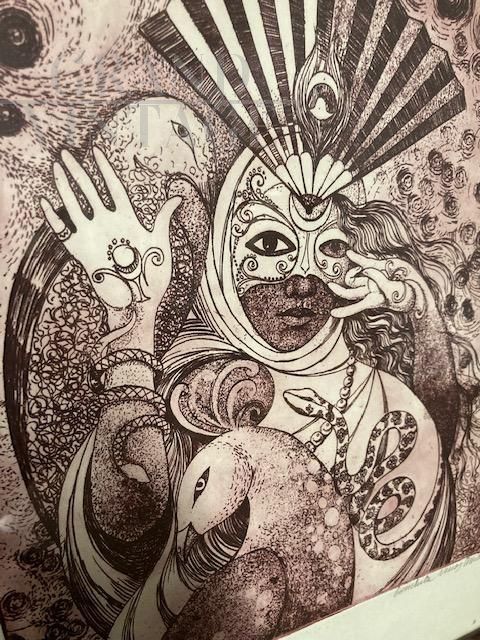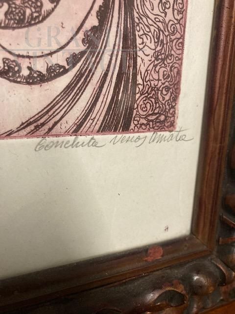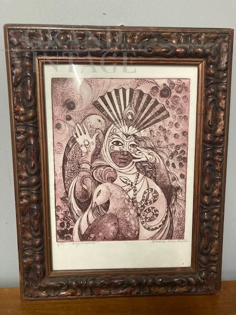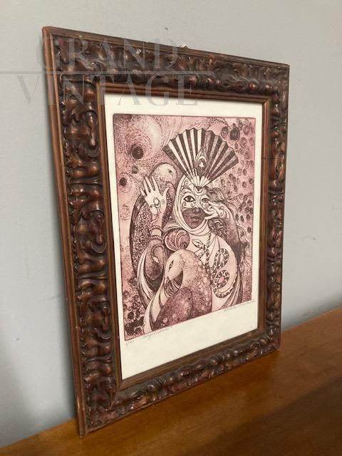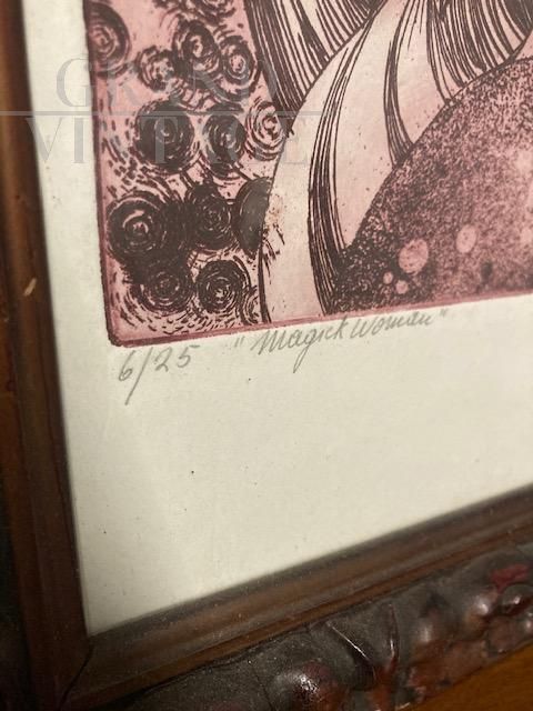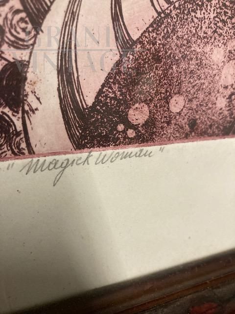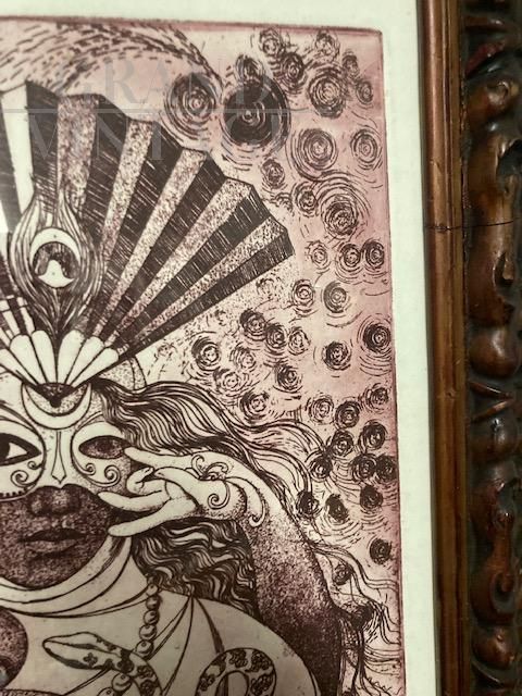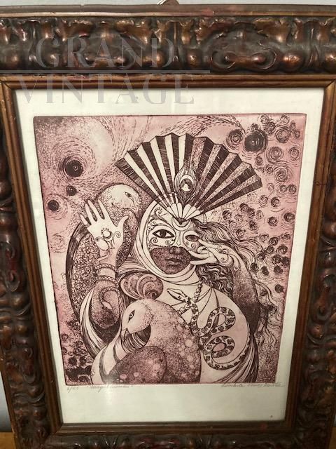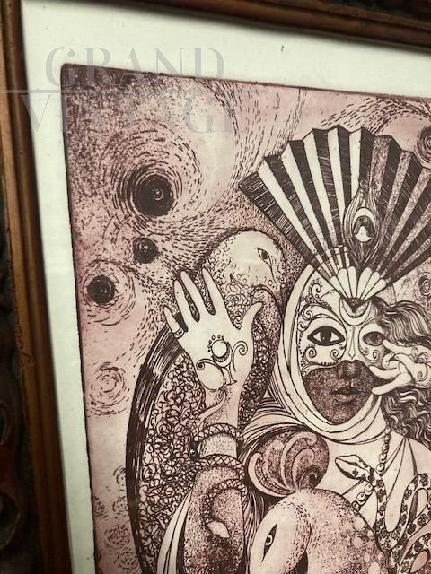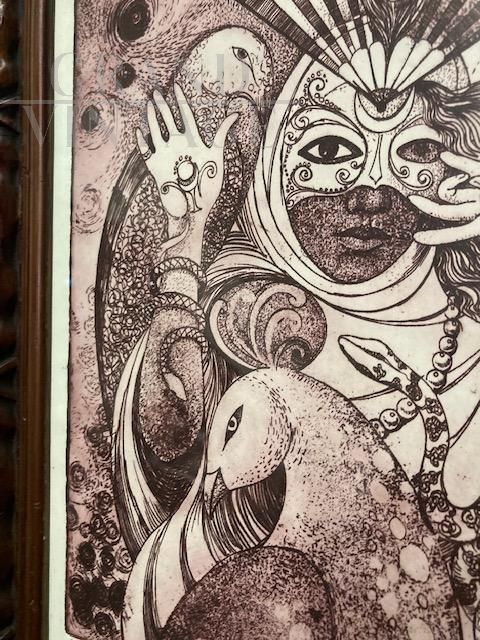Engraving of a masked woman with birds and snake signed Conchita, contemporary art of the 20th century, in amaranth colour.