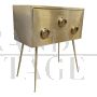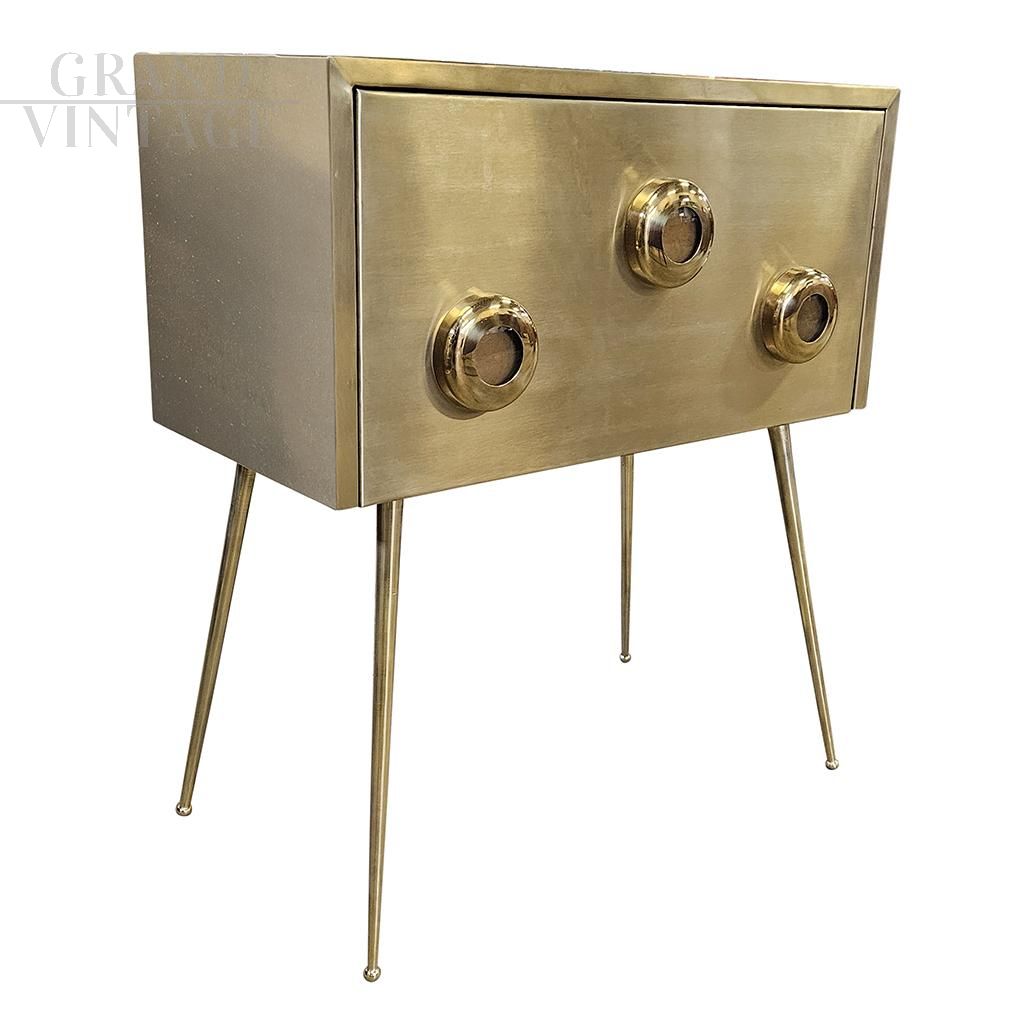 Console entirely handmade, with wooden structure, covered with a brass sheet; a drawer with elegant amber glass inserts.