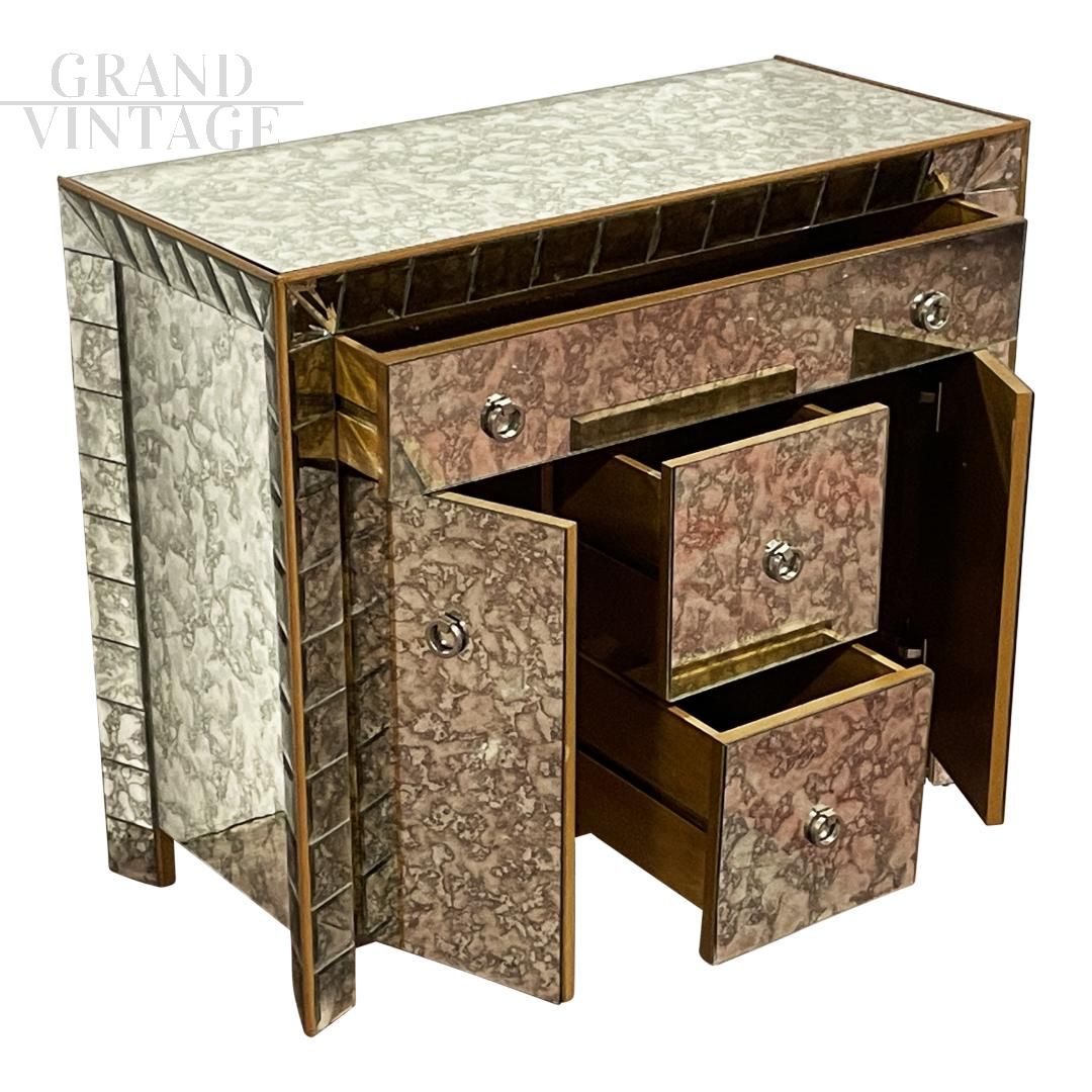 Storage unit cabinet with two doors and three drawers, with wooden structure entirely covered in smoked mirror and brass profiles. Italy, late 20th century.
